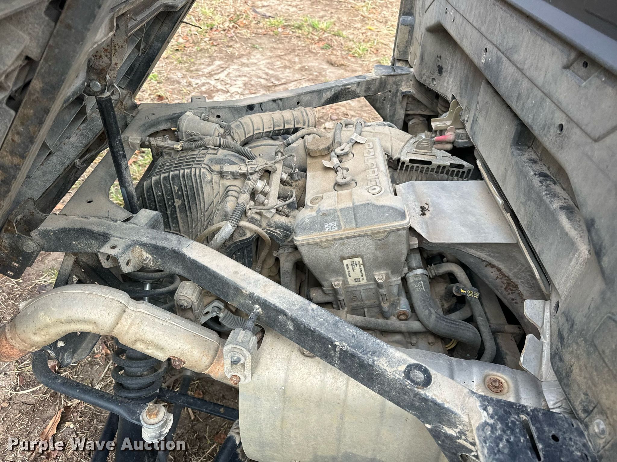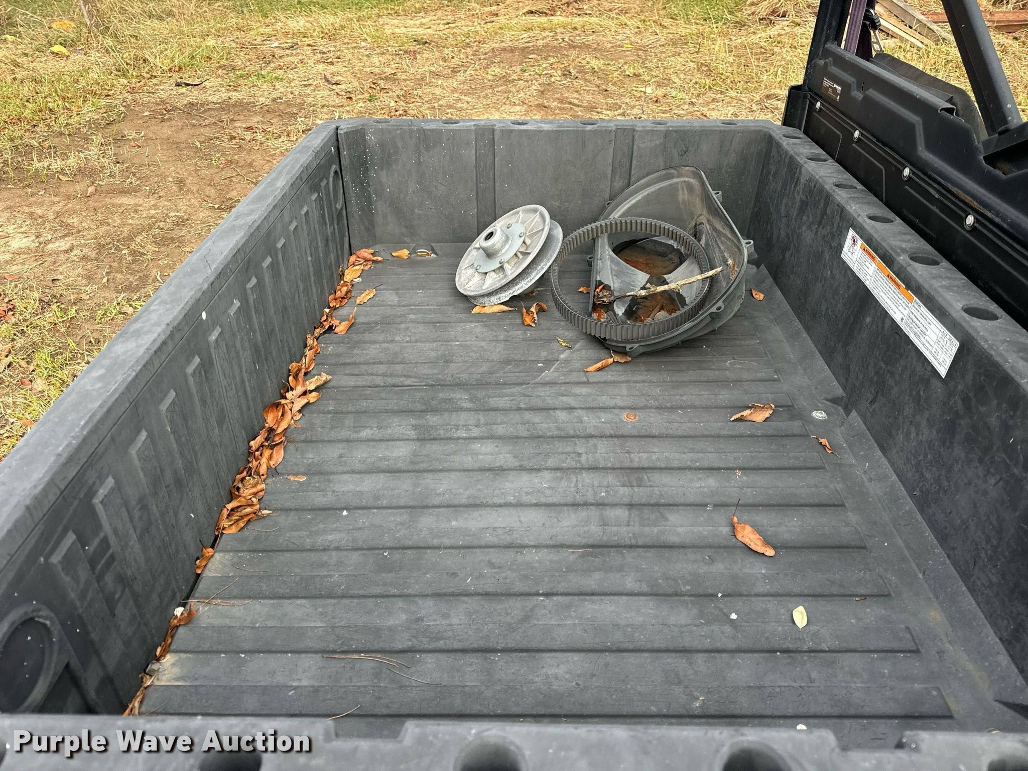 2014 Polaris Ranger utility vehicle. Hours: Unknown, VIN: 4XAUH88A2EB172989. Engine Displacement: 875 cc, Cylinders: 2, Fuel type: Gas, Electric start. Transmission Automatic. Chassis Four wheel drive/ All wheel drive. Operators station Canopy. Features Grille guard, Receiver hitch, Dump bed 41" L x 59" W, Dump bed type: Manual. Tires Front: 25x10.00-12, Rear: 25x11.00-12. Notes Parts removed, Contents in bed included, Non-operational unit. Transfer of ownership documentation will be a bill of sale. Princeville, IL 61559