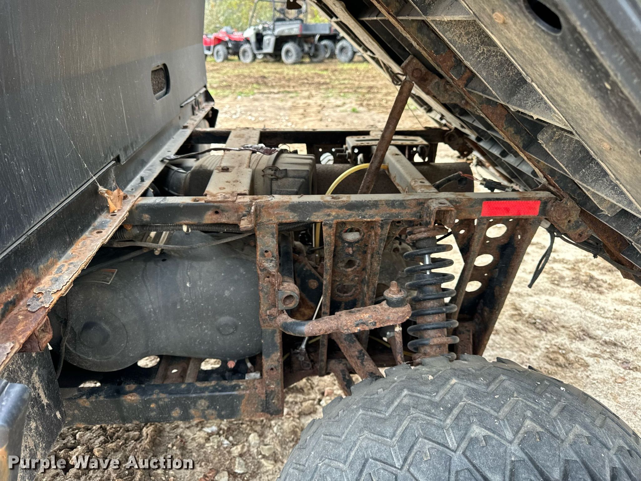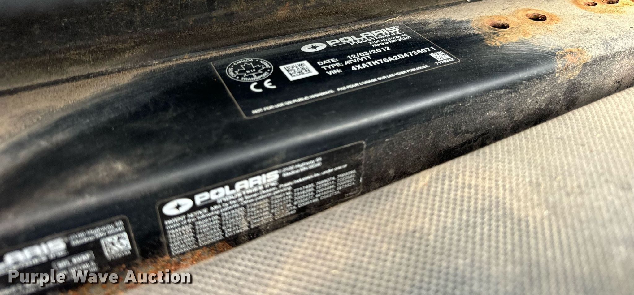 2013 Polaris Ranger 800 utility vehicle. Hours: Unknown, VIN: 4XATH76A2D4736071. Engine Displacement: 760 cc, Cylinders: 2, Fuel type: Gas, Electric start. Transmission Automatic. Chassis Four wheel drive/ All wheel drive. Operators station Enclosed cab, Heat. Features Grille guard, Receiver hitch, Dump bed 41" L x 59" W, Dump bed type: Manual. Tires Front: 25x9.00-12, Rear: 25x10.50-12. Notes Non-operational unit. Transfer of ownership documentation will be a bill of sale. Princeville, IL 61559