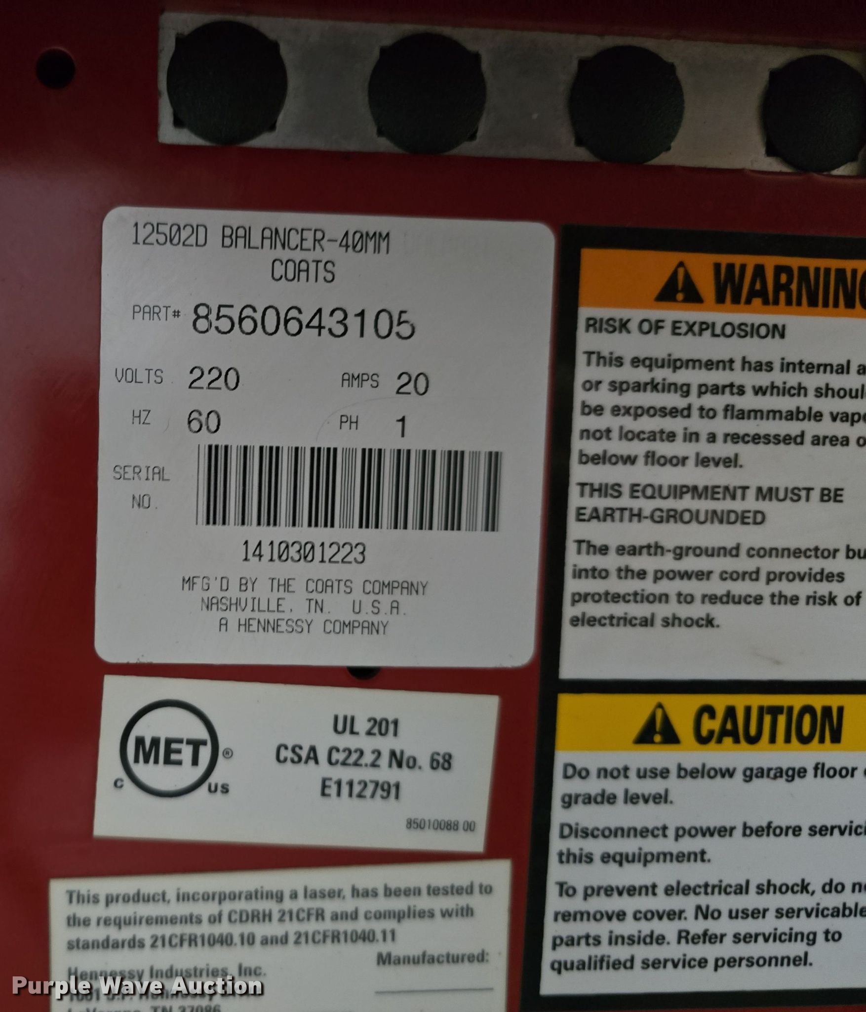 Coats 1250 Direct-Drive tire balancer. Serial: 8560643105, Volts: 220, Phase: Single, Balancer cones, Width gauge. Nebraska Commercial Equipment. Papillion, NE 68046