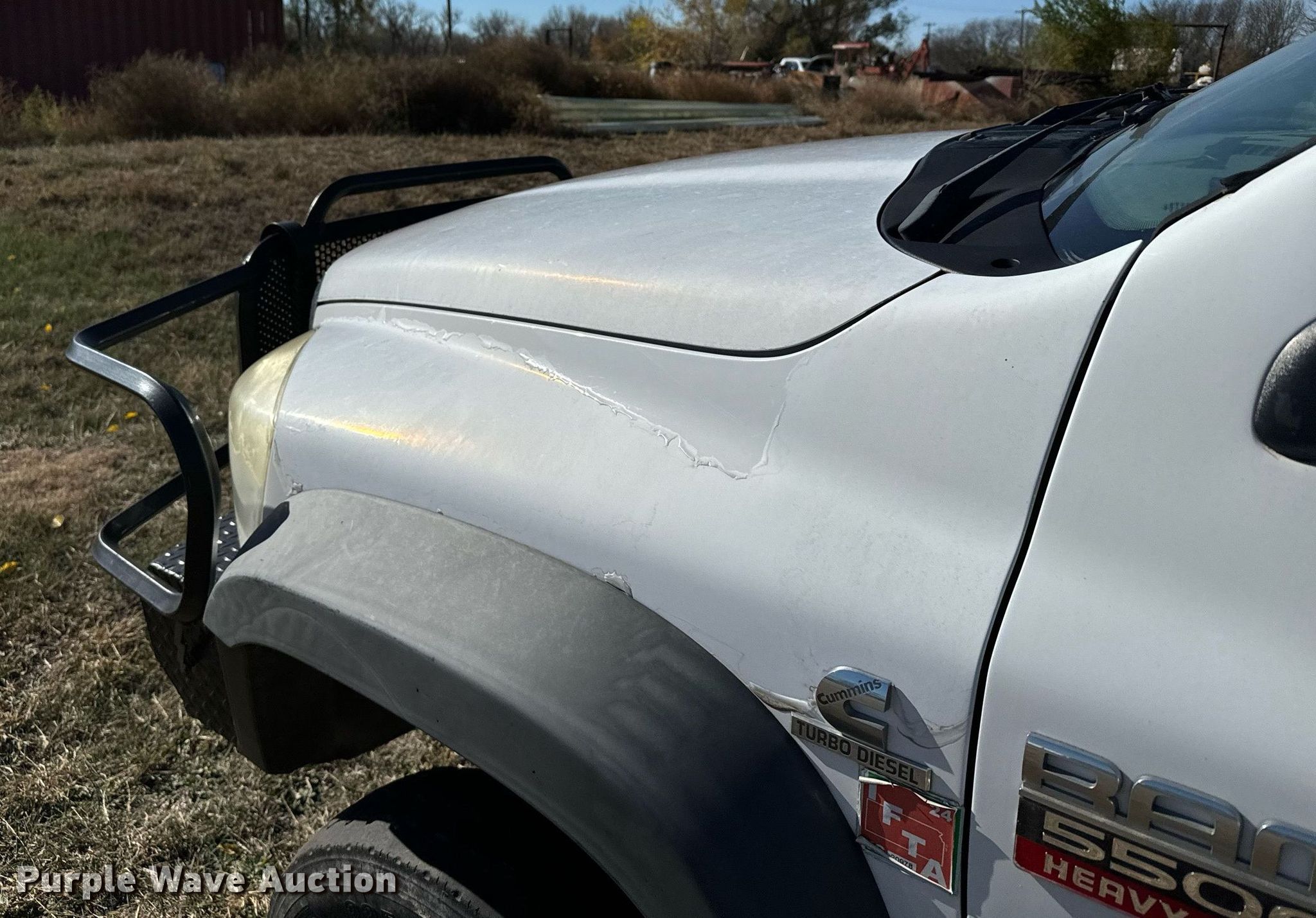 2008 Dodge Ram 5500HD Quad Cab flatbed truck. Miles: 91,335 on odometer, VIN: 3D6WD78A38G210307. Engine Cummins, Displacement: 6.7L, Cylinders: 6, Fuel type: Diesel. Transmission Automatic. Chassis Four wheel drive, Axles: Single, Suspension: Spring, Brakes: Hydraulic, GVWR: 19,500 lbs. Interior AC, Heat, Heated mirrors, Power windows, Power locks, Cruise control. Features Flatbed 11' L x 92" W. Tires Size: 225/70R19.5. Notes Dash warning indicator: Check engine, Windshield chipped or cracked, Hail damage. Kansas title. Title distribution may be delayed up to 14 days from verification of funds. Midwest Contractors. Hill City, KS 67642