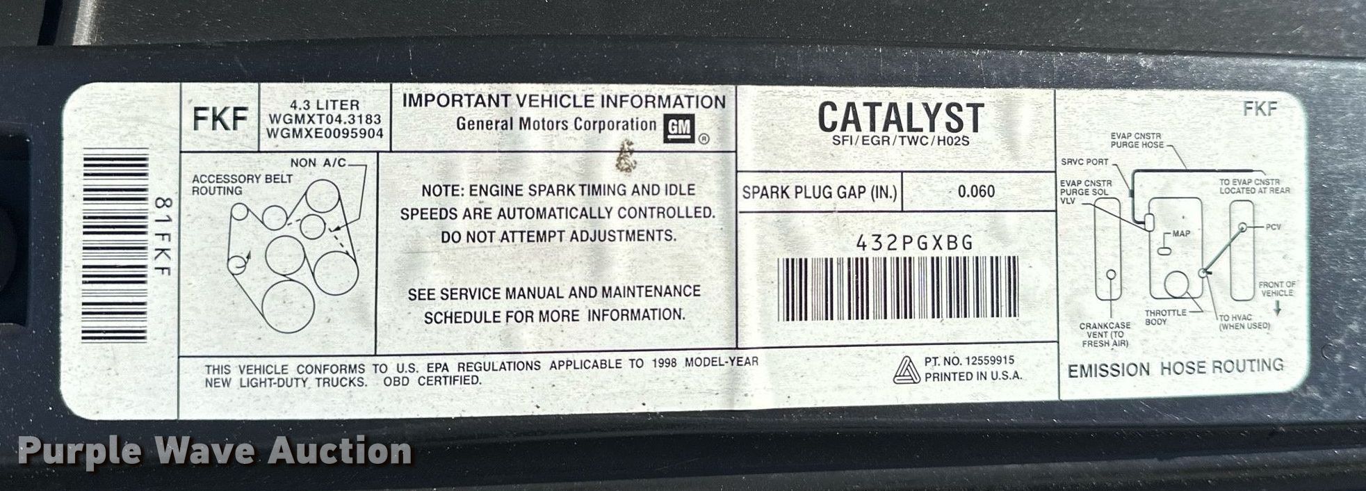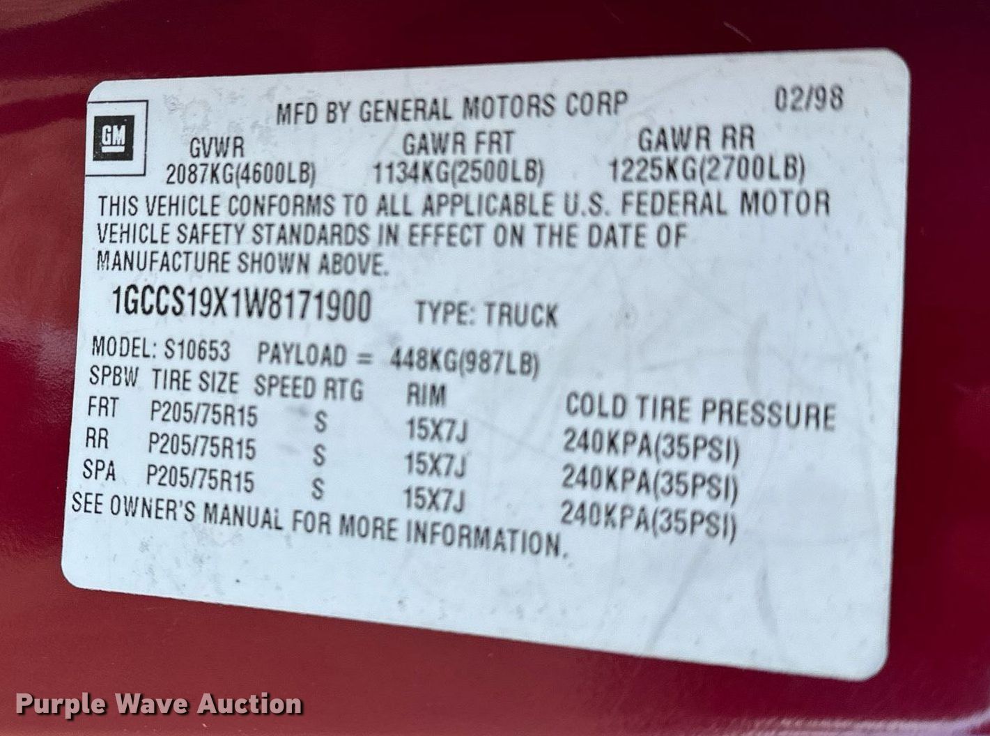Purple Wave is selling a used Compact Pickup or Van in Oklahoma. This item is a 1998 Chevrolet S10 Ext. Cab pickup truck with the following: Miles: 93,311 on odometer, VIN: 1GCCS19X1W8171900