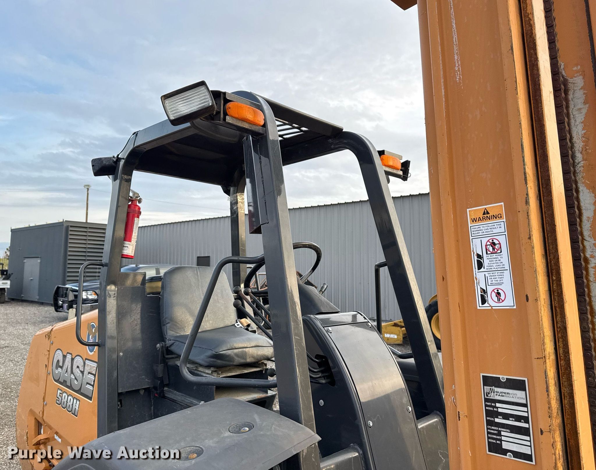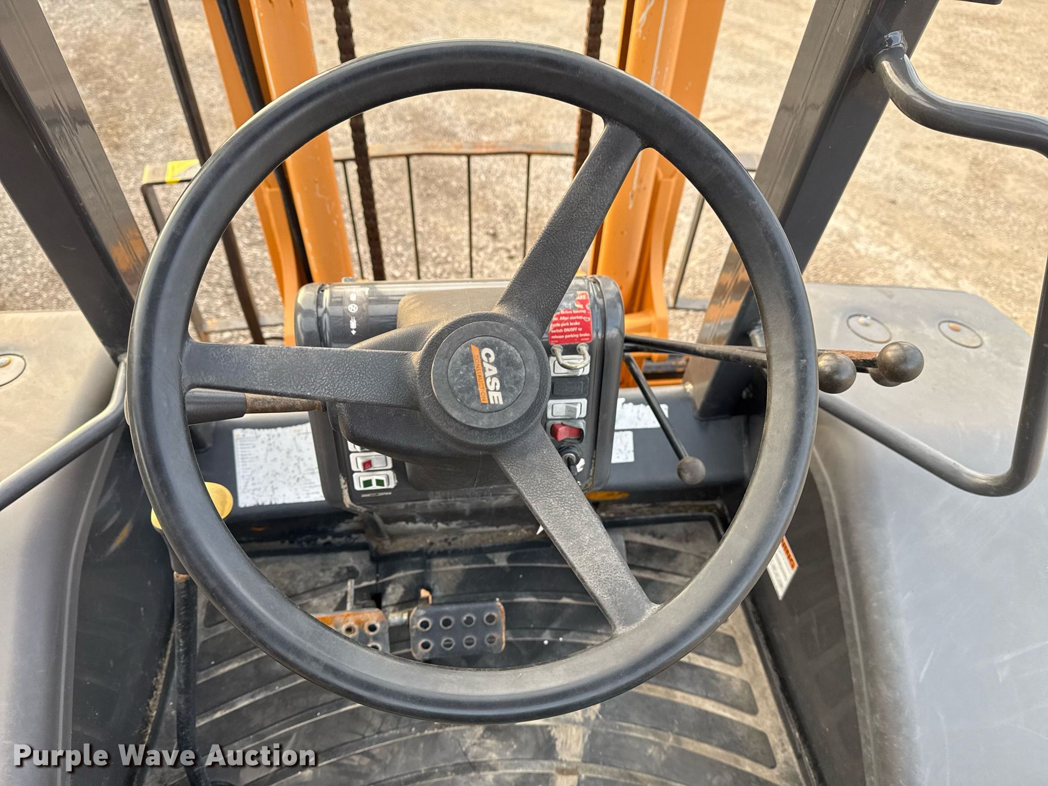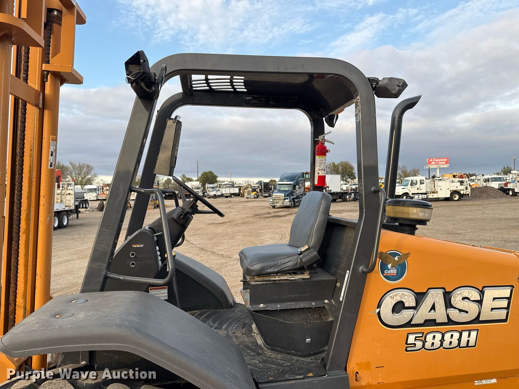 2014 Case 588H forklift. Hours: 3,727 on meter, Serial: JJGN580HAEC715393. Engine Case, Cylinders: 4, Fuel type: Diesel. Transmission Shuttle shift, 4F - 4R. Features Maximum lift capacity: 6,000 lbs, Maximum lift height: 180", Mast stages: 1, Side shift, Fork length: 50". Tires Front: 19.5L-24, Rear: 12-16.5. Collinsville, OK 74021