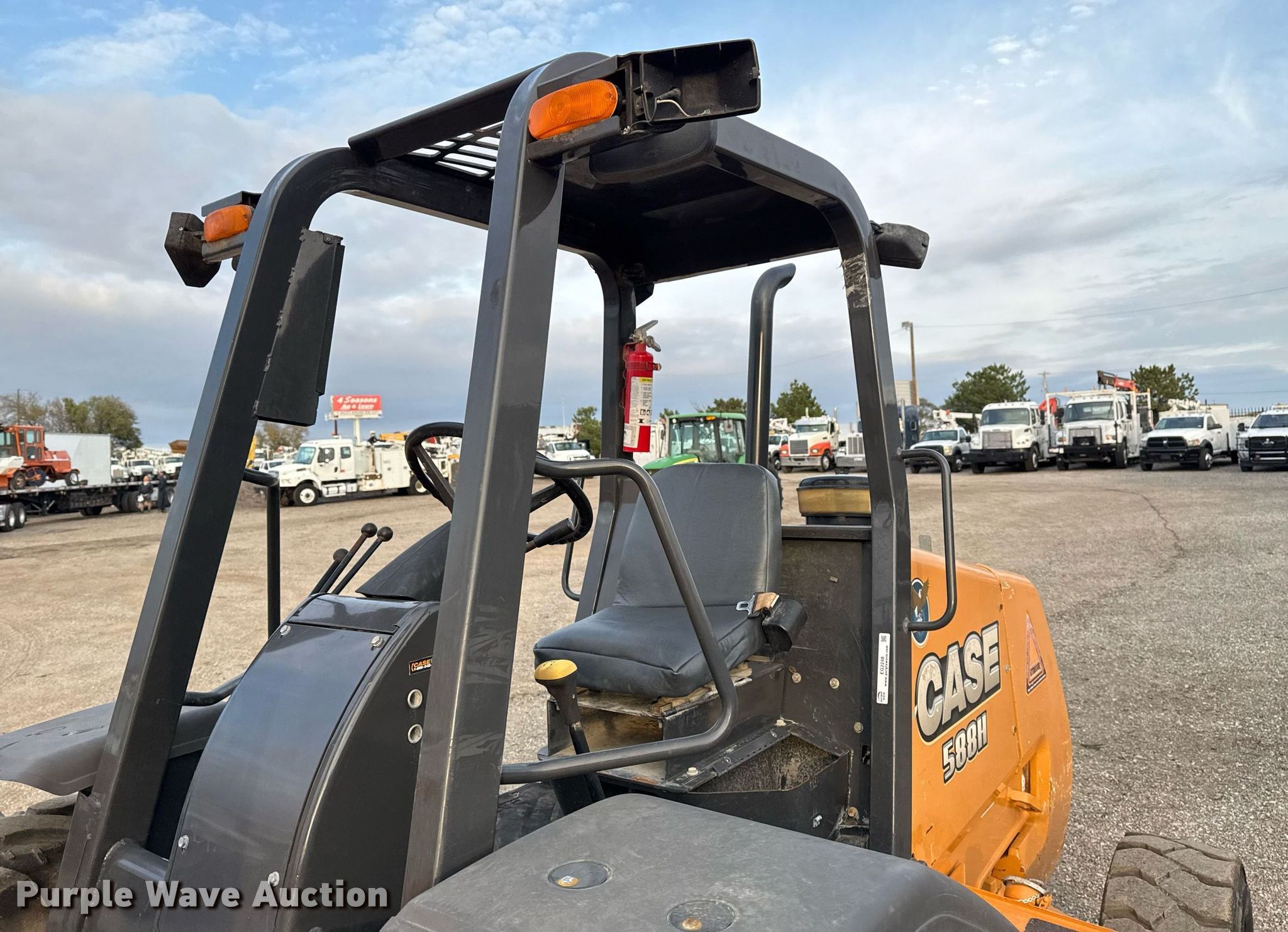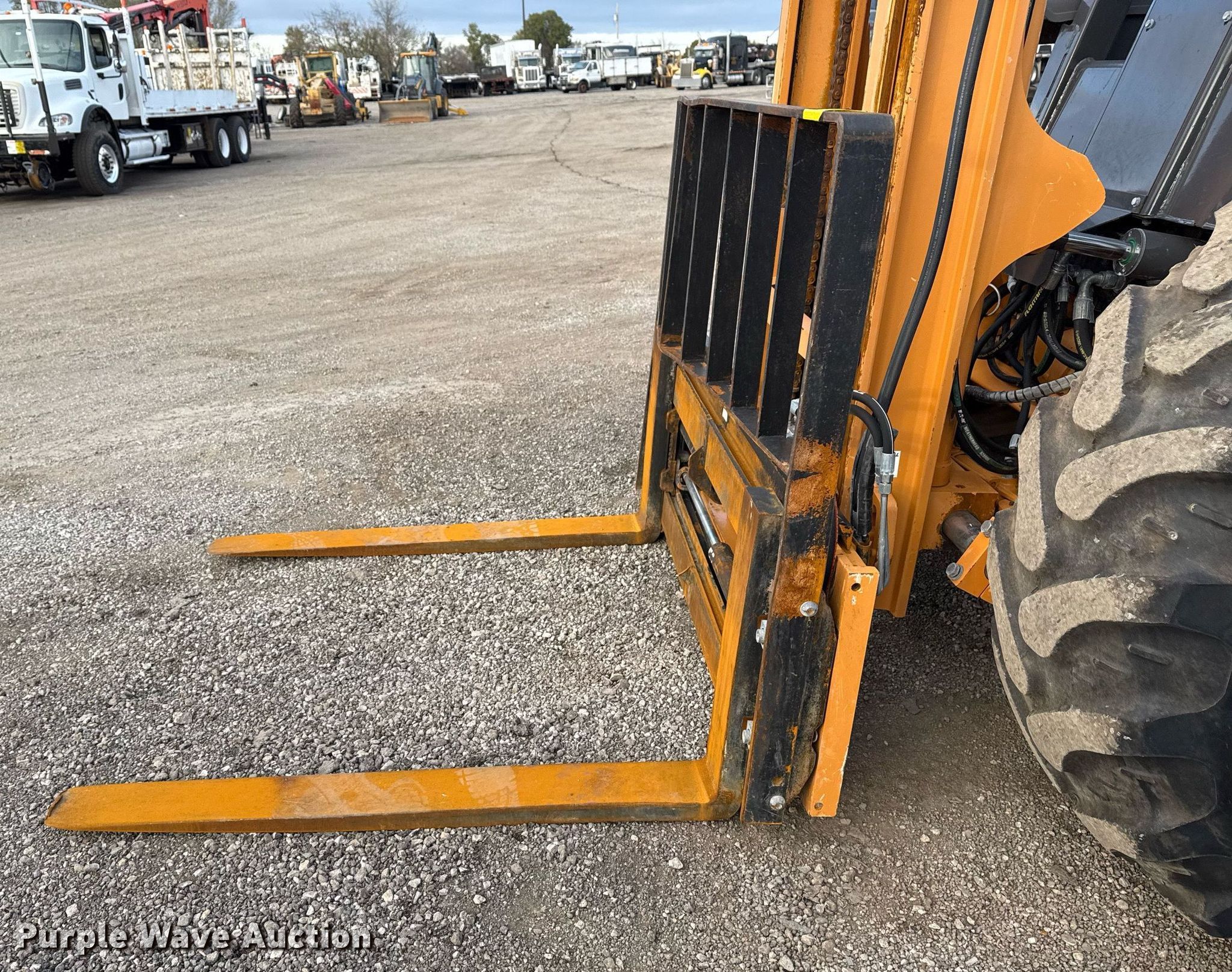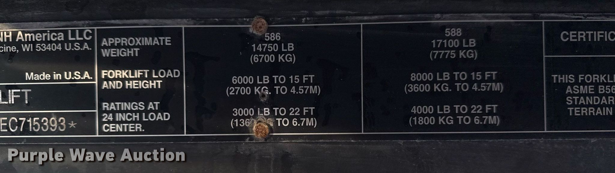2014 Case 588H forklift. Hours: 3,727 on meter, Serial: JJGN580HAEC715393. Engine Case, Cylinders: 4, Fuel type: Diesel. Transmission Shuttle shift, 4F - 4R. Features Maximum lift capacity: 6,000 lbs, Maximum lift height: 180", Mast stages: 1, Side shift, Fork length: 50". Tires Front: 19.5L-24, Rear: 12-16.5. Collinsville, OK 74021