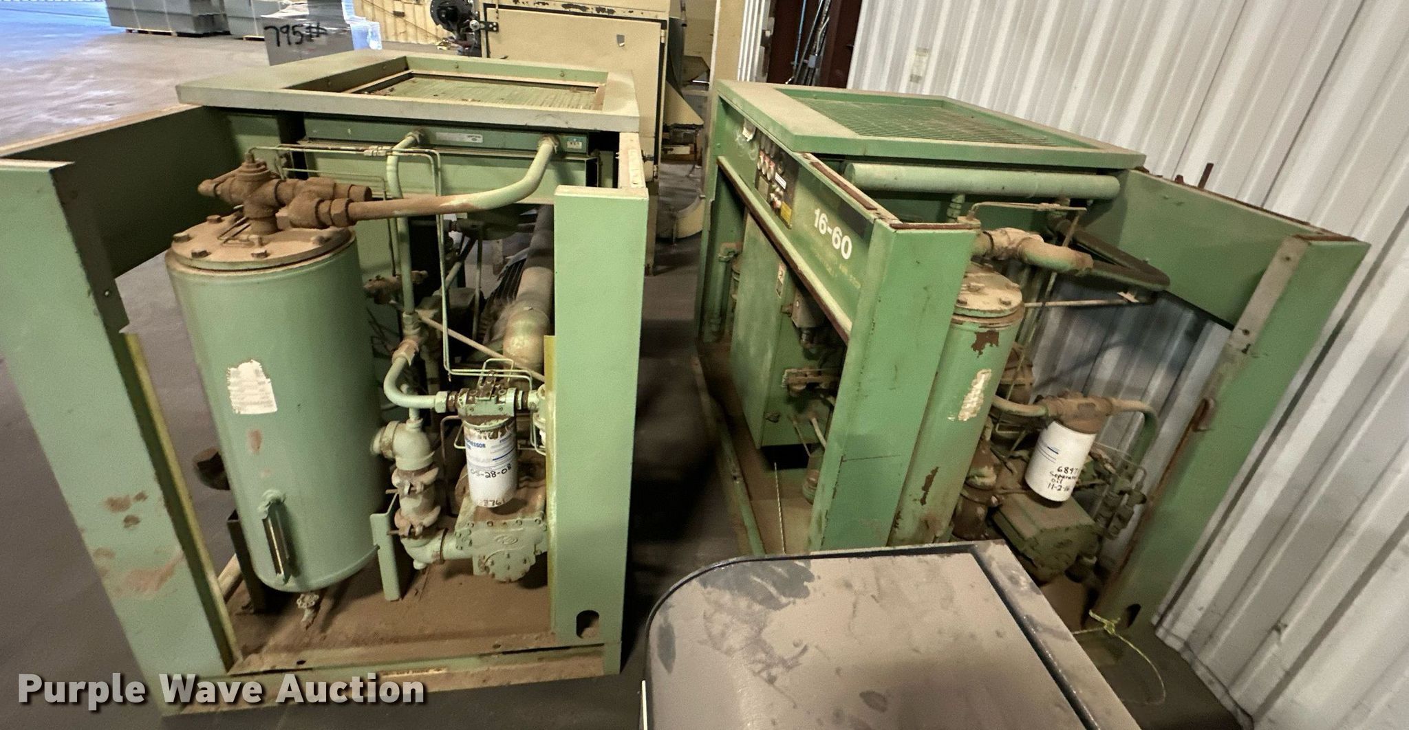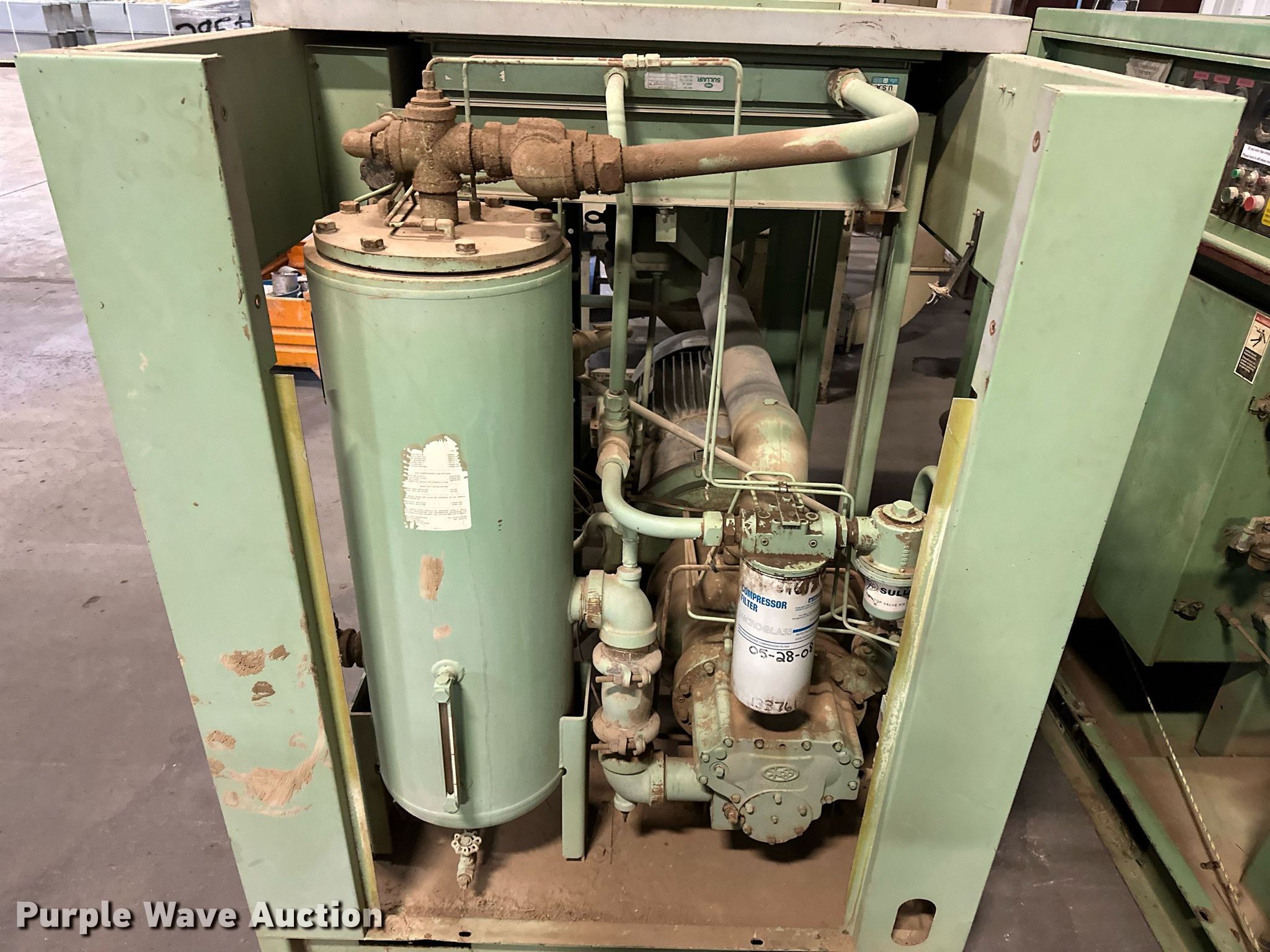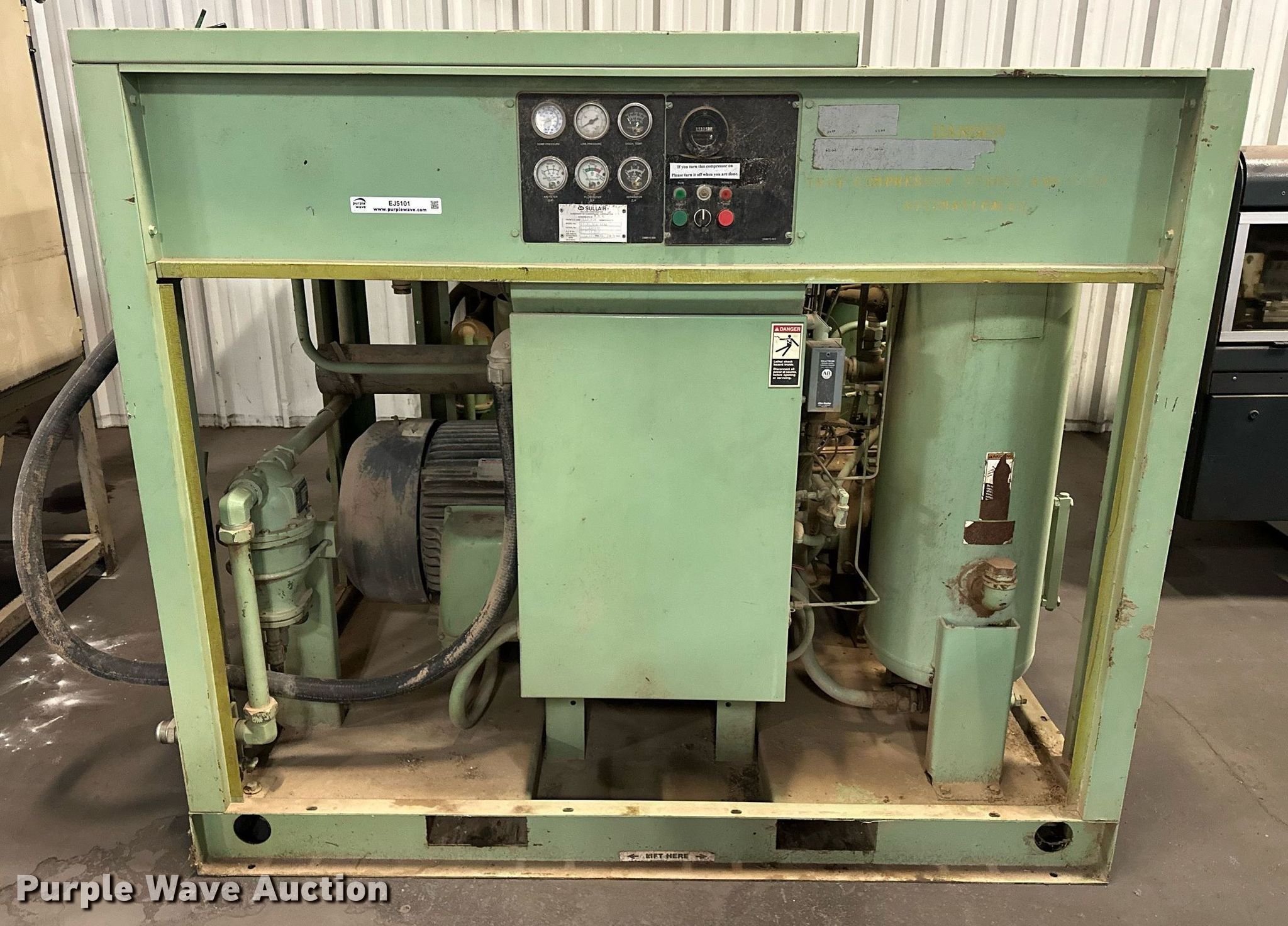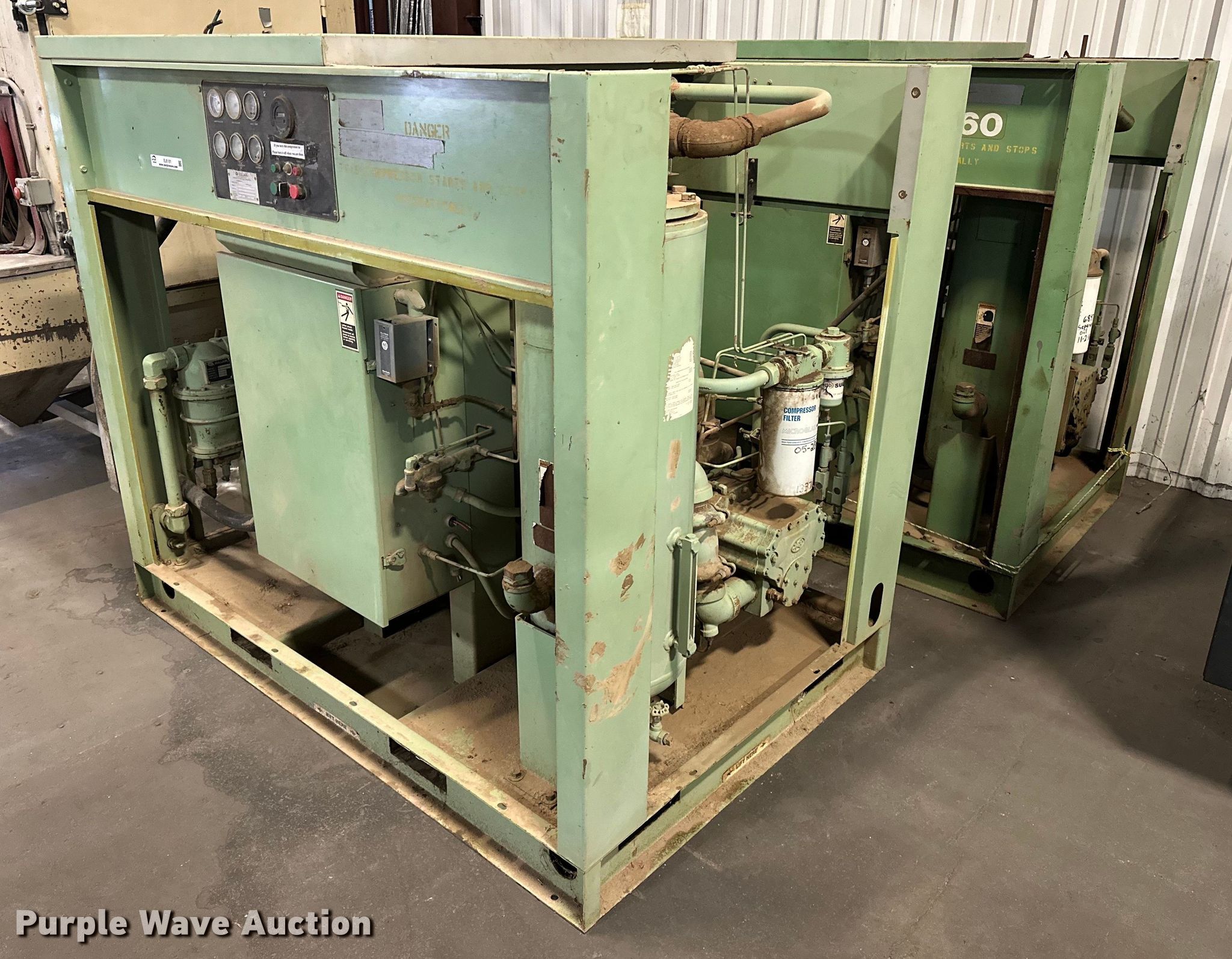 Purple Wave is selling a used Air Compressor in Oklahoma. This item is a (2) Sullair air compressors with the following: Hours: 21,529 on meter, Serial: 003-100338