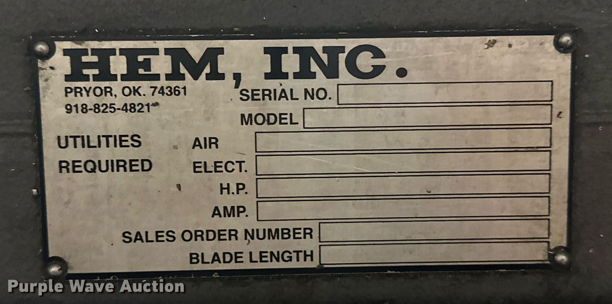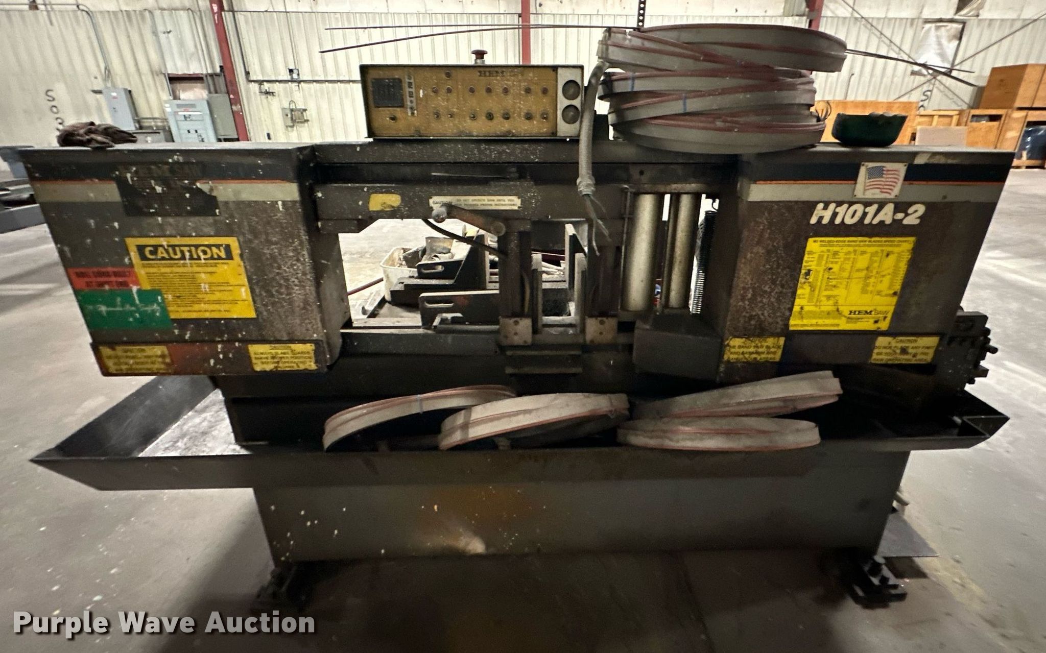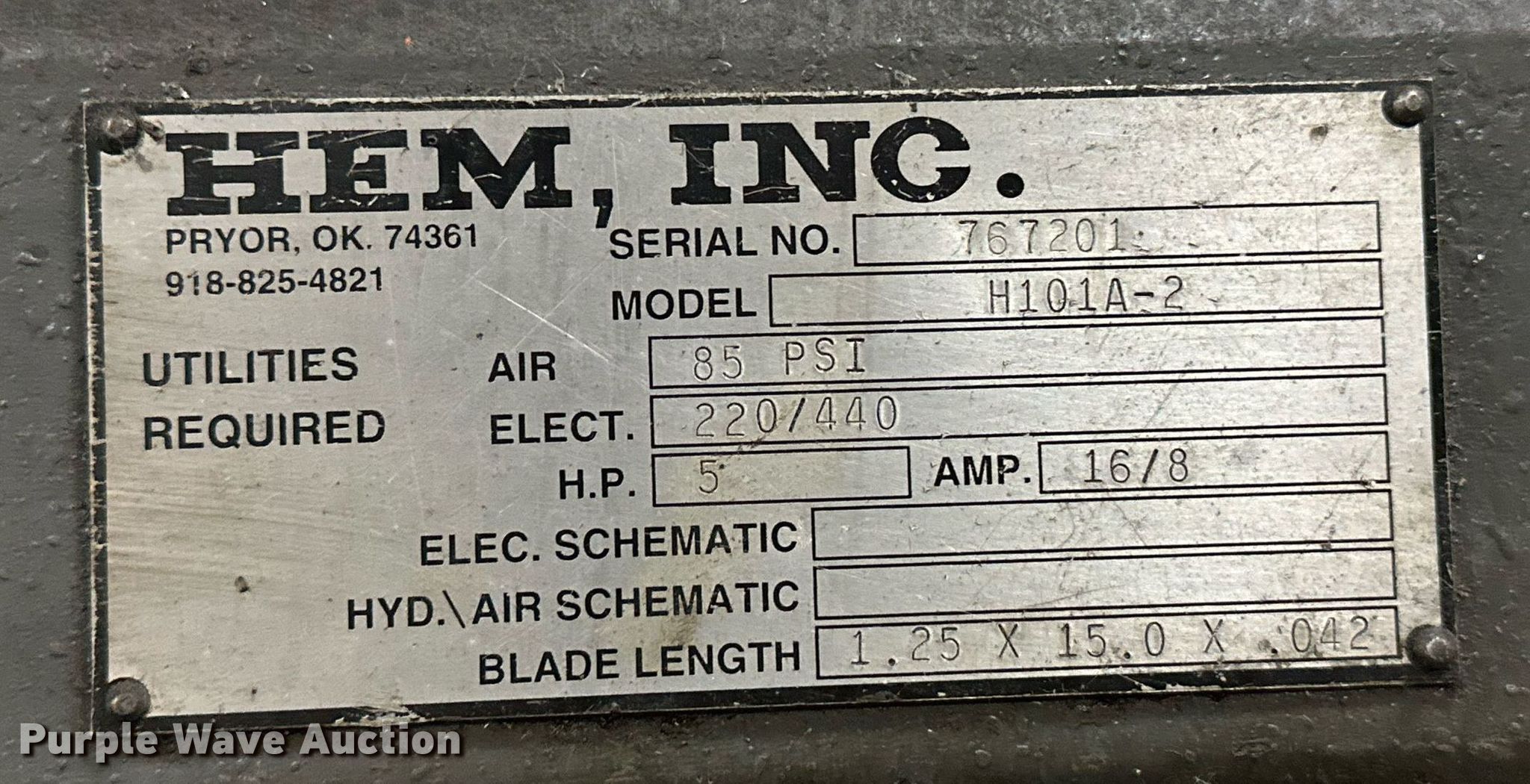 (2) bandsaws. Hem H105-LA-4 bandsaw. Serial: 767201. Electric Motor Baldor Reliancer Serial: F1101072410, HP: 7, Volts: 208-230/460, Phase: Three. Features Roller table Length: 10', Max cutting width: 22". Notes Unknown operating condition. HEM H101A-2 bandsaw Electric Motor Lincoln AF4P5T61B Serial: 767201, Volts: 230/460, Phase: Three. Notes Non-operational. Hunting Titan. Oklahoma City, OK 73128
