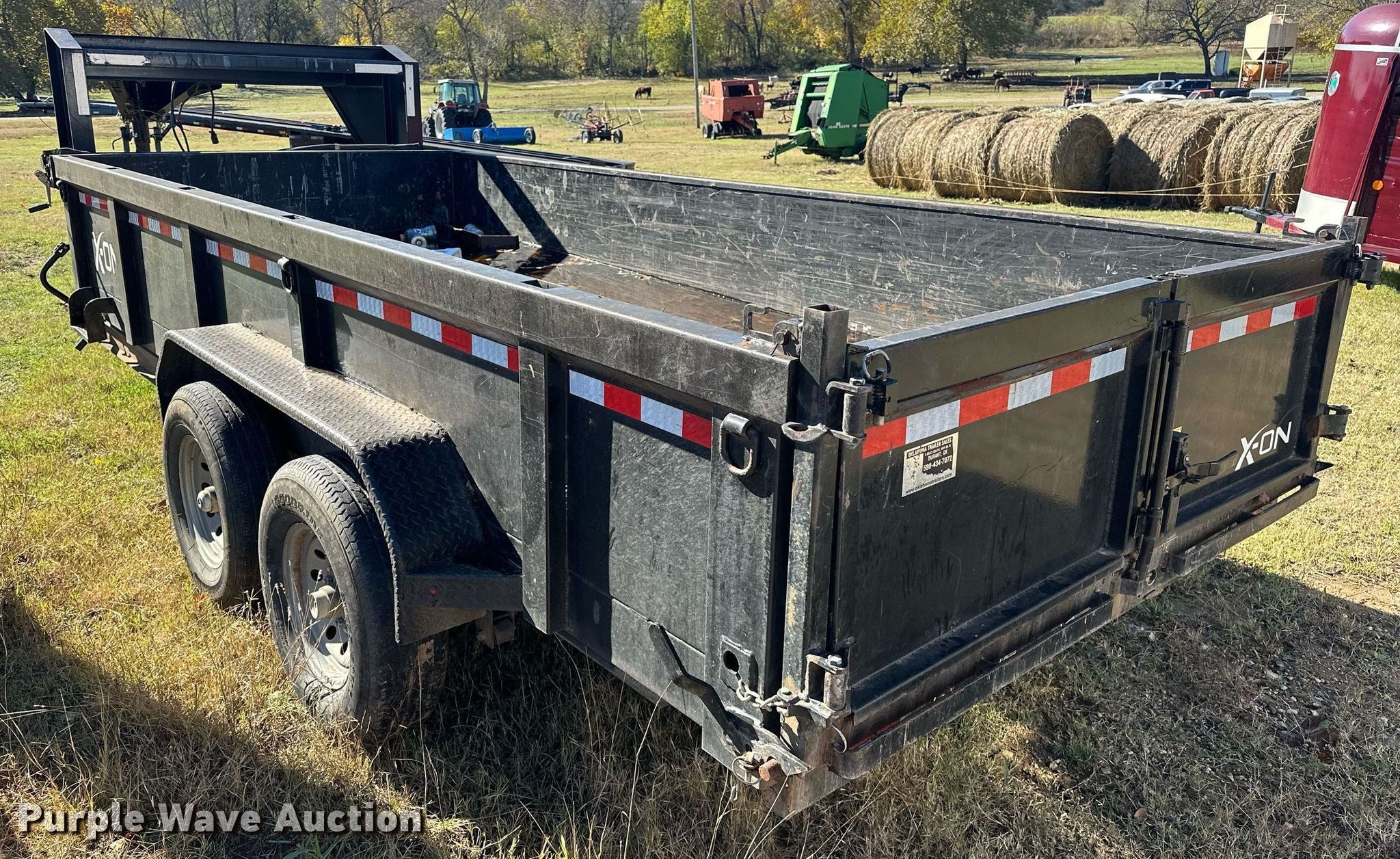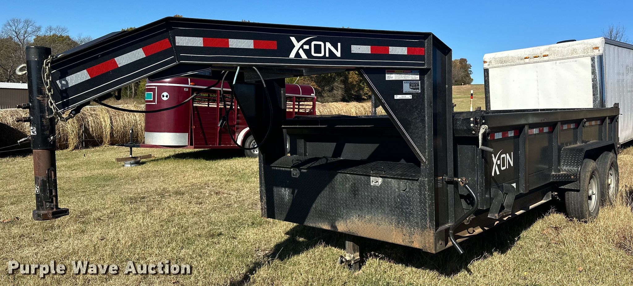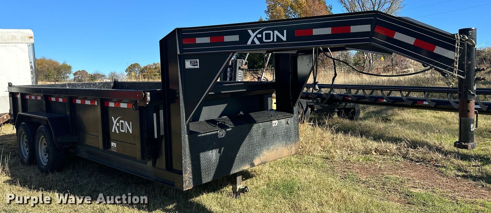 2020 X-On I6-GD831627 dump trailer. VIN: 7LEGD627XLB004154. Dimensions Overall: 25' L x 102" W, Body: 16' L x 83" W, Side height: 24". Features Body type: Steel, Ram: Single, End gate: Manual, Roll tarp. Chassis Hitch: Gooseneck, Landing gear: Single, Suspension: Spring, Brakes: Electric, Axles: Tandem, GVWR: 14,000 lbs, GAWR: 7,000 lbs. Tires Steel wheels, Size: ST235/80R16. Notes Tire sidewall damaged, needs replaced. Transfer of ownership documentation will be a bill of sale. Ada, OK 74820