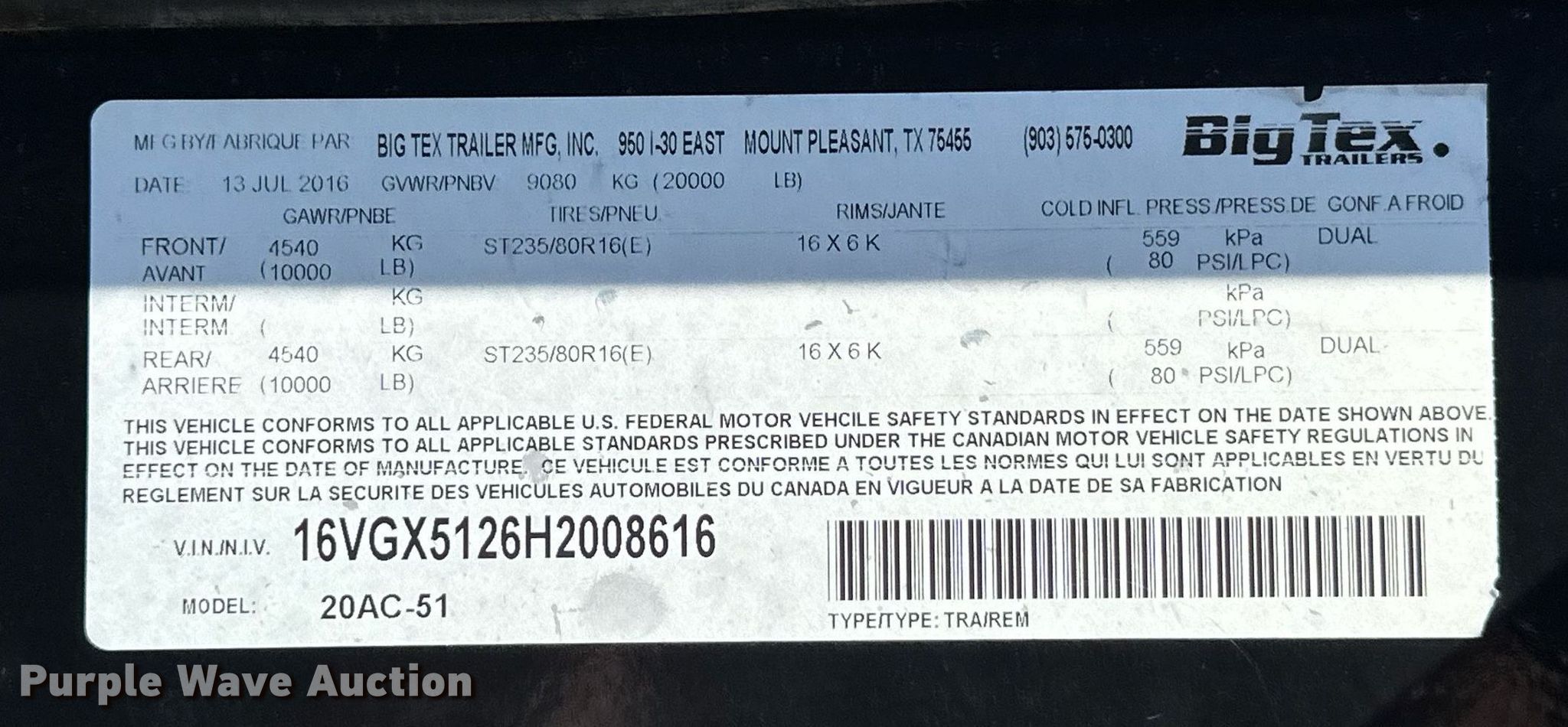 Purple Wave is selling a used Car Carrier in Oklahoma. This item is a 2017 Big Tex 20AC-51 car carrier with the following: VIN: 16VGX5126H2008616