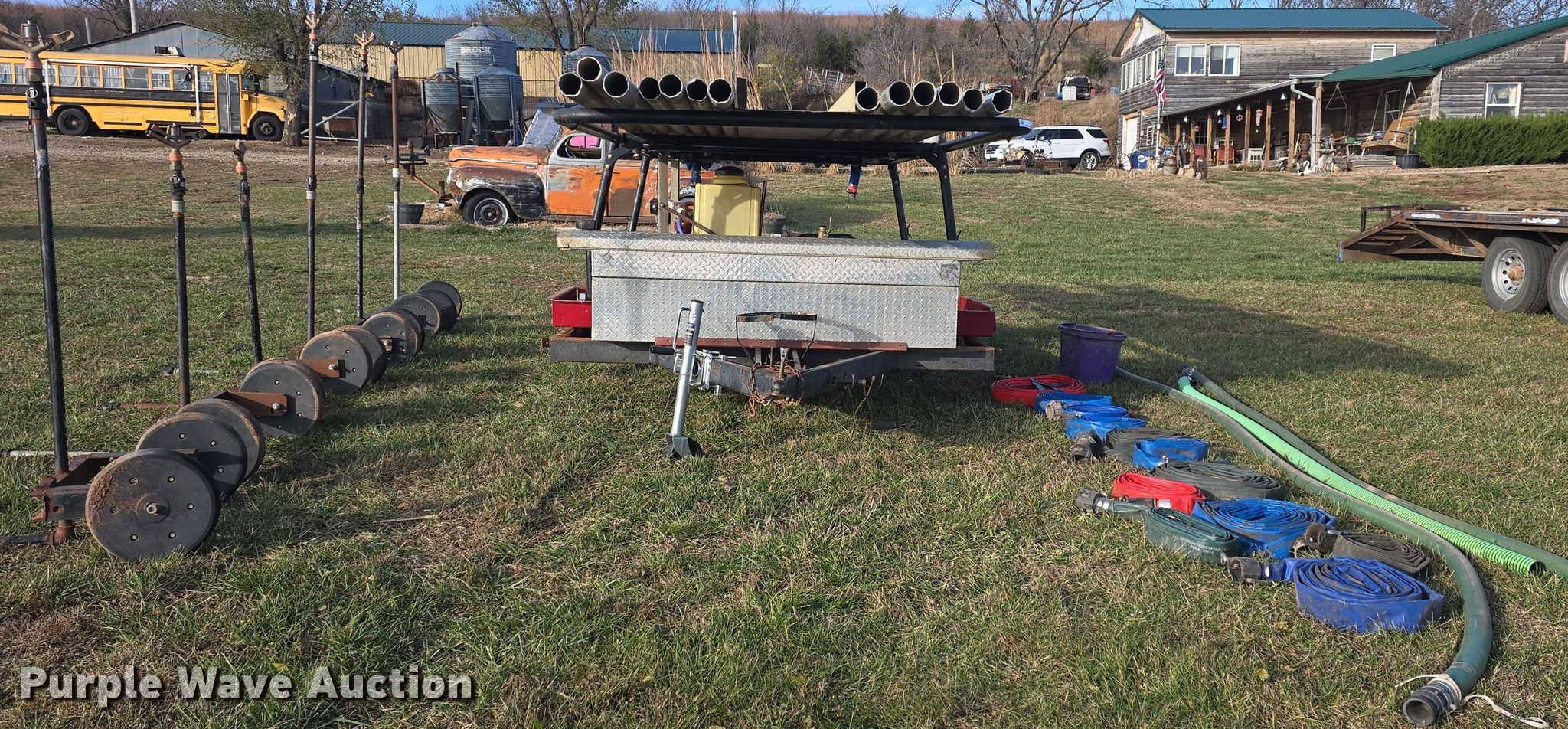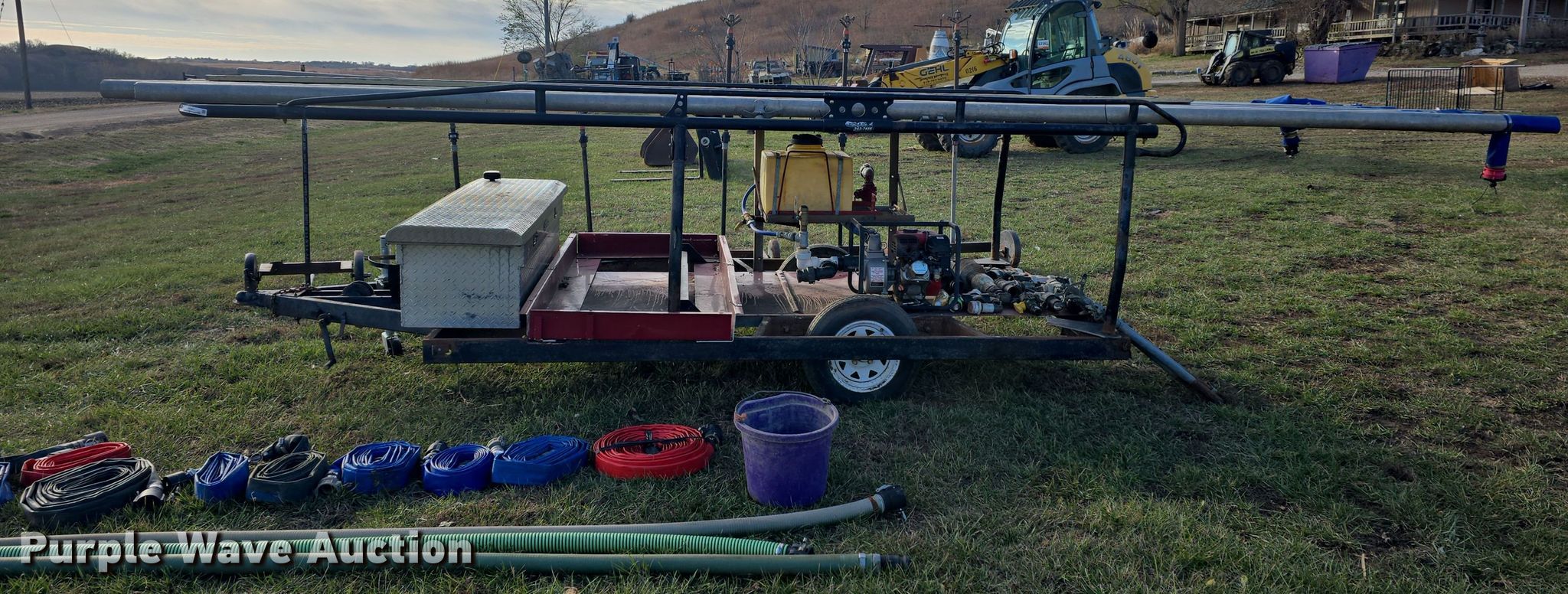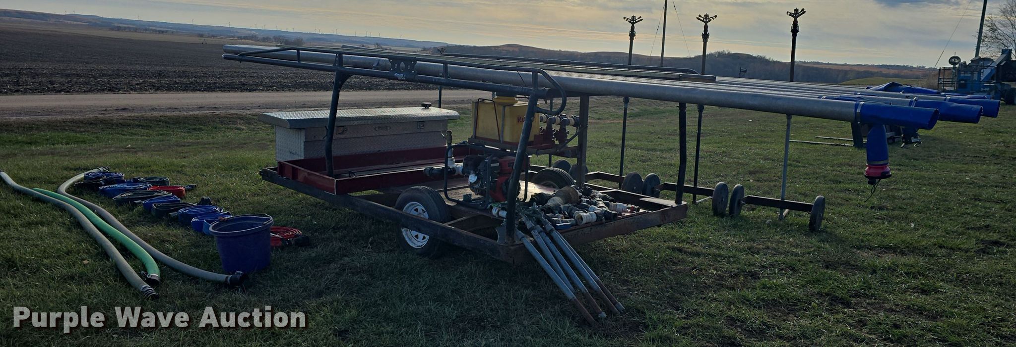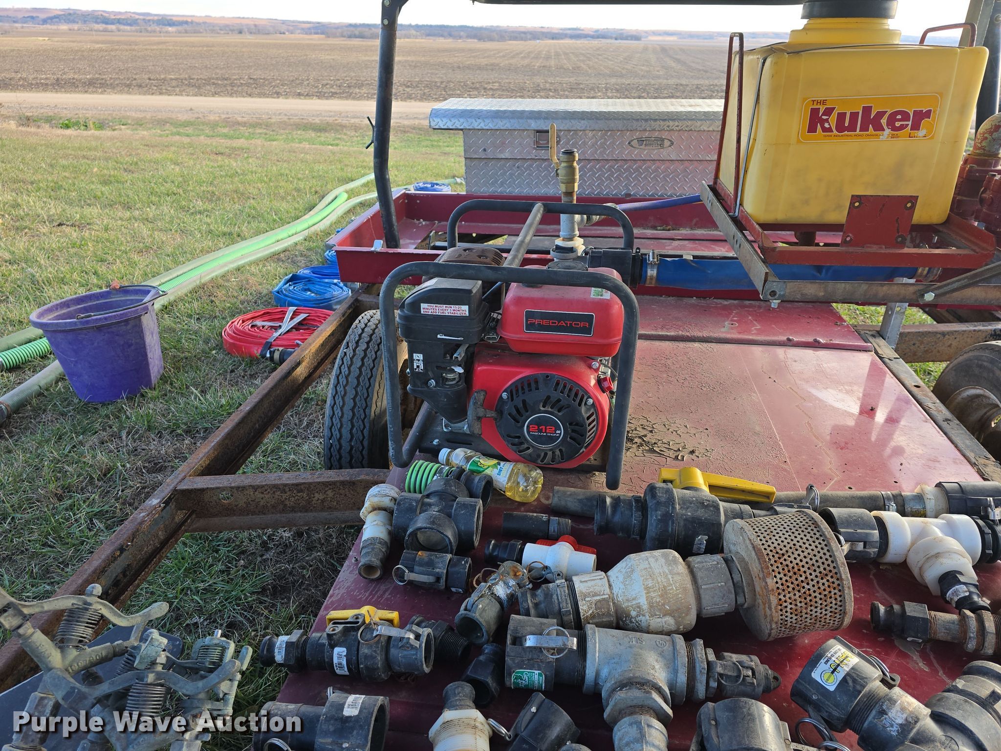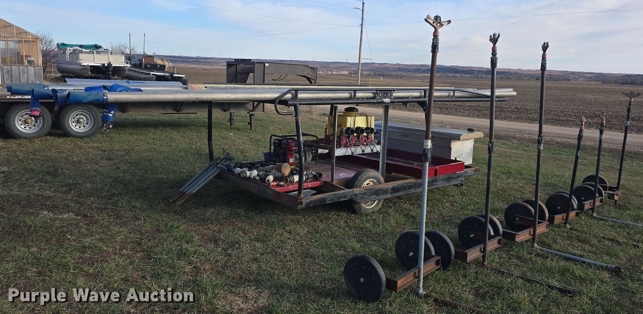 Starcraft Irrigation pump system. Engine. Predator, Displacement: 212 cc, Fuel type: Gas. Features Tank Capacity: 11 gallons, Cargo master ladder rack, Irrigation pipe and sprinkler heads, Attachments and Strainer, Water hoses, Flex hose, Toolbox and more. Trailer VIN: 71S660288. Dimensions Overall: 14' L x 7' W, Deck: 10' L x 7' W. Features Deck type: Steel. Chassis Ball hitch: 2", Landing gear: Single, Suspension: Spring, GVWR: 600 lbs. Tires Steel wheels, Size: 5.30-12. Transfer of ownership documentation will be a bill of sale. Blue Rapids, KS 66411