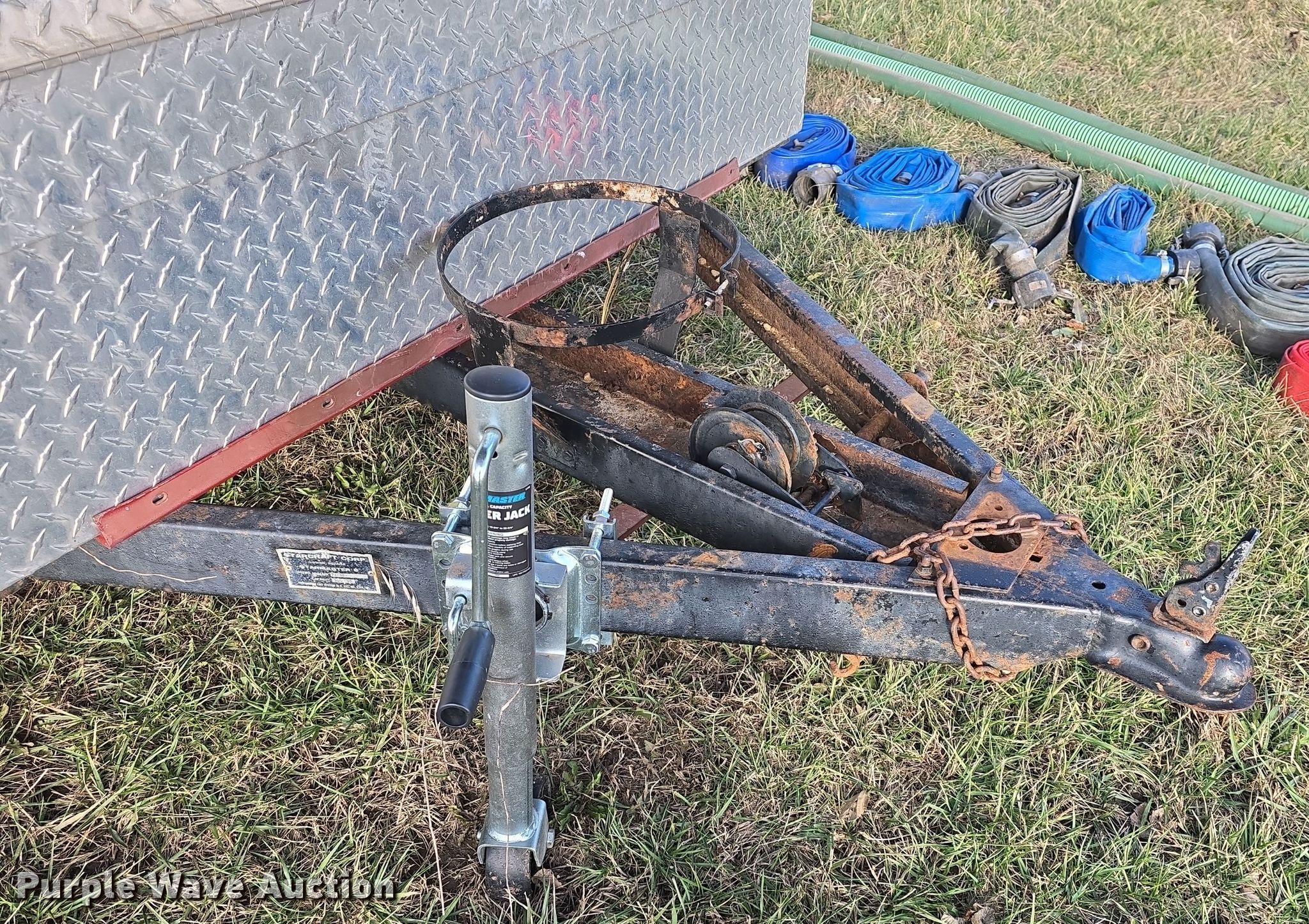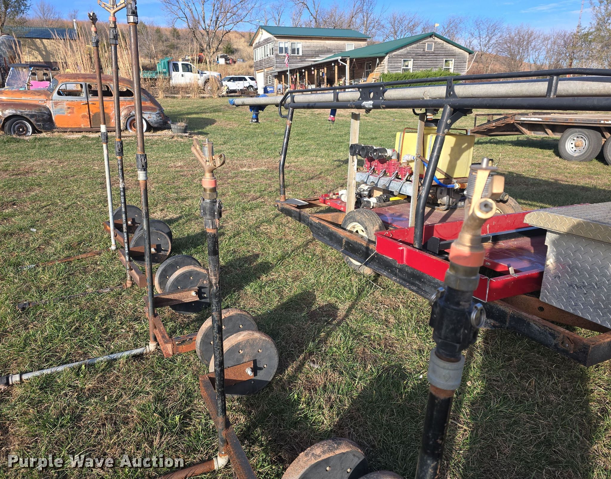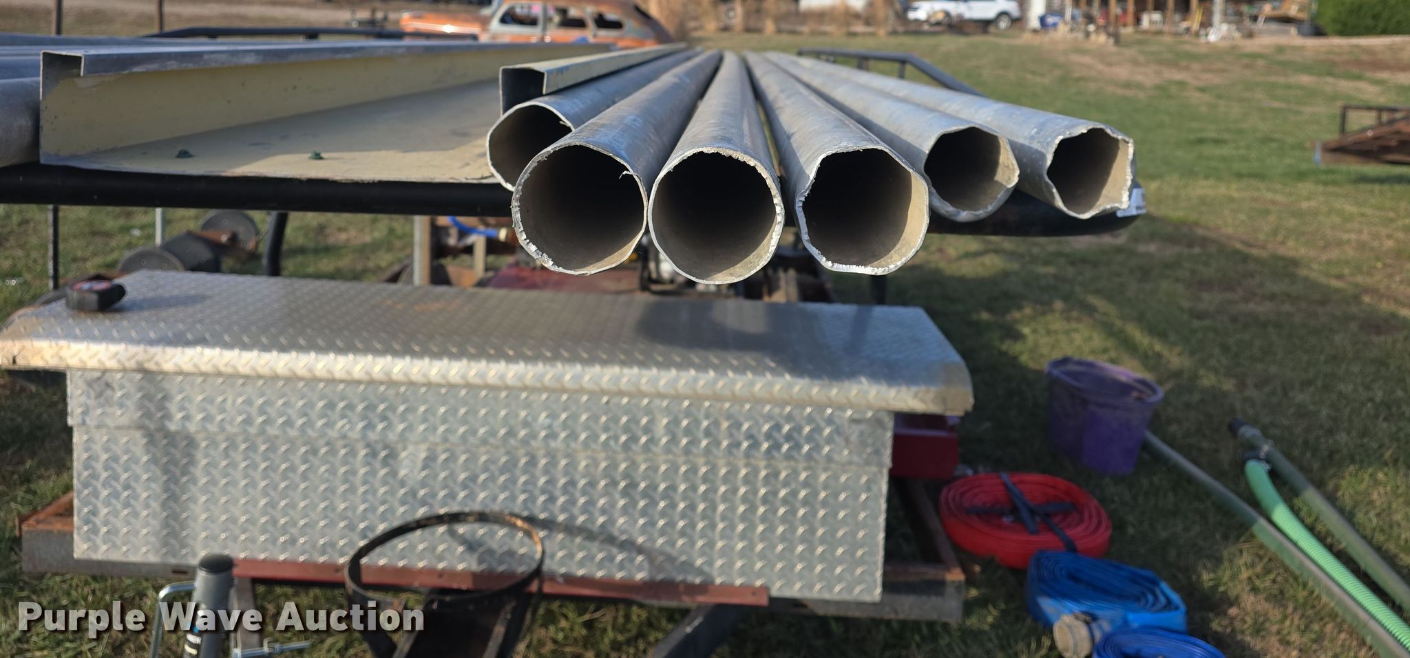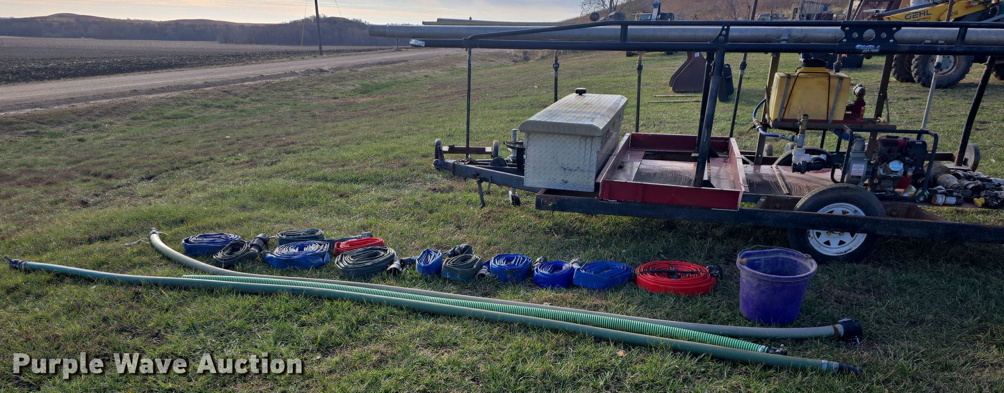 Starcraft Irrigation pump system. Engine. Predator, Displacement: 212 cc, Fuel type: Gas. Features Tank Capacity: 11 gallons, Cargo master ladder rack, Irrigation pipe and sprinkler heads, Attachments and Strainer, Water hoses, Flex hose, Toolbox and more. Trailer VIN: 71S660288. Dimensions Overall: 14' L x 7' W, Deck: 10' L x 7' W. Features Deck type: Steel. Chassis Ball hitch: 2", Landing gear: Single, Suspension: Spring, GVWR: 600 lbs. Tires Steel wheels, Size: 5.30-12. Transfer of ownership documentation will be a bill of sale. Blue Rapids, KS 66411