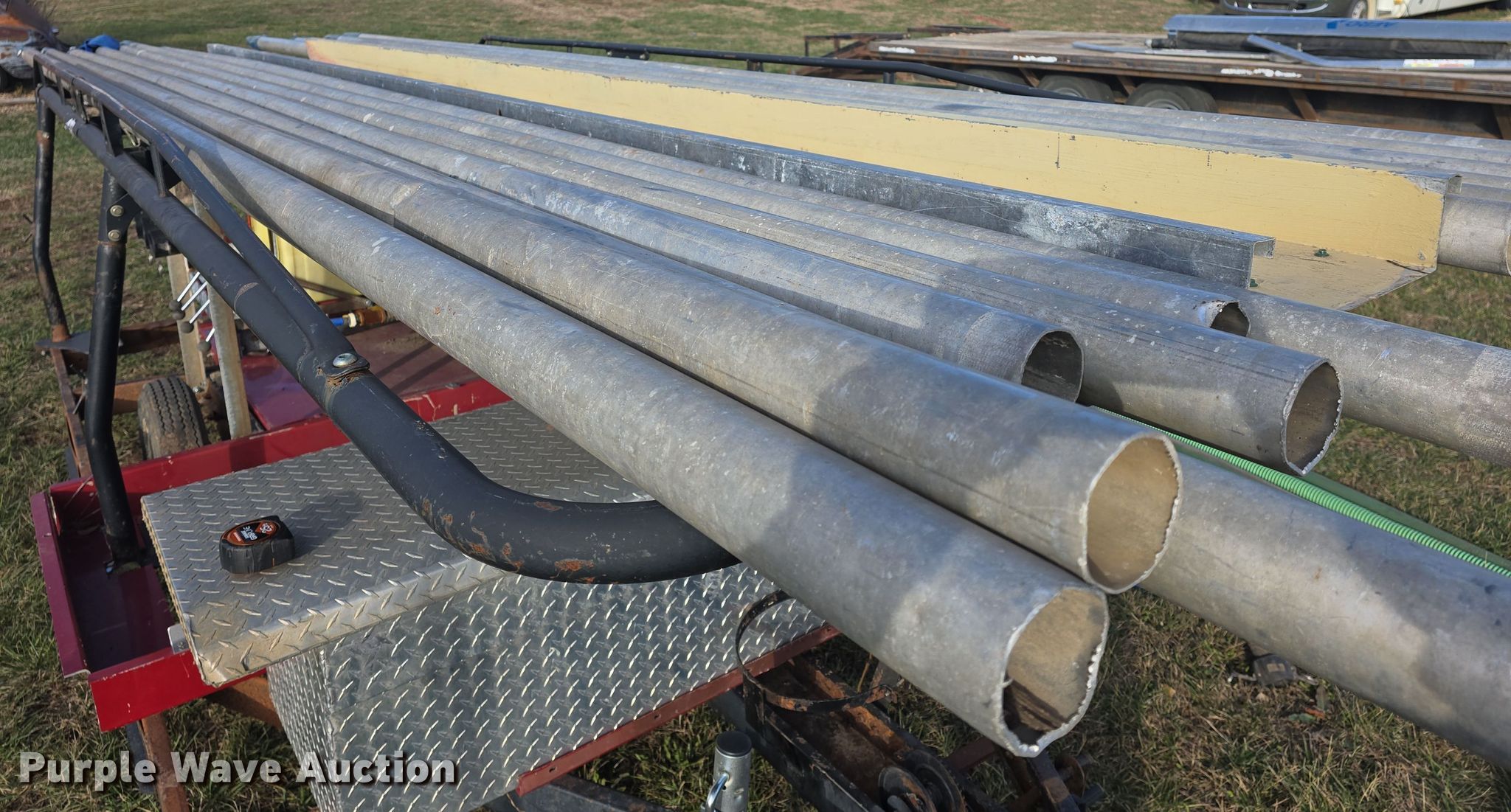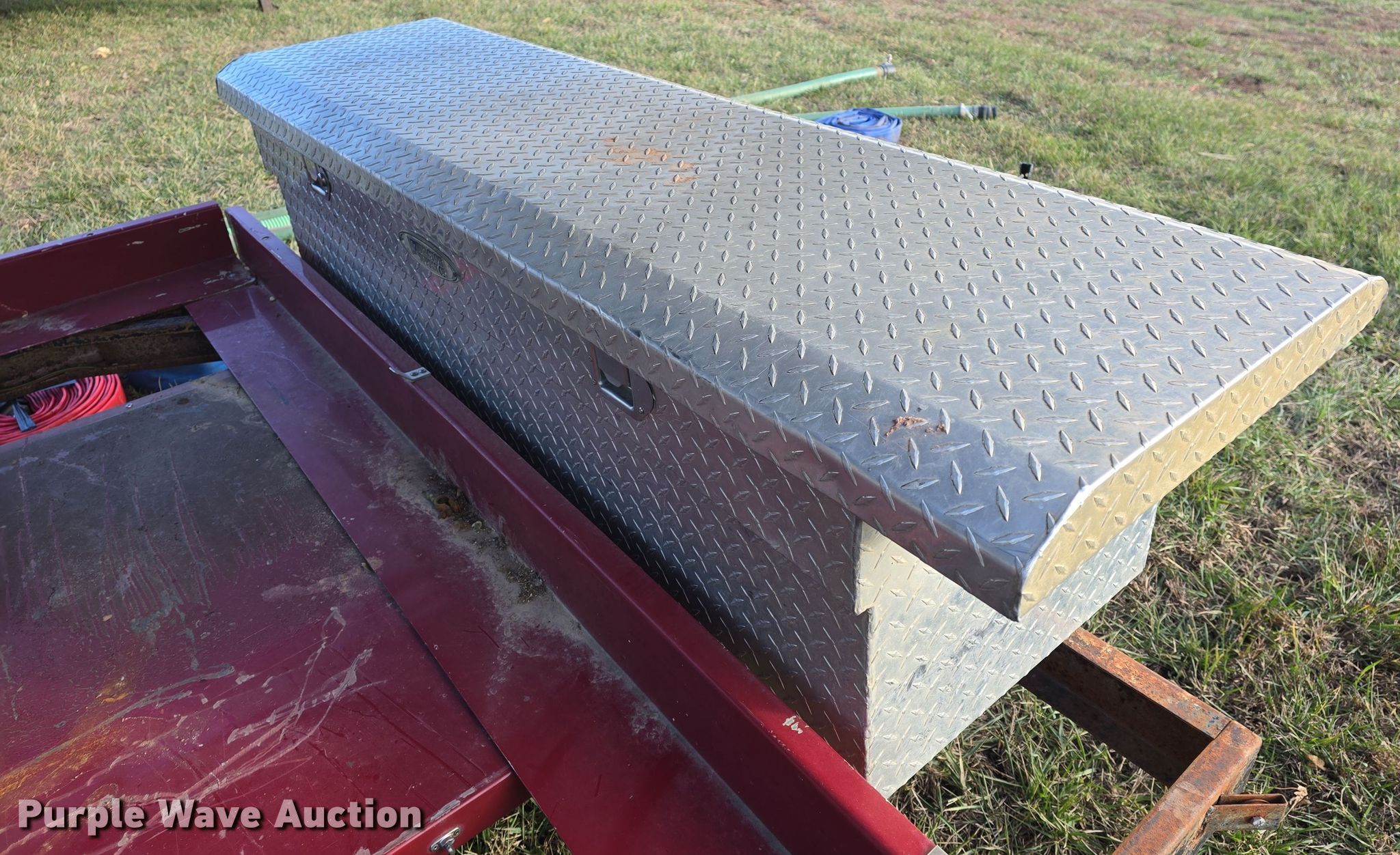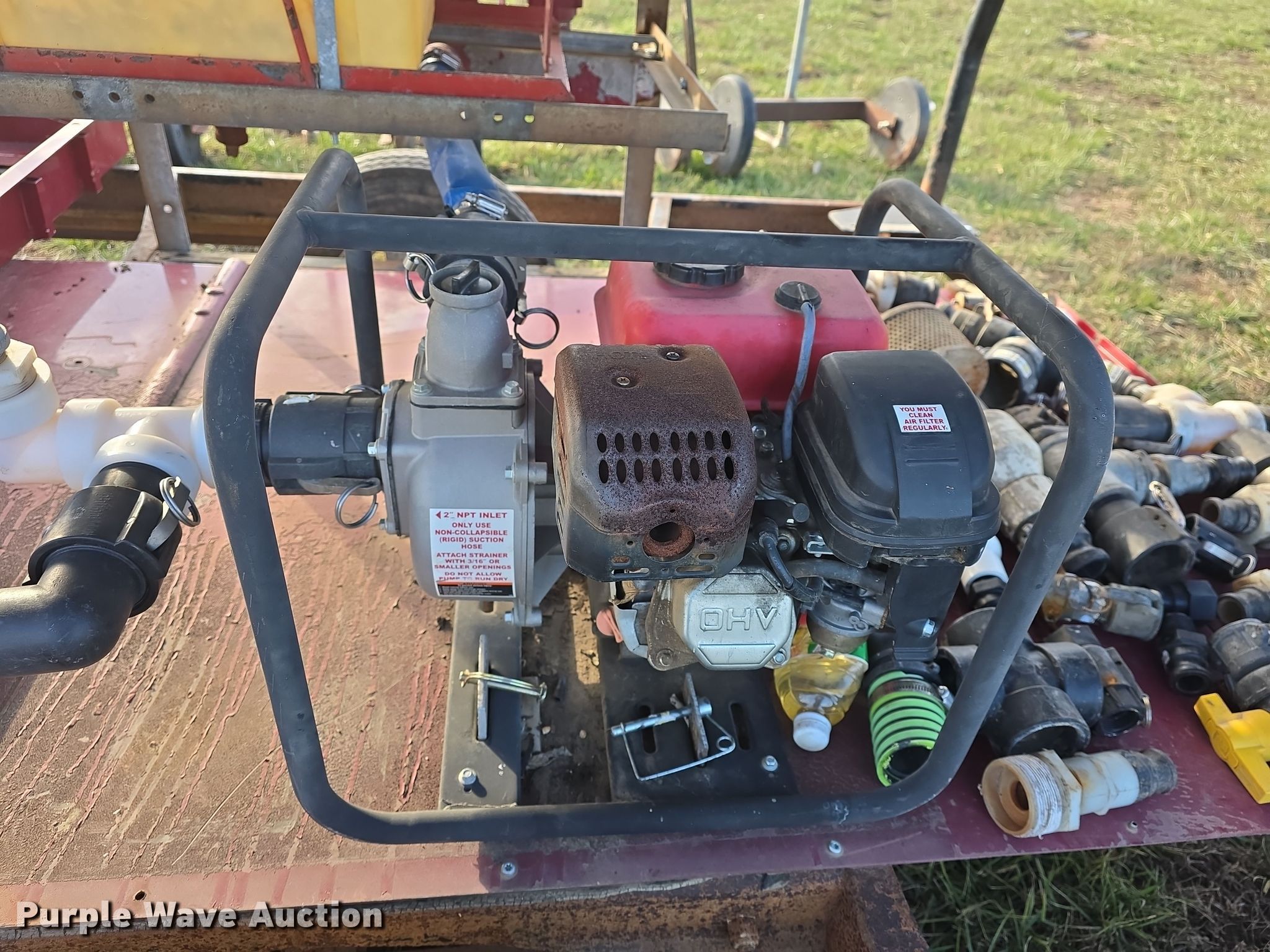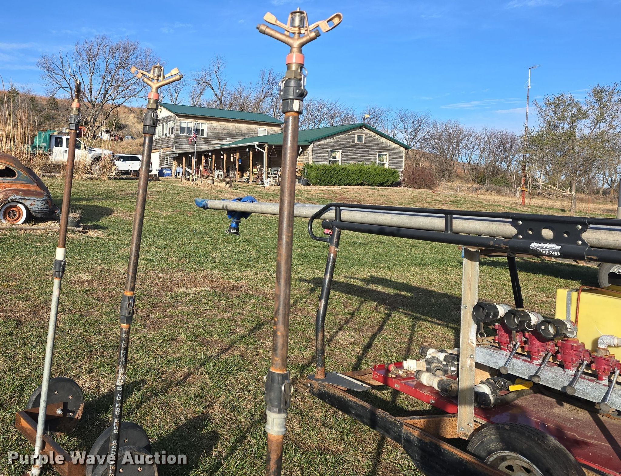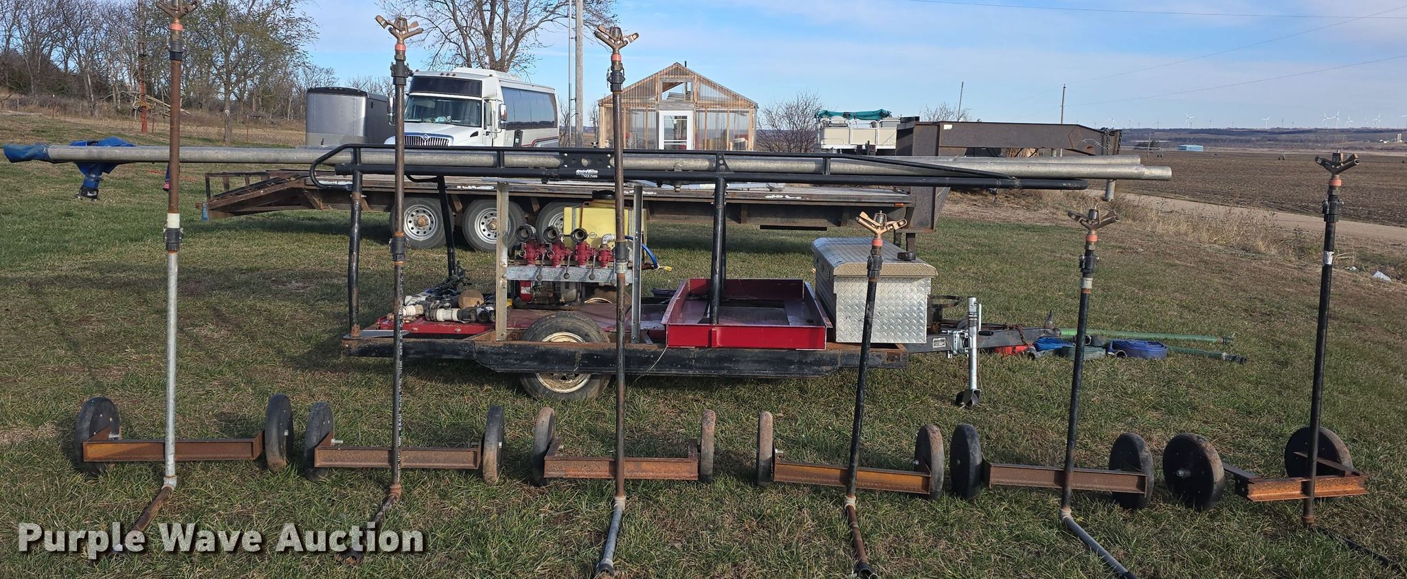 Starcraft Irrigation pump system. Engine. Predator, Displacement: 212 cc, Fuel type: Gas. Features Tank Capacity: 11 gallons, Cargo master ladder rack, Irrigation pipe and sprinkler heads, Attachments and Strainer, Water hoses, Flex hose, Toolbox and more. Trailer VIN: 71S660288. Dimensions Overall: 14' L x 7' W, Deck: 10' L x 7' W. Features Deck type: Steel. Chassis Ball hitch: 2", Landing gear: Single, Suspension: Spring, GVWR: 600 lbs. Tires Steel wheels, Size: 5.30-12. Transfer of ownership documentation will be a bill of sale. Blue Rapids, KS 66411