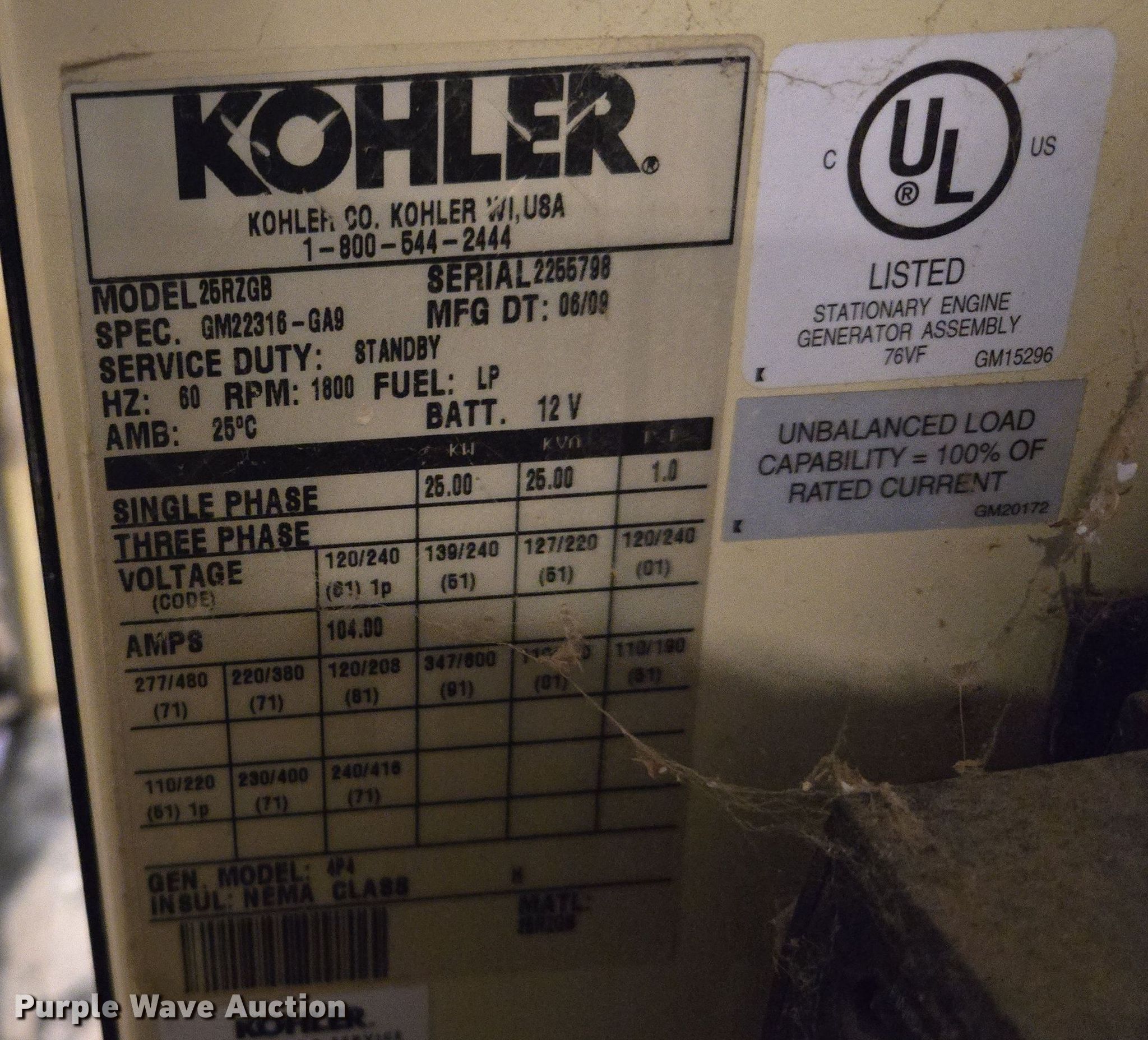 This 2009 Kohler 25RZGB generator will sell to the highest bidder regardless of price.