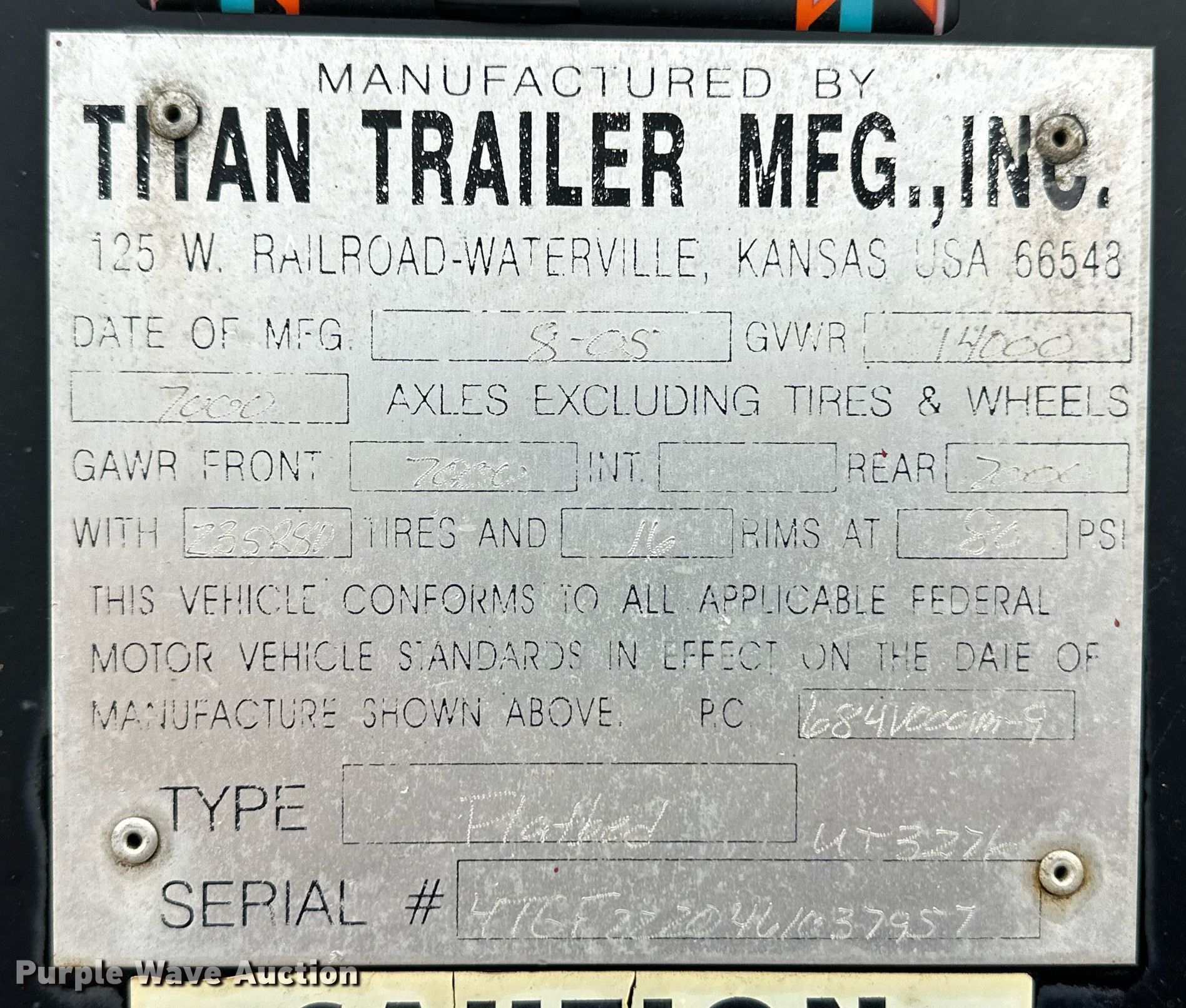 Purple Wave is selling a used Equip. Trailer in Kansas. This item is a 2006 Titan equipment trailer with the following: VIN: 4TGF2220461037957