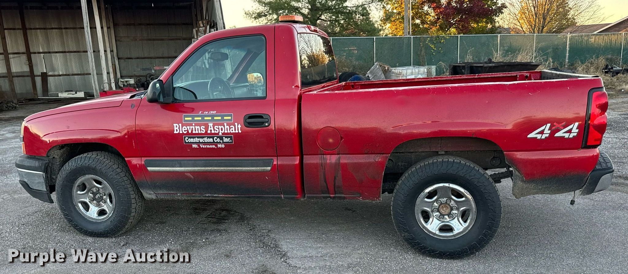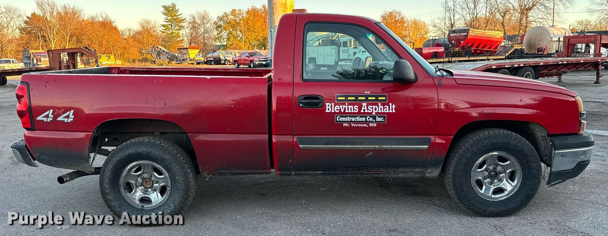 2004 Chevrolet Silverado 1500 pickup truck. Miles: 466,650 on odometer, Hours: 16,859 on meter, VIN: 1GCEK14T24Z205007, Unit #: 6. Engine Displacement: 5.3L V8 OHV, Cylinders: 8, Fuel type: Gas. Transmission Automatic, Four wheel drive. Interior AC, Heat, Power locks, Cruise control. Tires Size: 265/75R16. Notes Decals will be removed prior to auction, Dash warning indicator: Airbag, Windshield chipped or cracked, Dead battery, Alternator issues , Tailgate handle damaged. Missouri title. Title distribution may be delayed up to 14 days from verification of funds. Blevins Asphalt Construction Company Inc.. Mount Vernon, MO 65712