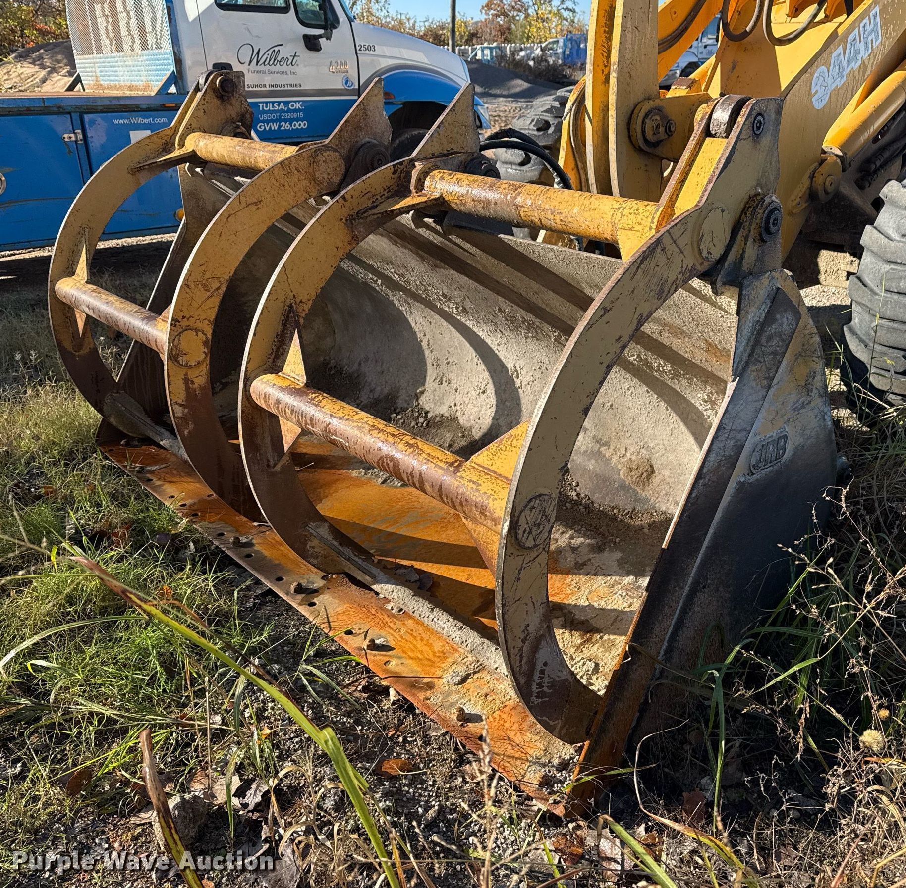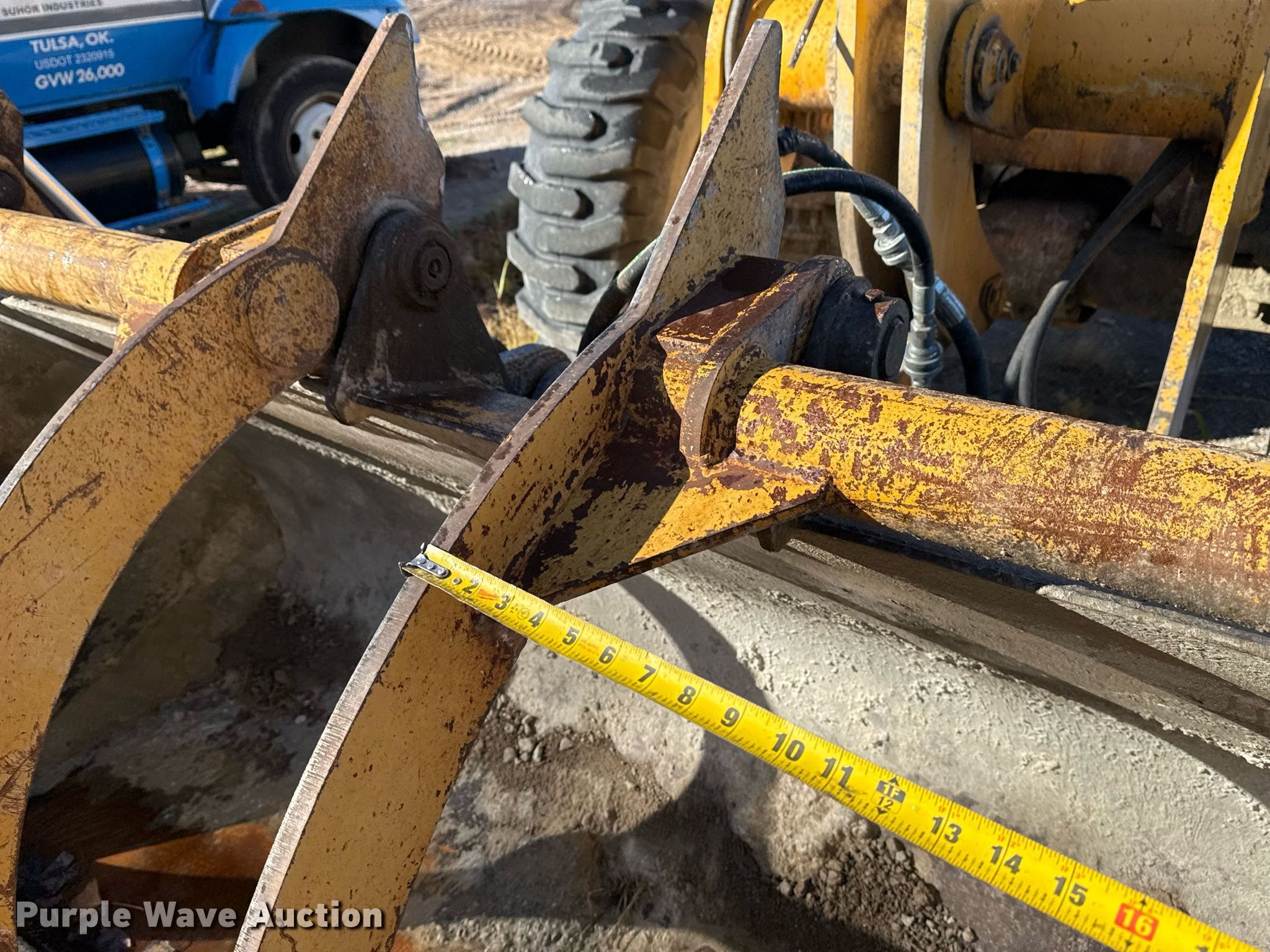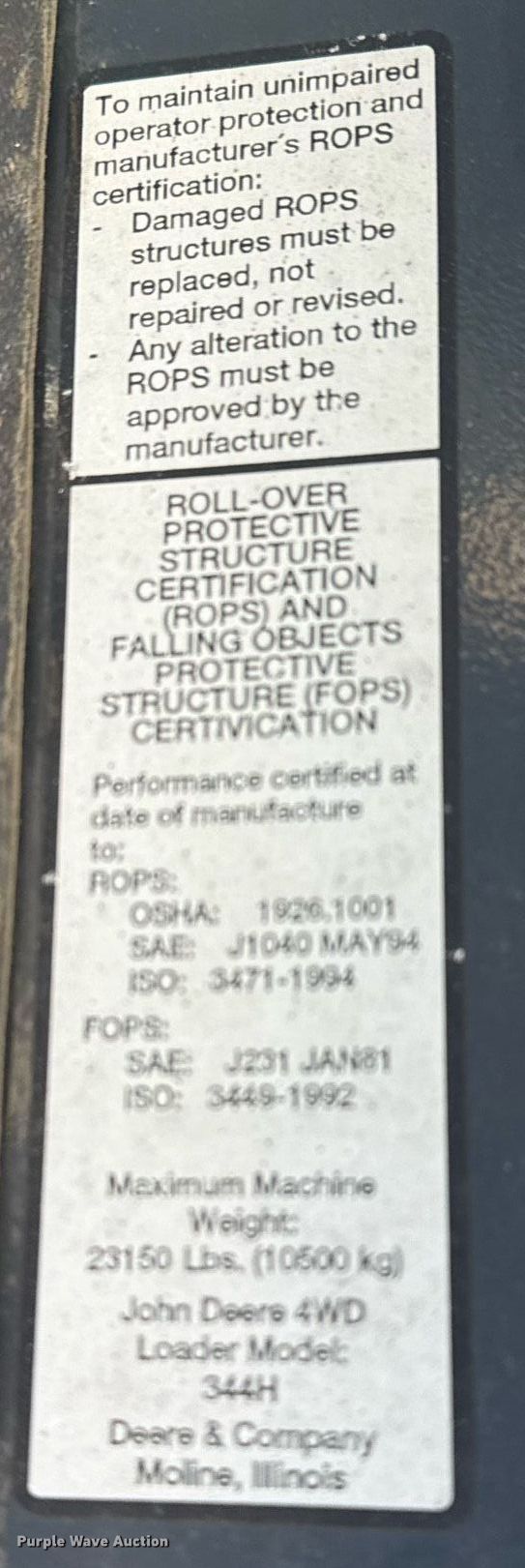 2000 John Deere 344H wheel loader. Hours: Unknown, Serial: LU344HX710308. Engine Cylinders: 4, Fuel type: Diesel. Transmission Hydrostatic, Two speed travel. Operators station Enclosed cab, Bucket controls: Joystick. Features Auxiliary hydraulics: Front, Quick coupler: Manual, Grapple bucket Width: 94", Cutting edge: Bolt-on. Tires Size: 15.5-25IND. Notes Non-operational unit. Wilbert Funeral Services. Tulsa, OK 74131