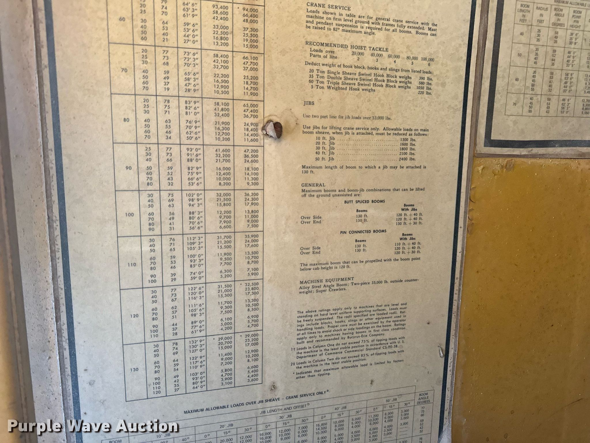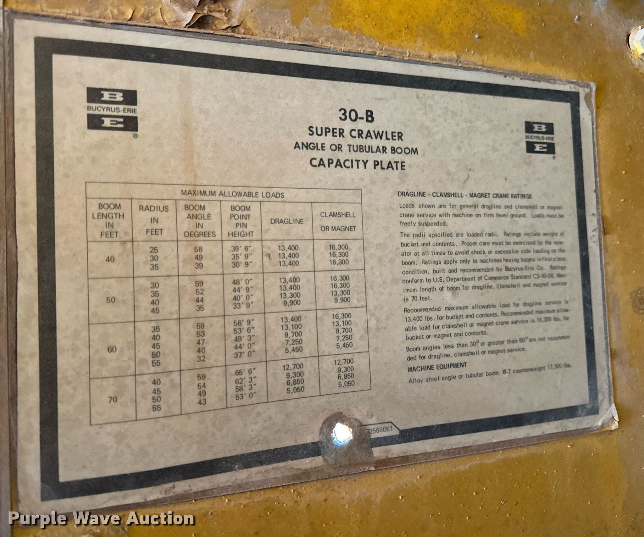 1970 Bucyrus-Erie 30-B crane. Hours: 3,447 on meter, Serial: 132005. Engine General Motors, Cylinders: 6, Fuel type: Diesel. Chassis Propulsion: Mechanical. Operators station Enclosed cab, Heat, Crane controls: Stick. Features Boom Lattice, Maximum boom length: 110' Sections: 5, Boom controls In-cab, Winches: 2, Removable counter weight, Sheaves: 3, Crane ball & hook, Lift chart. Tracks Width: 35.5". Notes Non-operational unit. Widel Inc.. Blackwater, MO 65322