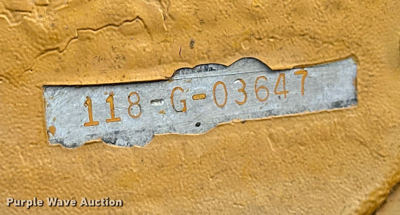 1961 Galion 118 rigid frame motor grader. Hours: Unknown, Serial: 03647. Engine Detroit Diesel, Cylinders: 4, Fuel type: Diesel. Transmission Direct-drive. Operators station Enclosed cab, Heat, Hydraulic control valves: 6. Features Moldboard: Side shift, Moldboard total width: 15'. Tires Size: 13.00-24. Premier Alfalfa Inc. Ulysses, KS 67880
