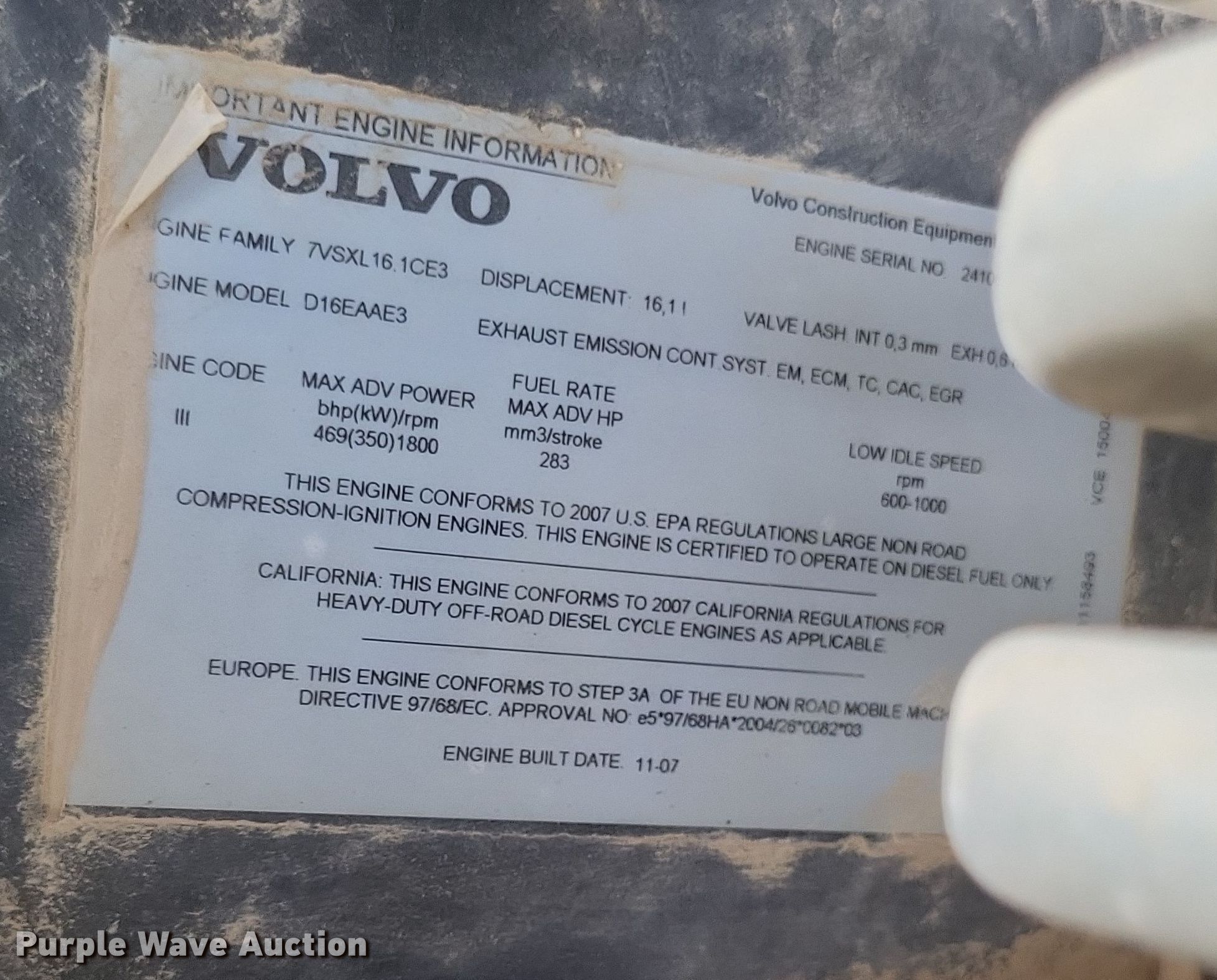 2008 Volvo A40E haul truck. Hours: 15,929, Serial: A40EV11316, Unit #: 150004. Engine Volvo D16E, Displacement: 16.1L, Cylinders: 6, Fuel type: Diesel, kW: 350, HP: 469. Transmission Automatic. Chassis Six wheel drive. Interior AC, Heat. Features Dump bed Capacity: 30.3 cu.yd.. Tires Size: 29.5R25. Notes Hour meter illumination issues. Titan Truck & Equipment Co. LLC. West Plains, MO 65775