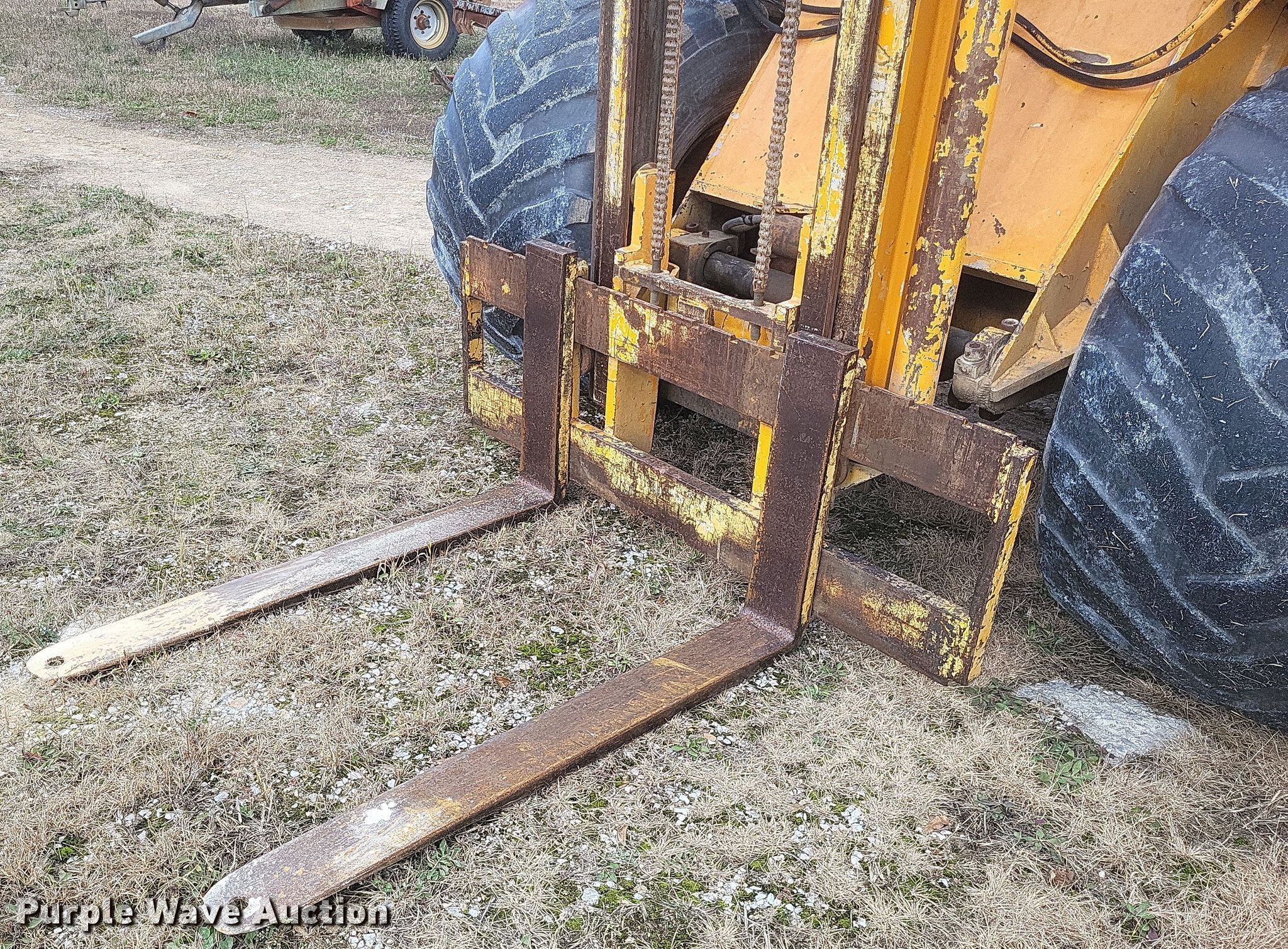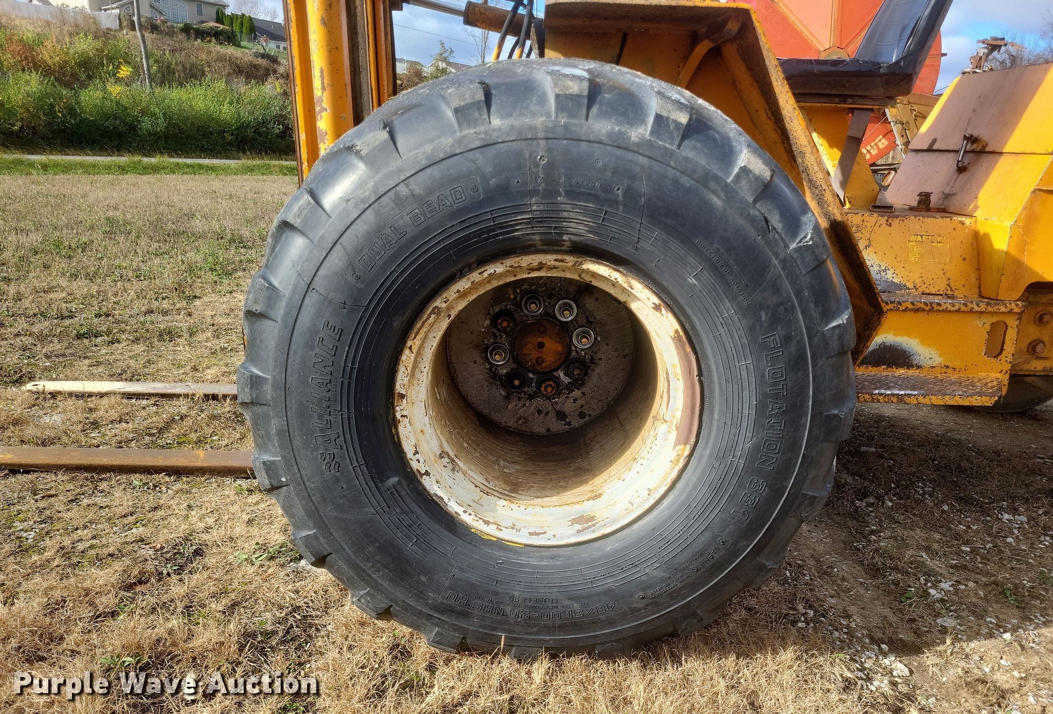1988 Master Craft MC-643-8 forklift. Hours: 3,206 on meter, Serial: 1511, Unit #: 2. Engine Cylinders: 3, Fuel type: Diesel. Transmission Shuttle shift. Chassis Differential lock. Operators station OROPS, Canopy. Features Maximum lift capacity: 6,000 lbs, Maximum lift height: 168", Mast stages: 2, Side shift, Mast tilt, Fork length: 48". Tires Front: 48x31.00-20, Rear: 31x15.5-15. Notes Front drive seal issues, leaks. Emerald View Turf Farms. O'Fallon, MO 63366