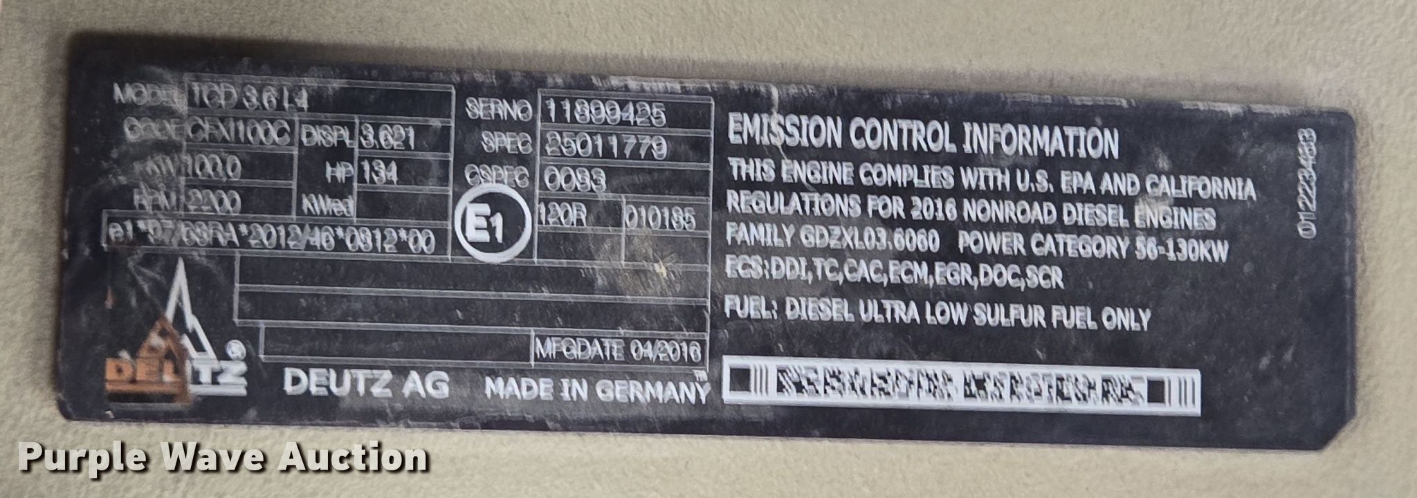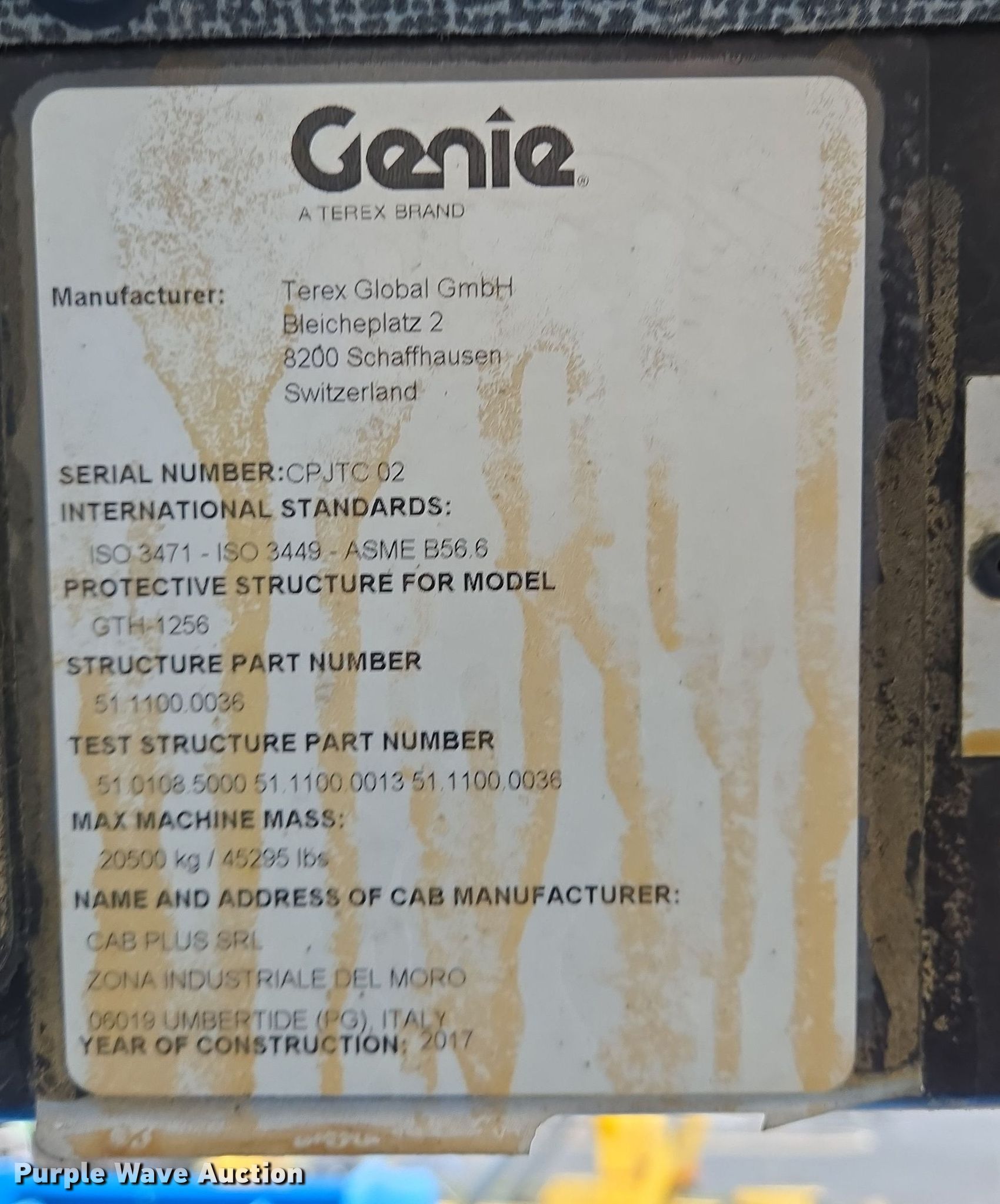 2017 Genie GTH 1256 telehandler. Hours: 1,231 on meter, Serial: CPJTC02. Engine Deutz, Serial: 11899425, Displacement: 3.621L, Cylinders: 4, Fuel type: Diesel, HP: 134. Transmission Powershift, 2F - 2R, Differential lock. Operators station OROPS, Steering: Crab, Four wheel. Features Maximum lift capacity: 12,000 lbs, Maximum lift height: 55', Boom stages: 4, Fork length: 60", Auxiliary hydraulics, Hydraulic outriggers, Hydraulic leveling. Tires Size: 17.5-25. The Pape Group. Portland, OR 97222
