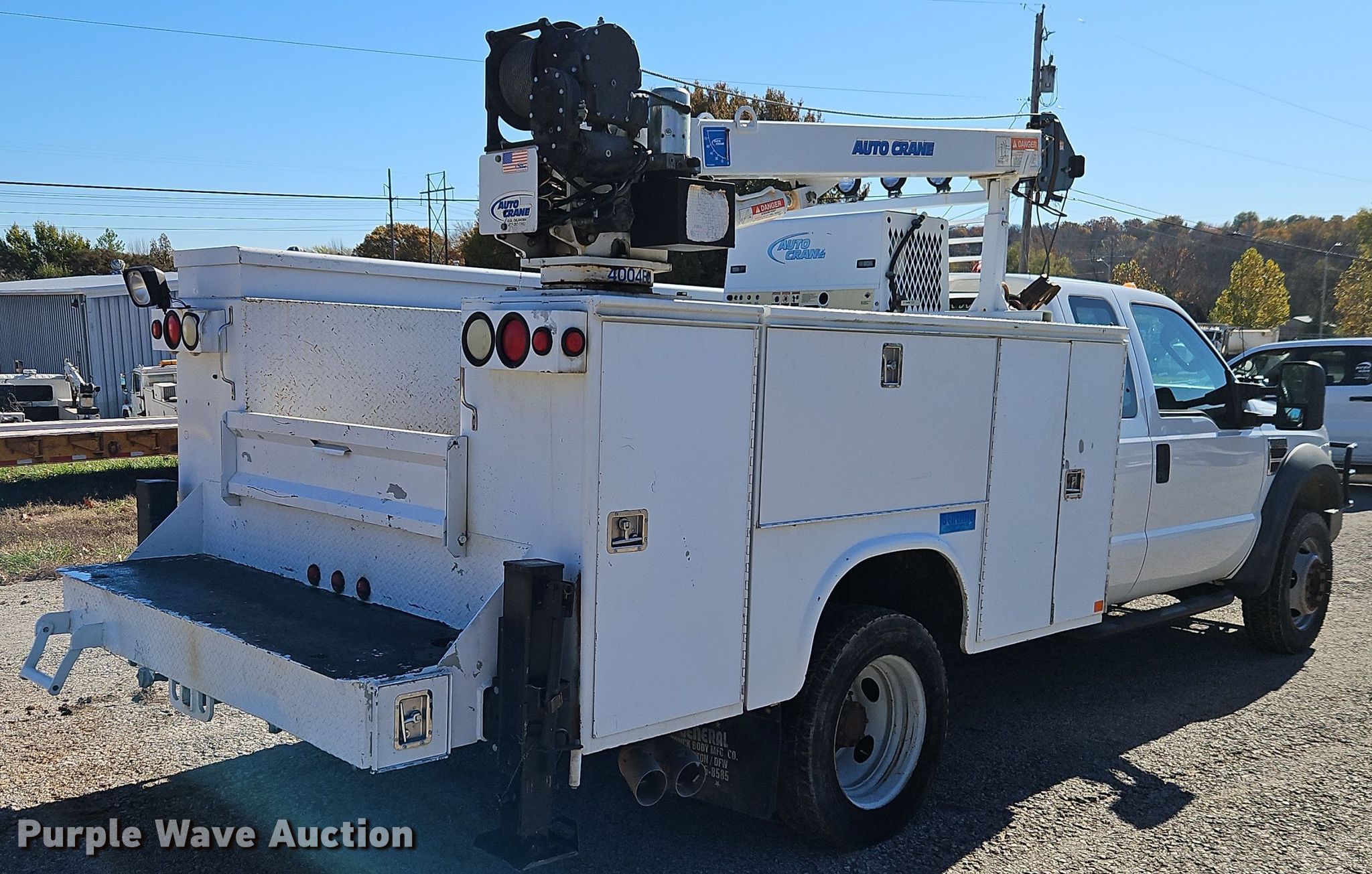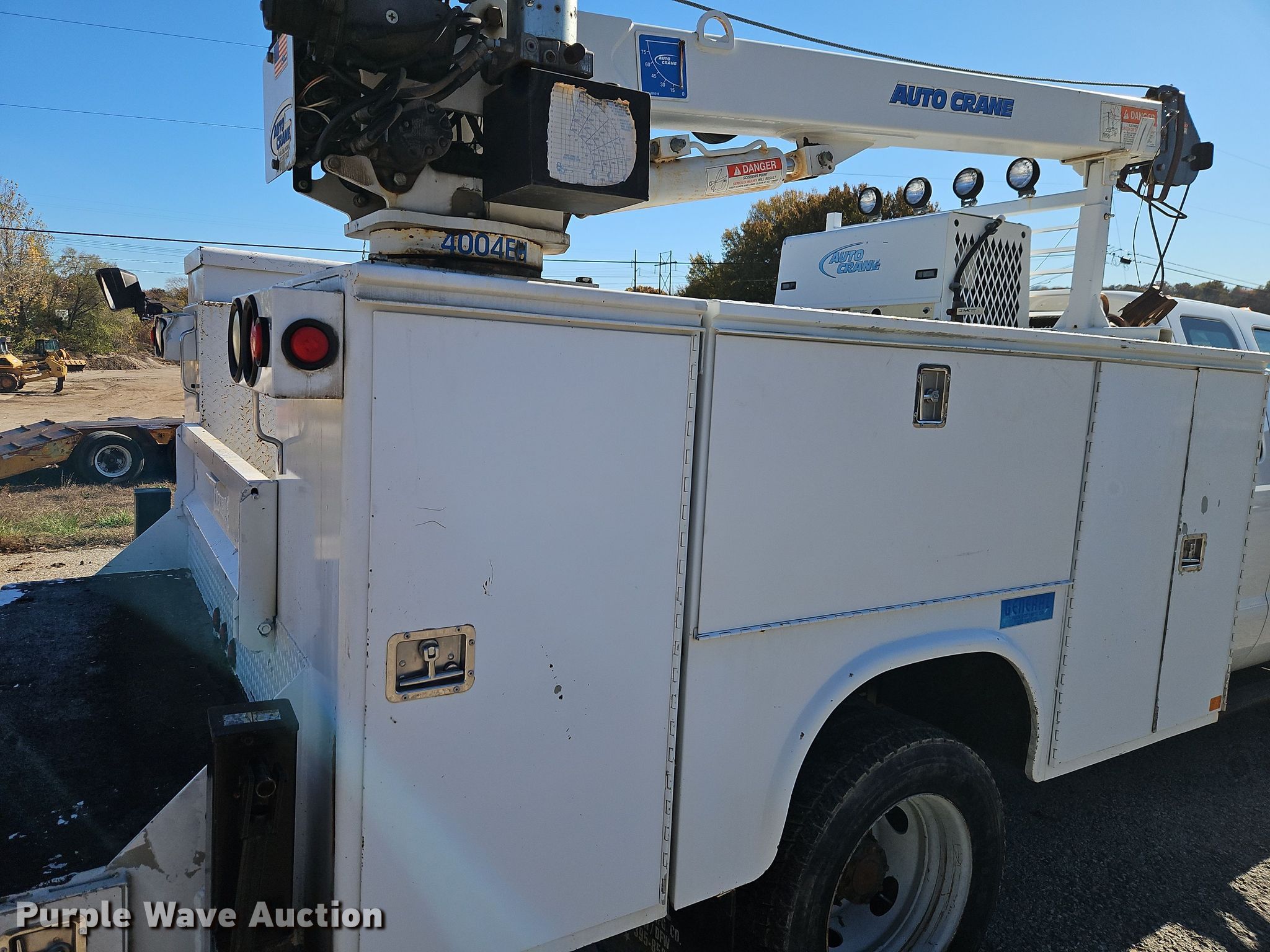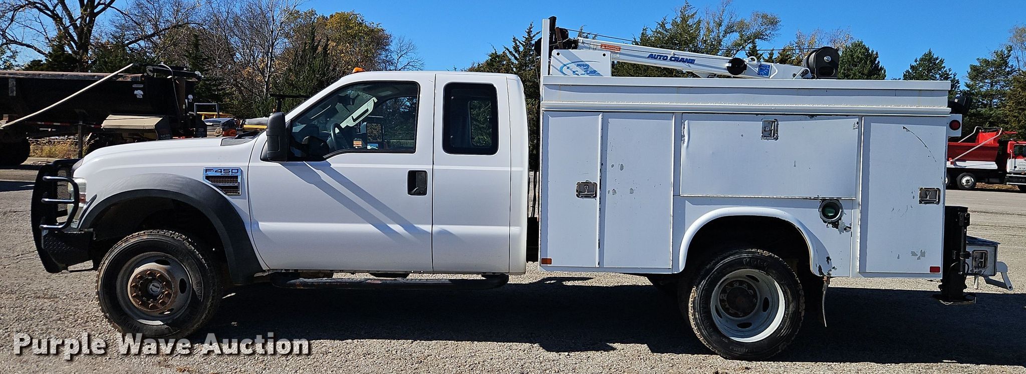 2008 Ford F450 Super Duty XL SuperCab utility / service truck. Miles: 124,047 on odometer, Hours: 4,104 on meter, VIN: 1FDXX47R88EC54152. Engine Displacement: 6.4L, Cylinders: 8, Fuel type: Diesel. Transmission Automatic. Chassis Four wheel drive, Axles: Single, Suspension: Spring, Brakes: Hydraulic, PTO, Wet kit, GVWR: 16,000 lbs, Wheelbase: 162". Interior AC, Heat, Cruise control, Auxiliary controls, Brake controller. Features Bed Knapheide 6108DL-38J, 9' L x 95" W, Torch bottle rack, Air compressor Auto Crane RS60AC, Crane Auto Crane 4004EH, Maximum boom length: 17' Maximum lift capacity: 4,000 lbs.. Tires Size: 225/70R19.5. Notes Dead battery. Kansas title. Title distribution may be delayed up to 14 days from verification of funds. Max Rieke & Brothers Inc.. Shawnee, KS 66217