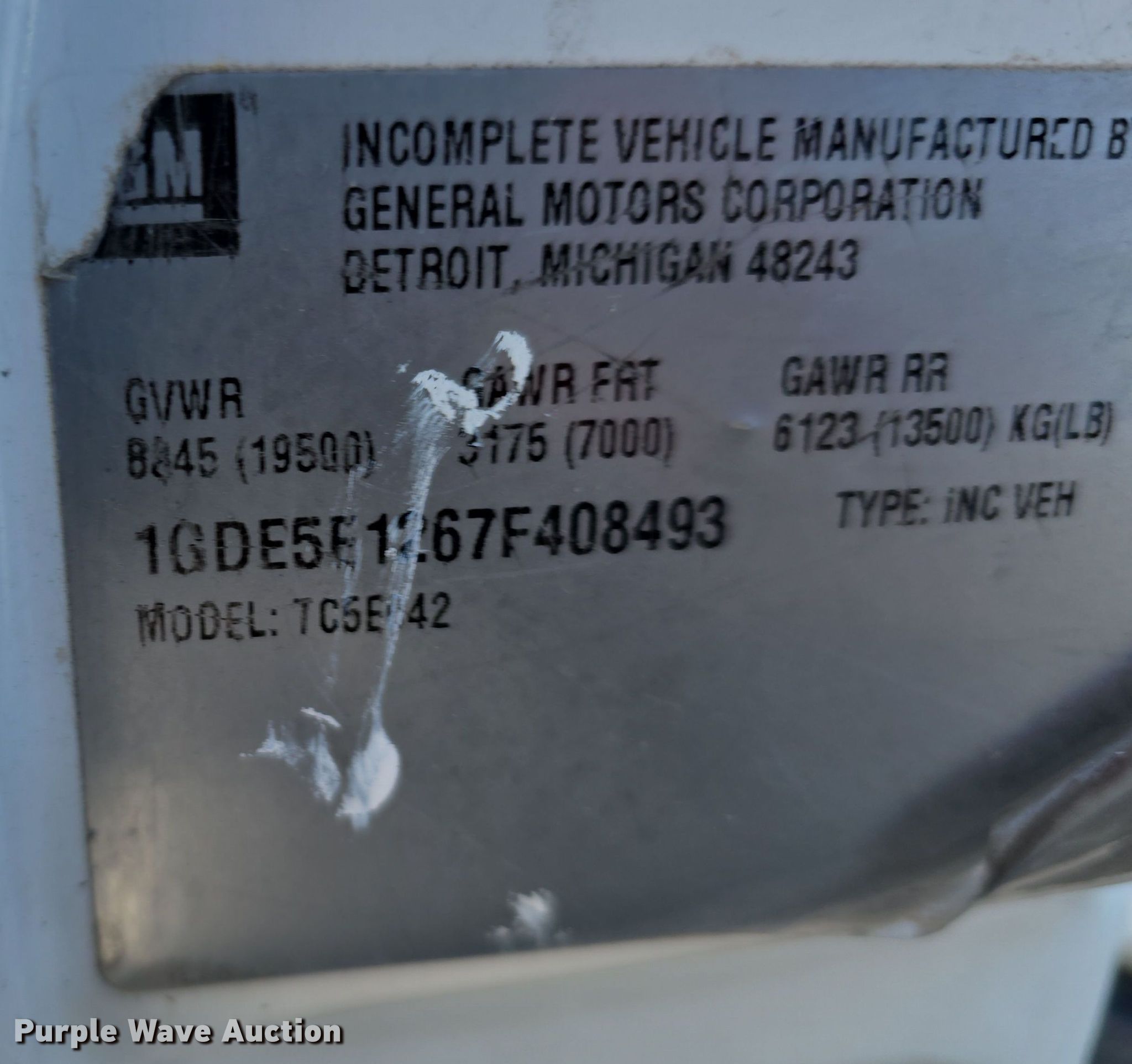 2007 GMC C5500 Crew Cab flatbed truck. Miles: 172,245 on odometer, VIN: 1GDE5E1267F408493. Engine Displacement: 6.6L, Cylinders: 8, Fuel type: Diesel. Transmission Automatic. Chassis Axles: Single, Suspension: Spring, Brakes: Hydraulic, PTO, GVWR: 19,500 lbs, Wheelbase: 195". Interior AC, Heat, Heated mirrors, Auxiliary controls. Features Flatbed 12' 6" L x 96" W, Vanair 185 UDSM air compressor Hours: 784 on meter. Tires Size: 225/70R19.5. Nevada title. Seller is a Nebraska licensed motor vehicle dealer. The buyer may be required to pay sales tax and/or registration fees to the dealer prior to taking possession. Title will be assigned and distributed by the dealer. Please contact the seller for distribution questions. Jordan Machinery/ S & N Auto Sales. Waterloo, NE 68069