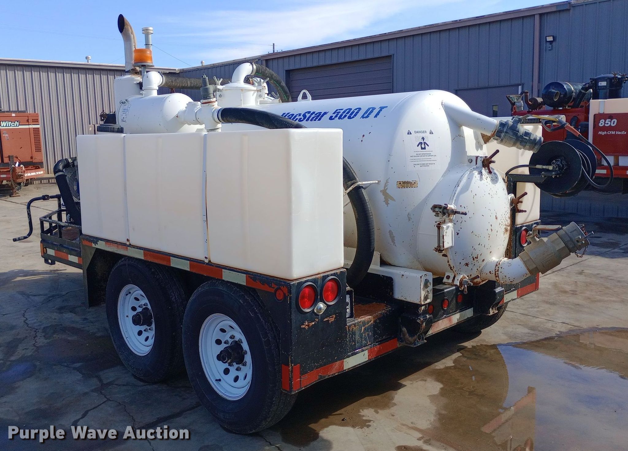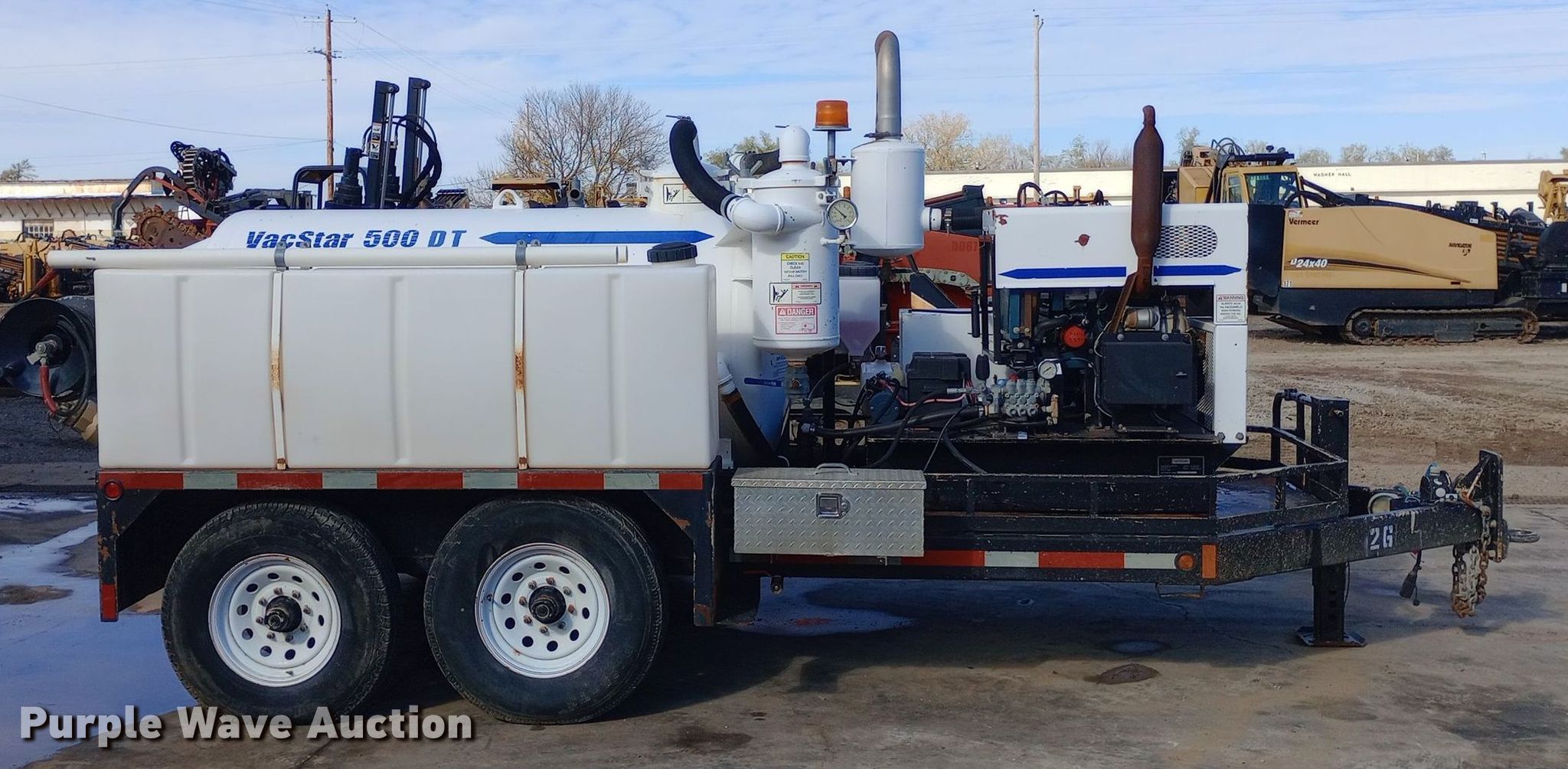 2011 VacStar VT500D vacuum excavator. Hours: 558 on meter, VIN: 5E3FT28N8B1000048. Engine Cylinders: 3, Fuel type: Diesel. Features Spoils tank Capacity: 500 gallons, Water tank Capacity: 300 gallons, Water pump CAT, Vacuum pump Jurop PNR102D, Inlet valve size: 3", Outlet valve size: 5". Trailer 17' L x 98" W, Suspension: Spring, Brakes: Electric, Axles: Tandem, Tire size: 235/85R16, GVWR: 12,000 lbs. This is worksite support equipment and will not come with a title. Transfer of ownership documentation will be a bill of sale. Source: HDD. Hutchinson, KS 67501
