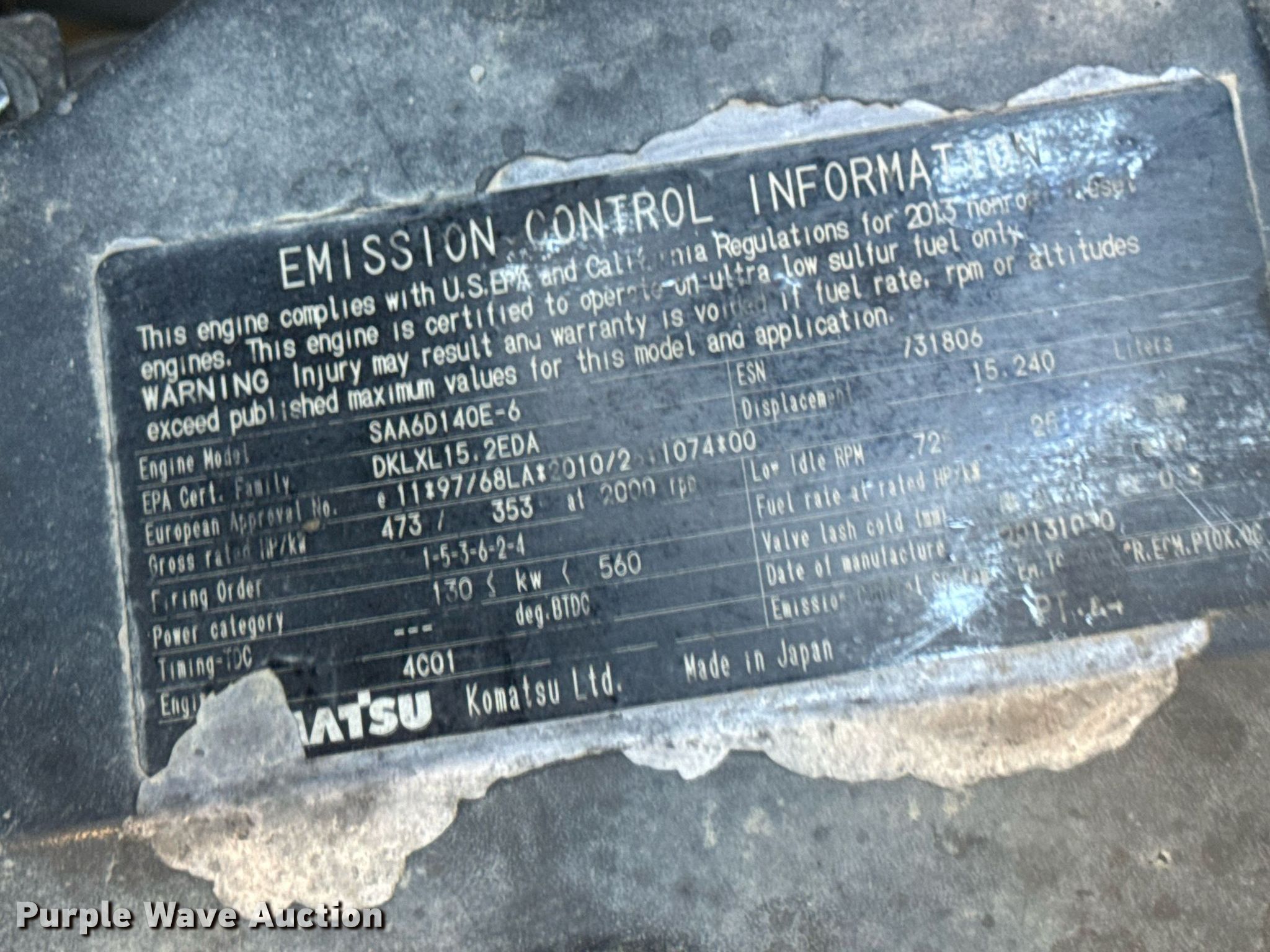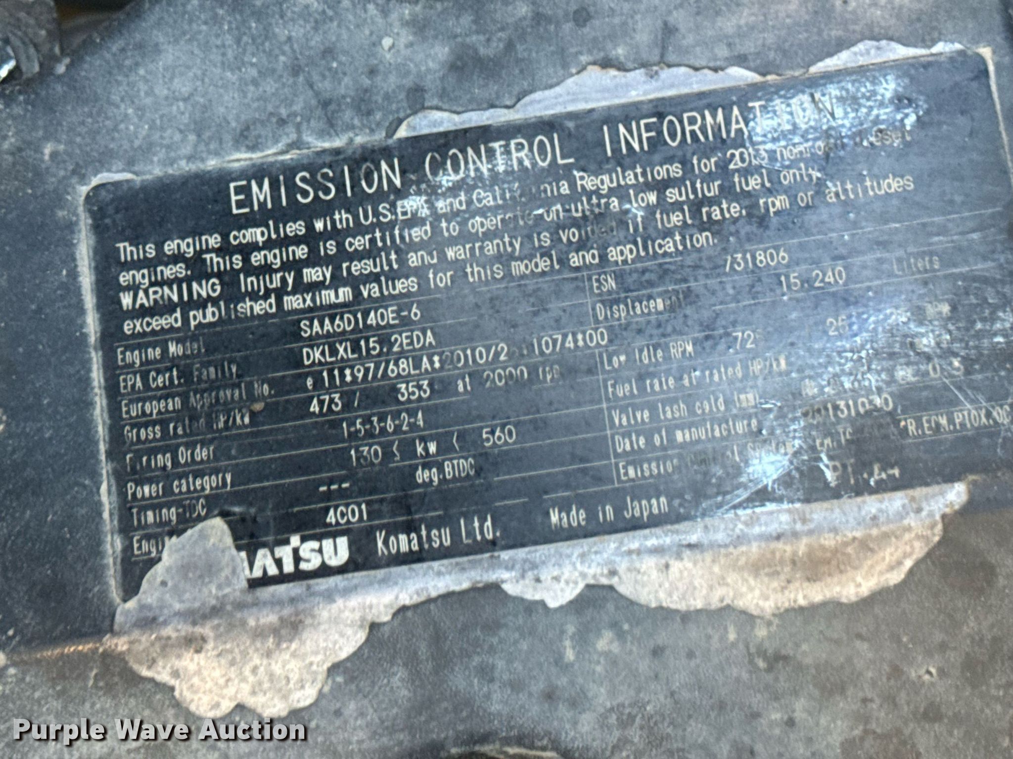 2014 Komatsu HM400-3 haul truck. Miles: 70,548 on odometer, Hours: 12,036 on meter, Serial: 3714. Engine Komatsu SAA6D140E-6, Displacement: 15.24L, Cylinders: 6, Fuel type: Diesel, HP: 473. Transmission Automatic, 5F - 2R. Chassis Six wheel drive. Interior AC, Heat, Retarder, Backup camera. Features Dump bed Komatsu, Bed heater. Tires Size: 29.5R25. Notes Dash warning indicator: Check engine, Transmission code, Emissions warning, Windshield chipped or cracked, Hydraulic leak. Rasmussen Group. West Burlington, IA 52655