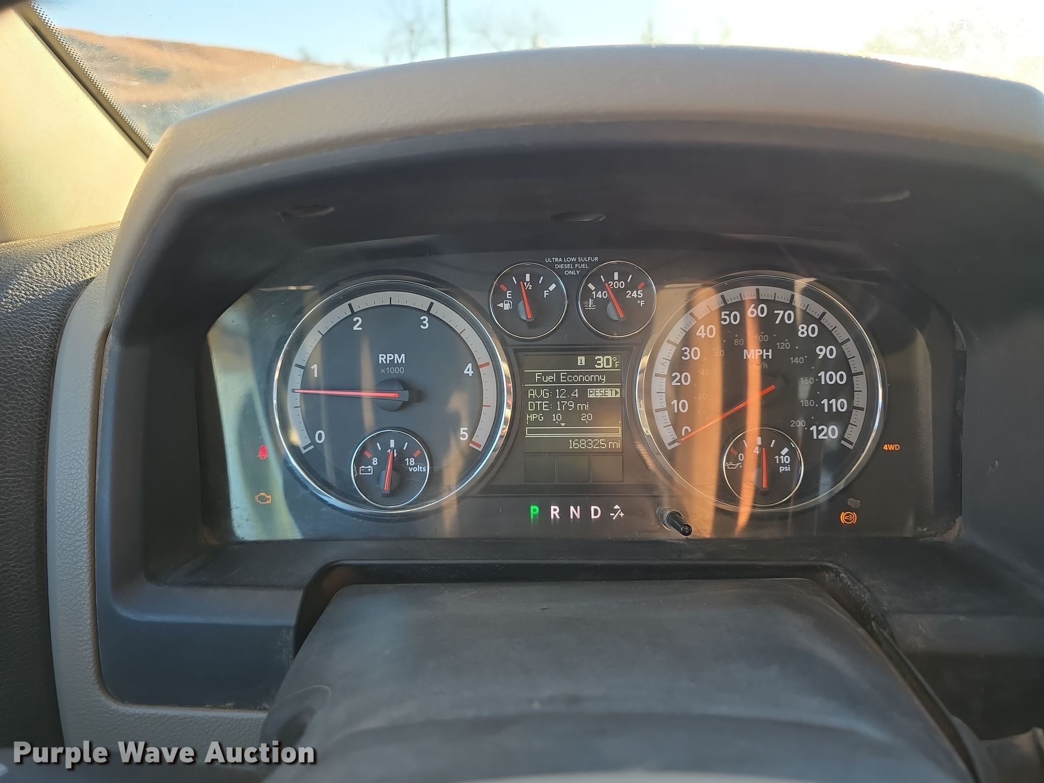 2011 Dodge Ram 4500HD flatbed truck. Miles: 168,325 on odometer, VIN: 3D6WU6CL9BG612410. Engine Displacement: 6.7L, Cylinders: 6, Fuel type: Diesel. Transmission Automatic. Chassis Four wheel drive, Axles: Single, Suspension: Spring, Brakes: Hydraulic. Interior AC, Heat, Power windows, Power locks, Cruise control, Auxiliary controls. Features Flatbed 9' 6" L x 100" W. Tires Size: 225/70R19.5. Notes Dash warning indicator: Check engine, DEF, Service 4WD. Kansas title. Title distribution may be delayed up to 30 days from verification of funds. Jueneman Excavation. Inc.. Hanover, KS 66945