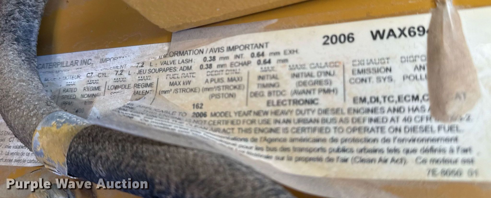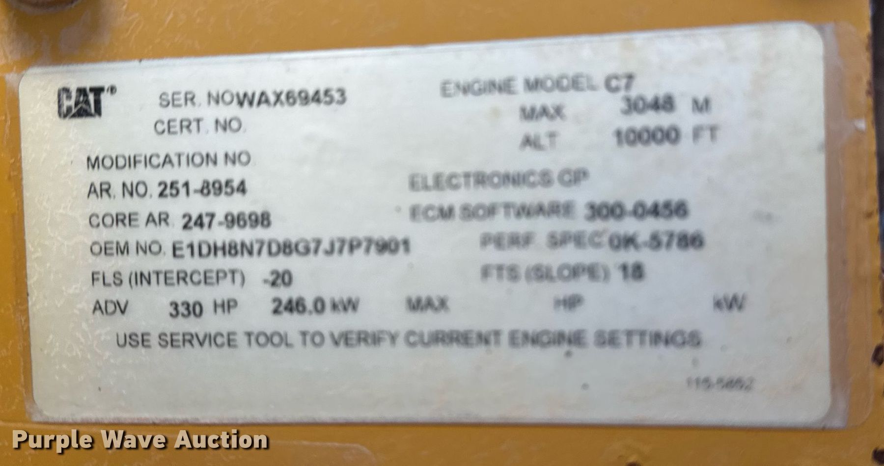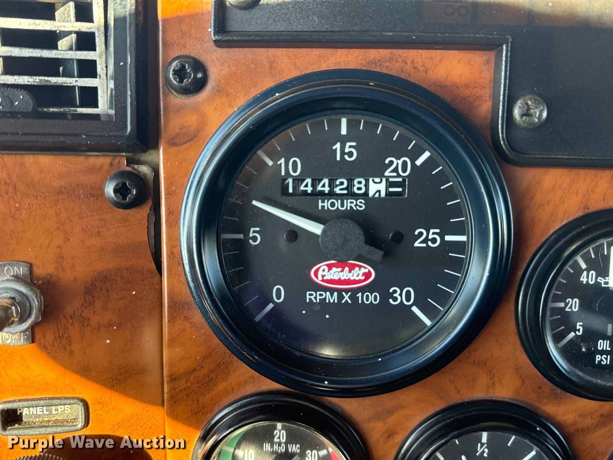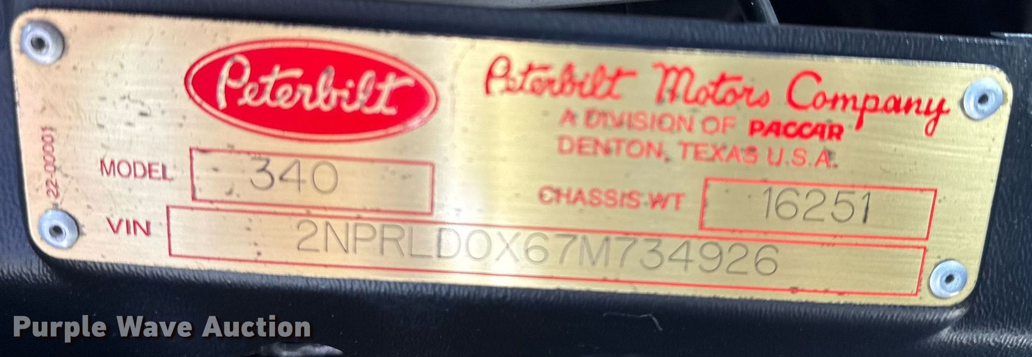 2007 Peterbilt 340 oilfield acidizing pump truck. Miles: 139,643 on odometer, Hours: 14,428 on meter, VIN: 2NPRLD0X67M734926. Engine Caterpillar C7, Serial: WAX69453, Displacement: 7.2L, Cylinders: 6, Fuel type: Diesel, HP: 330, kW: 246. Transmission Eaton Fuller, Manual, Speed: 10. Chassis Axles: Tandem, Differential lock: Inter-axle, Suspension: Spring over walking beam, Brakes: Air, PTO, GVWR: 60,000 lbs. Interior AC, Heat, Cruise control. Features Bed / tank Pattis Fabrication Inc, 21' L x 96" W, Top fill. Tires Front: 385/65R22.5, Rear: 11R22.5. Notes Tank damaged, cracked. Oklahoma title. Title distribution may be delayed up to 14 days from verification of funds. Collinsville, OK 74021