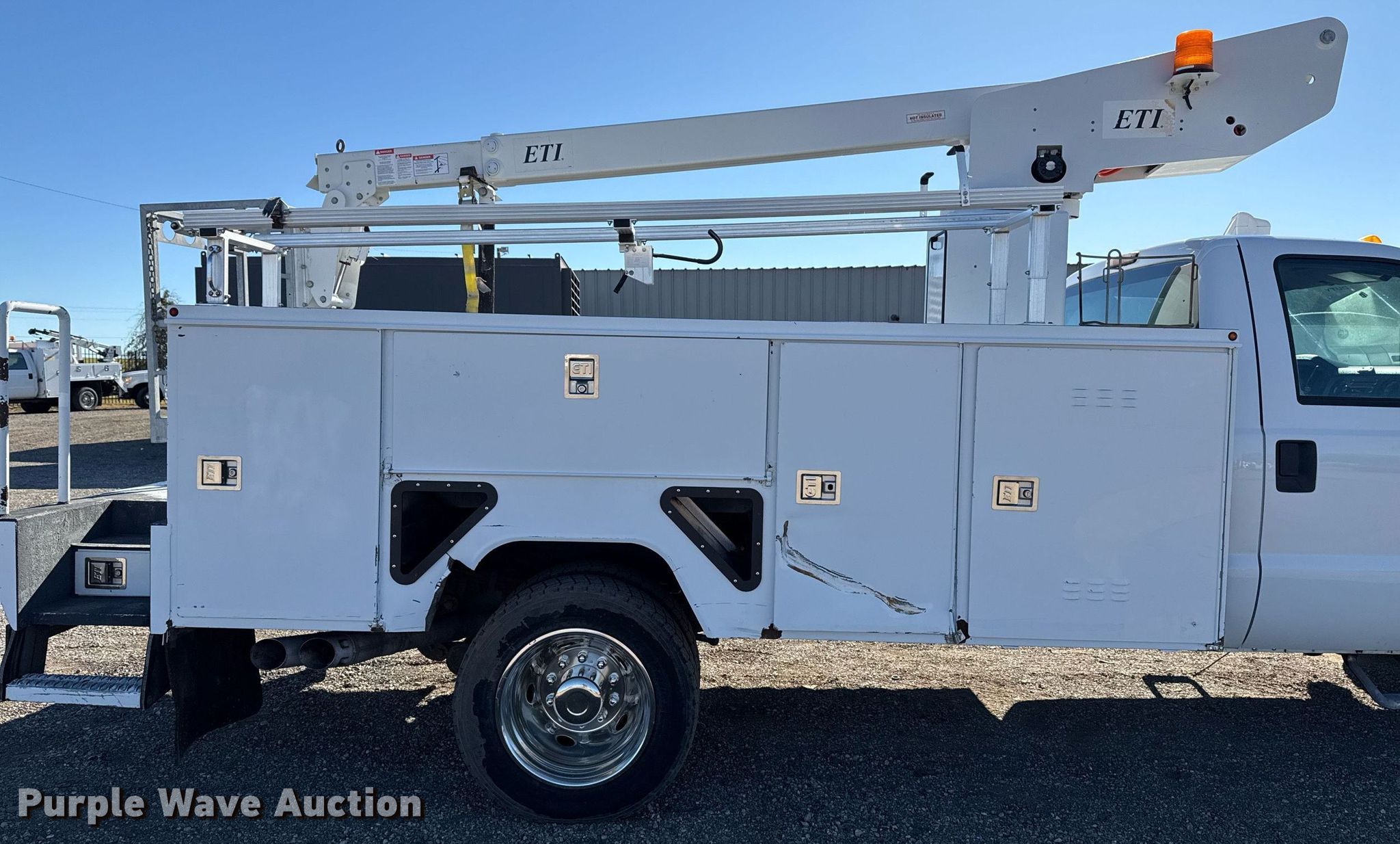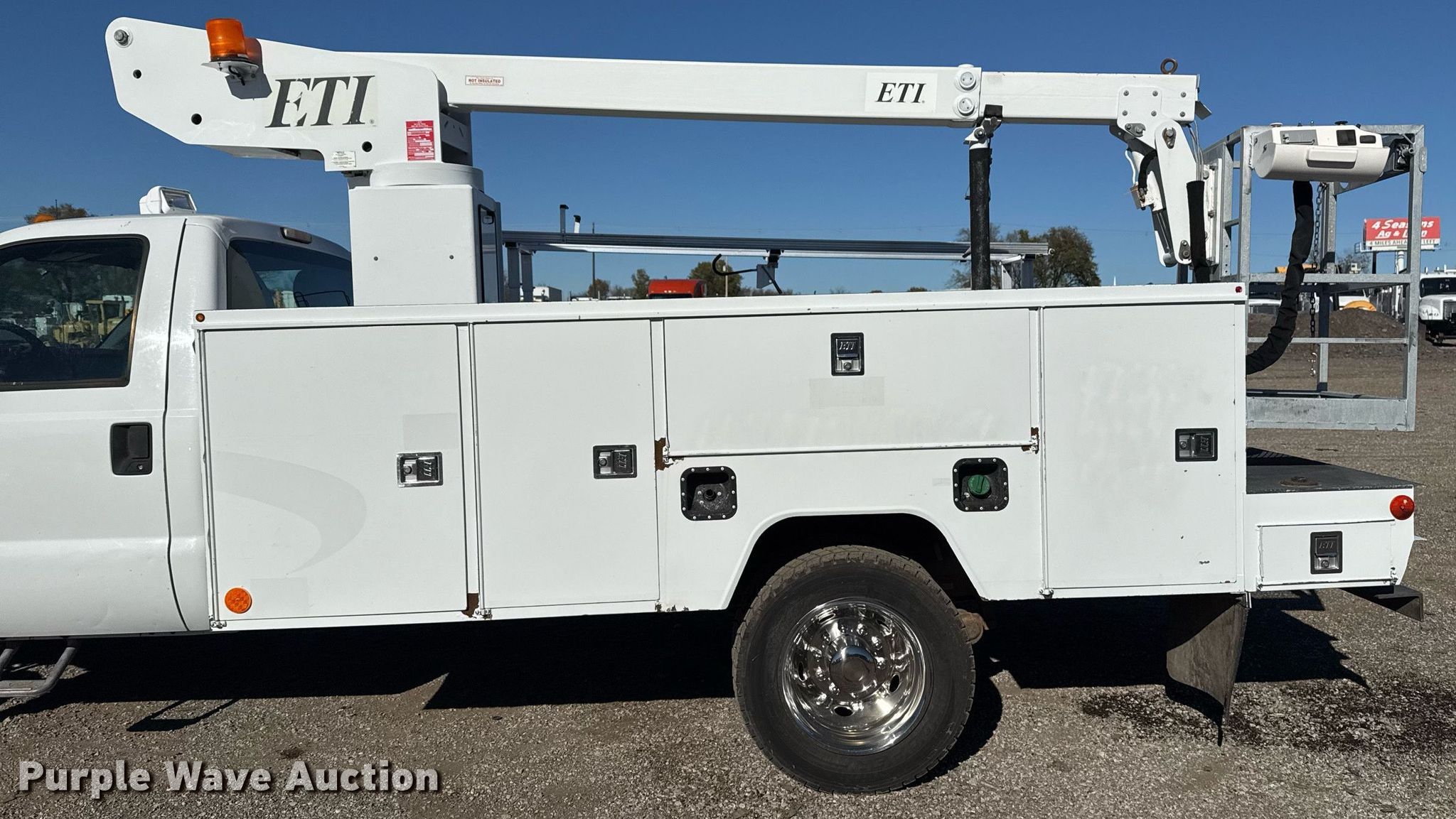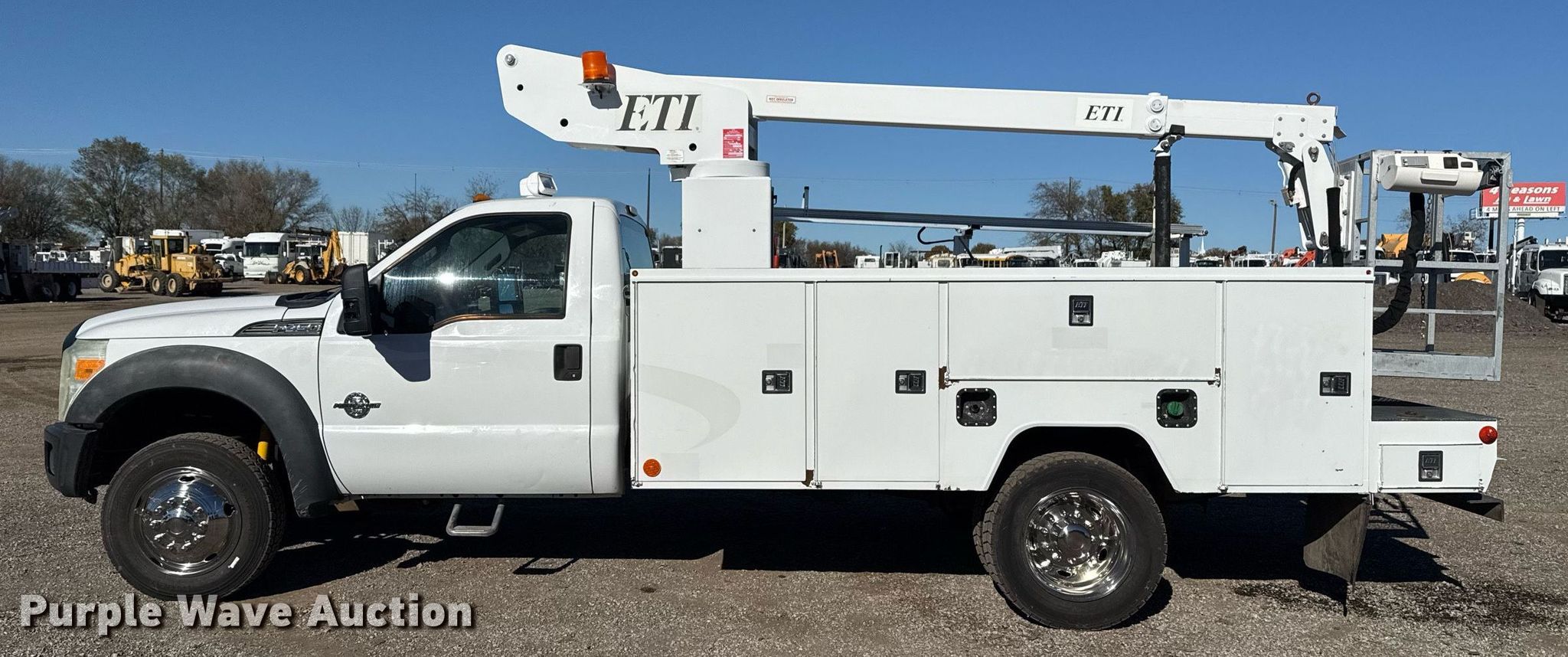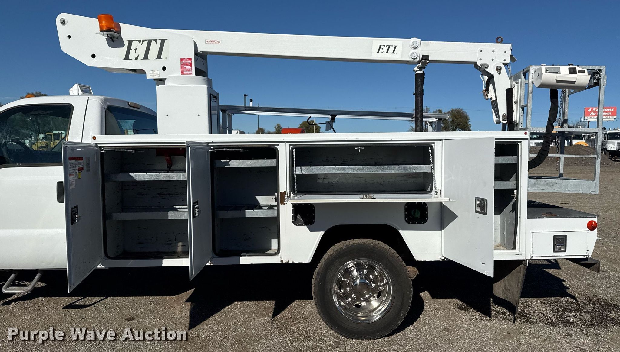 2011 Ford F450 Super Duty bucket truck. Miles: 126,428 on odometer, VIN: 1FDUF4GT0BED04549. Engine Displacement: 6.7L, Cylinders: 8, Fuel type: Diesel. Transmission Automatic. Chassis Axles: Single, Suspension: Spring, Brakes: Hydraulic, PTO, GVWR: 16,500 lbs, Wheelbase: 165". Interior AC, Heat, Heated mirrors, Power windows, Power locks, Cruise control, Auxiliary controls. Features Bed ETI, 13' L x 96" W, Boom 2011 ETI ETT29SNT, Serial: 0911T98577, Maximum lift capacity: 350 lbs, Maximum lift height: 29', Boom type: Articulating, Telescopic, Man basket, Boom controls Platform/ basket.. Tires Size: 225/70R19.5. Notes Windshield chipped or cracked, Hail damage. Oklahoma title. Title distribution may be delayed up to 14 days from verification of funds. Collinsville, OK 74021