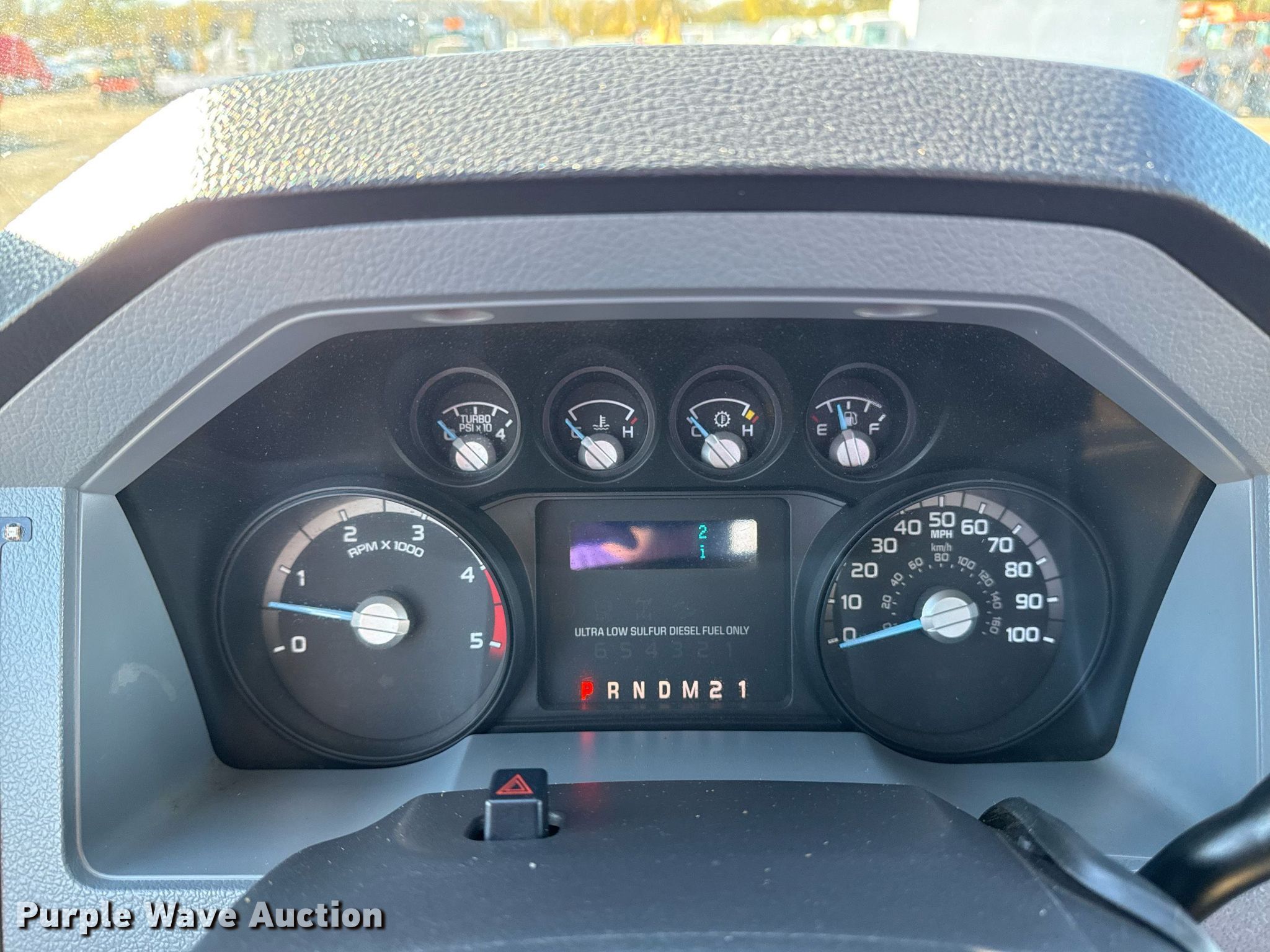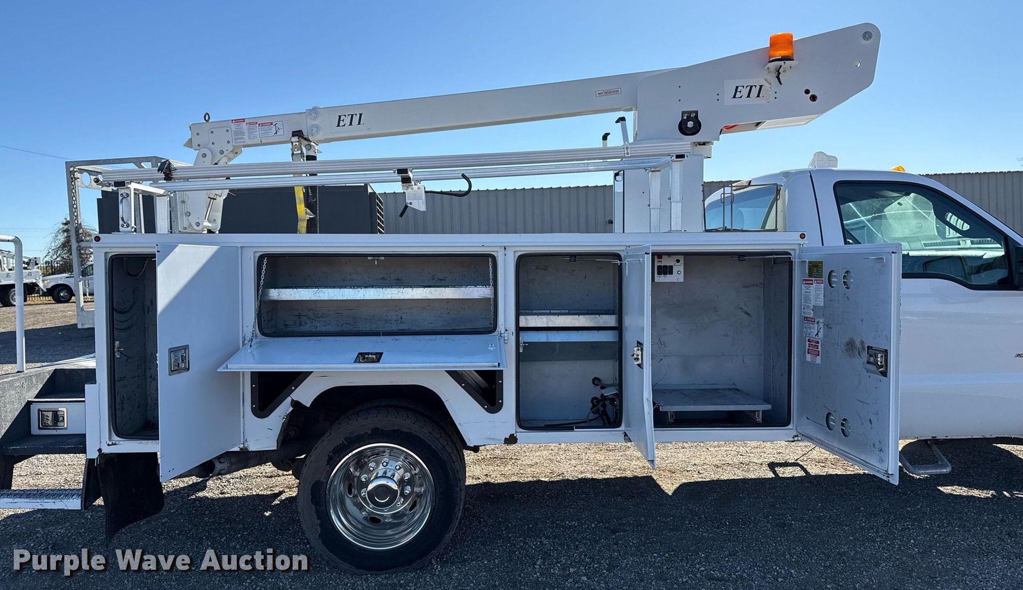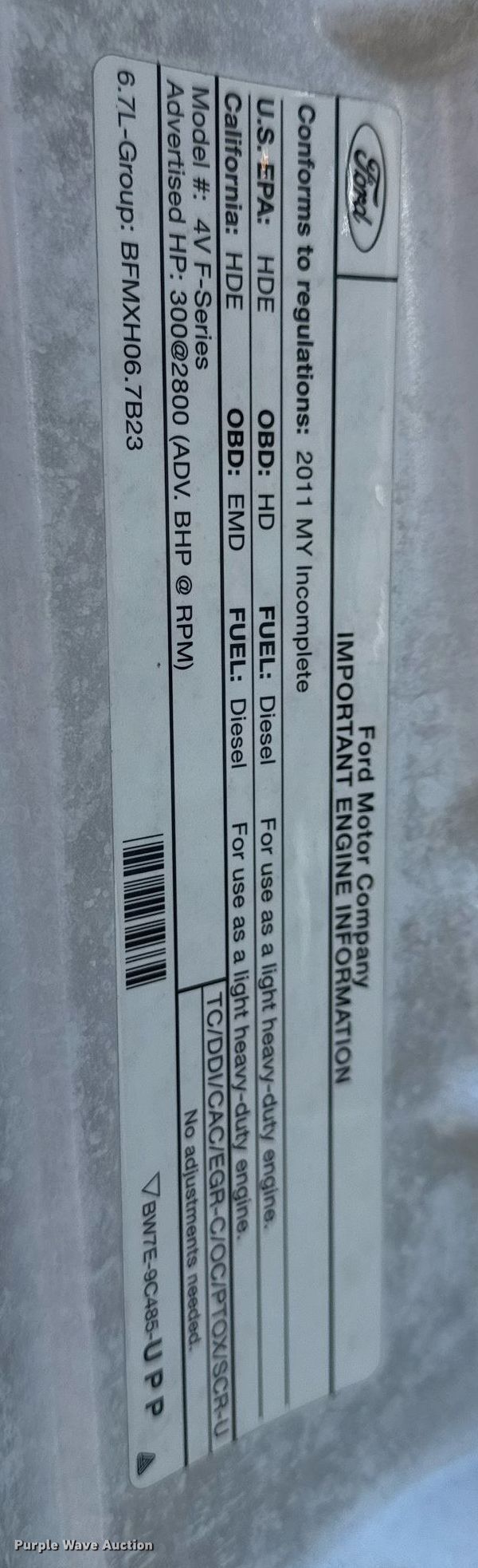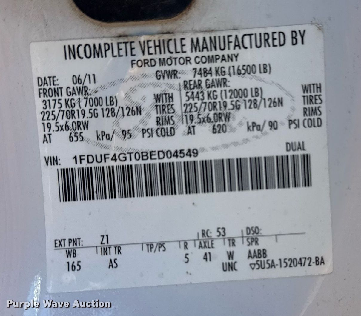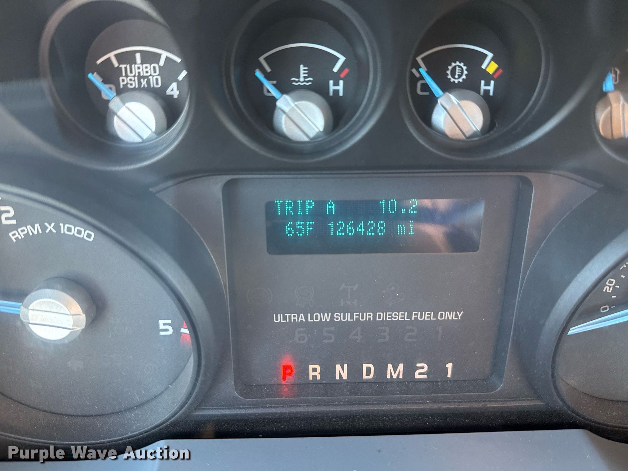 2011 Ford F450 Super Duty bucket truck. Miles: 126,428 on odometer, VIN: 1FDUF4GT0BED04549. Engine Displacement: 6.7L, Cylinders: 8, Fuel type: Diesel. Transmission Automatic. Chassis Axles: Single, Suspension: Spring, Brakes: Hydraulic, PTO, GVWR: 16,500 lbs, Wheelbase: 165". Interior AC, Heat, Heated mirrors, Power windows, Power locks, Cruise control, Auxiliary controls. Features Bed ETI, 13' L x 96" W, Boom 2011 ETI ETT29SNT, Serial: 0911T98577, Maximum lift capacity: 350 lbs, Maximum lift height: 29', Boom type: Articulating, Telescopic, Man basket, Boom controls Platform/ basket.. Tires Size: 225/70R19.5. Notes Windshield chipped or cracked, Hail damage. Oklahoma title. Title distribution may be delayed up to 14 days from verification of funds. Collinsville, OK 74021