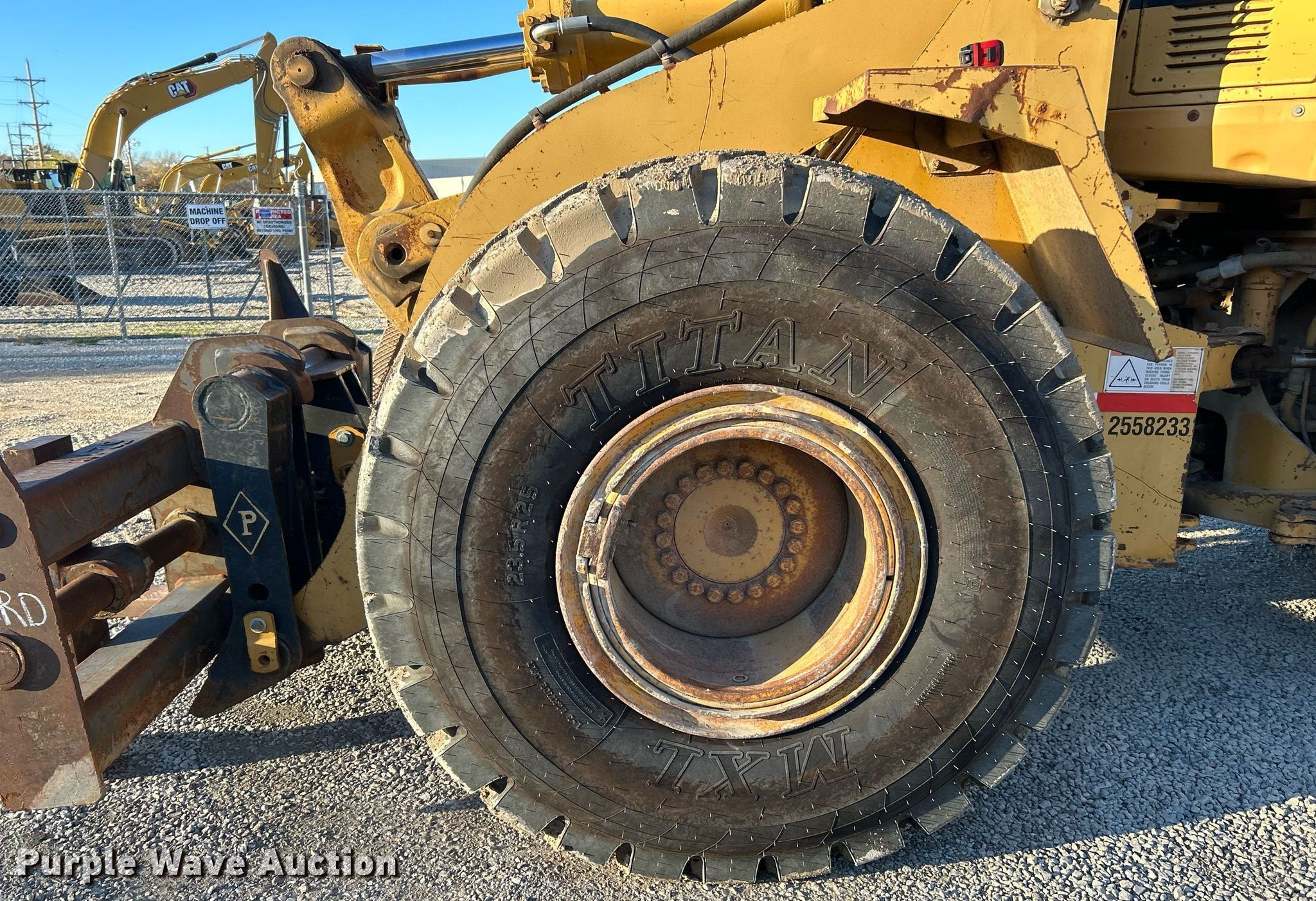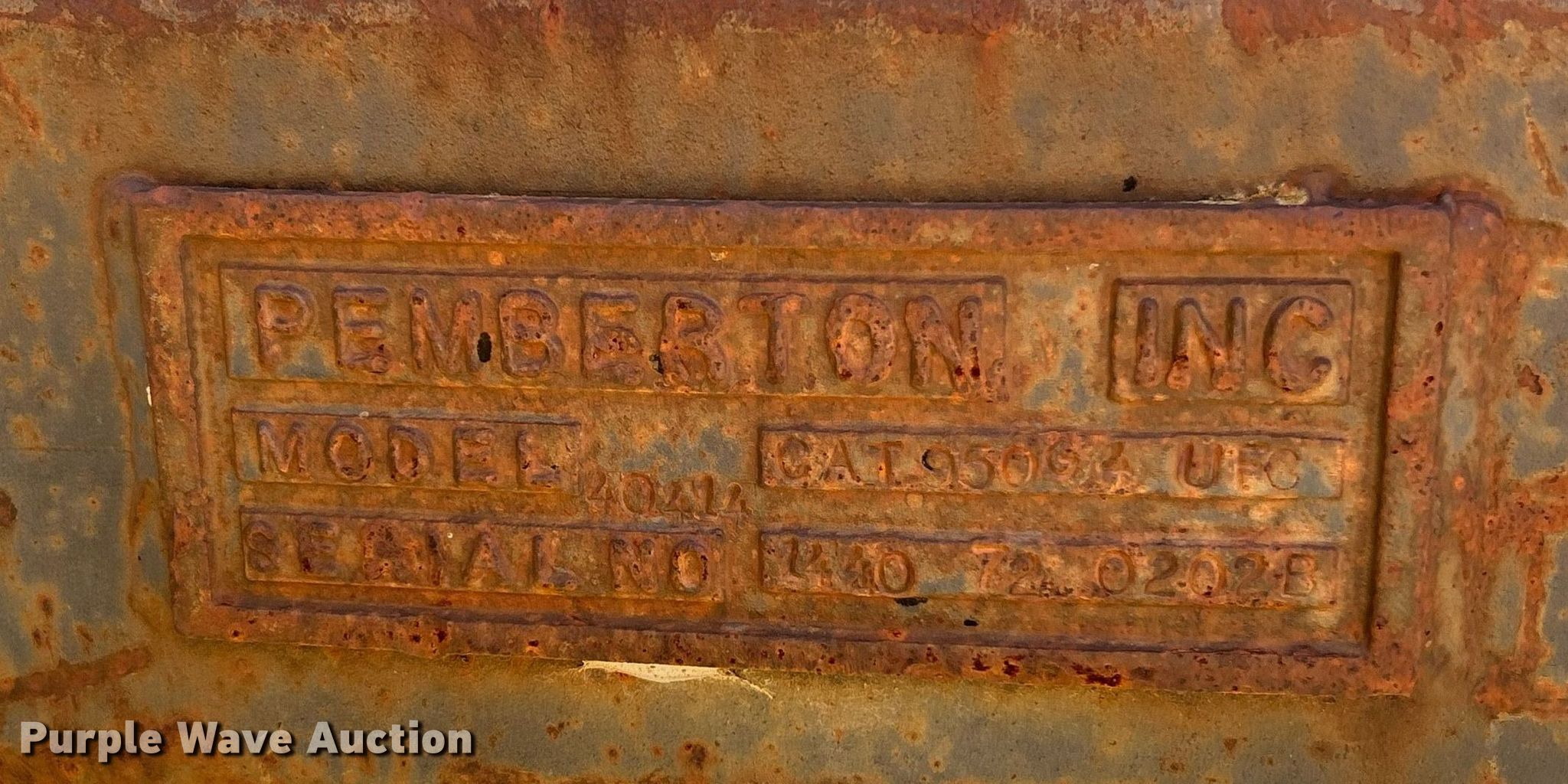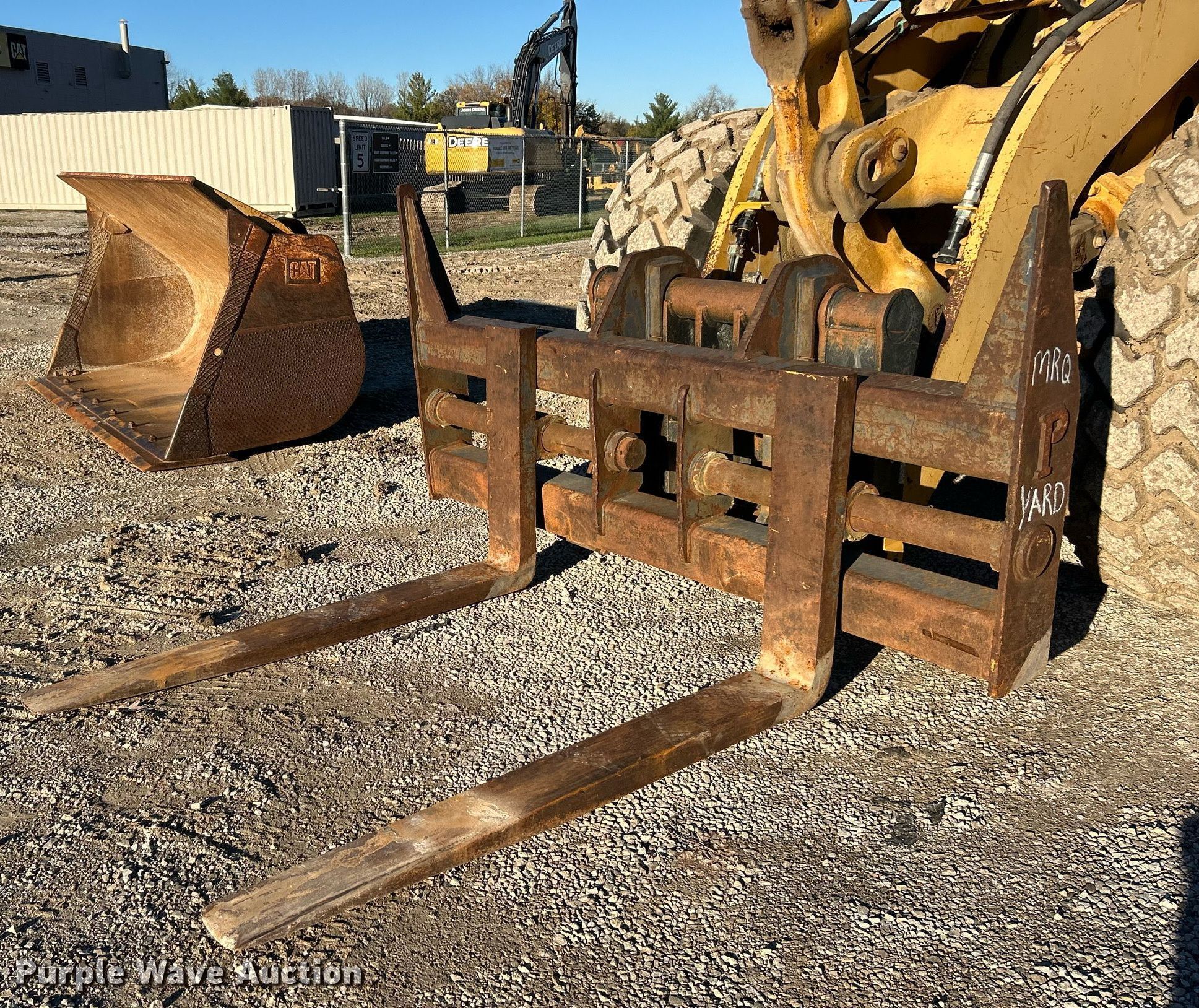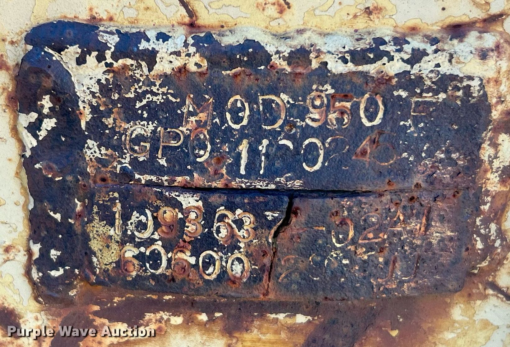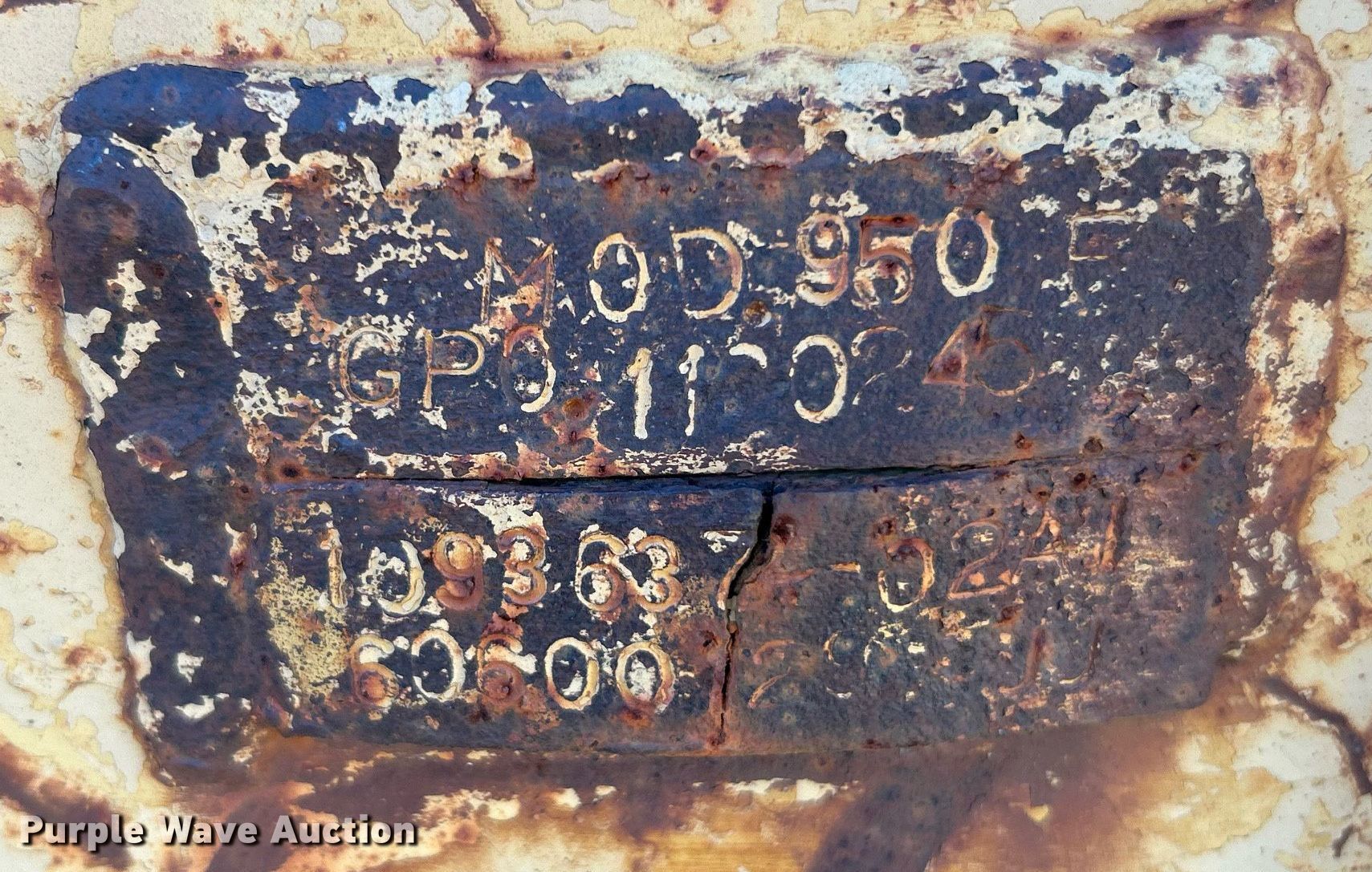1996 Caterpillar 950F Series II wheel loader. Hours: 19,442 on meter, Serial: 5SK02400, Unit #: US01014. Engine Caterpillar 3116, Cylinders: 6, Fuel type: Diesel. Transmission Powershift, 4F - 4R. Operators station Enclosed cab, AC, Heat, Bucket controls: Two-lever. Features Auxiliary hydraulics: Front, Quick coupler: Hydraulic, Bucket Caterpillar, Width: 108", Self- leveling bucket, Cutting edge: Bolt-on, Forks Pemberton, Length: 67". Tires Size: 23.5R25. Notes Glass cracked, Dead battery. Caterpillar Dealer Equipment. Hannibal, MO 63401