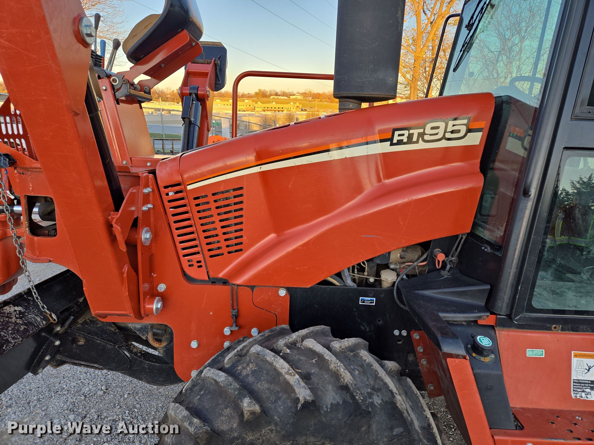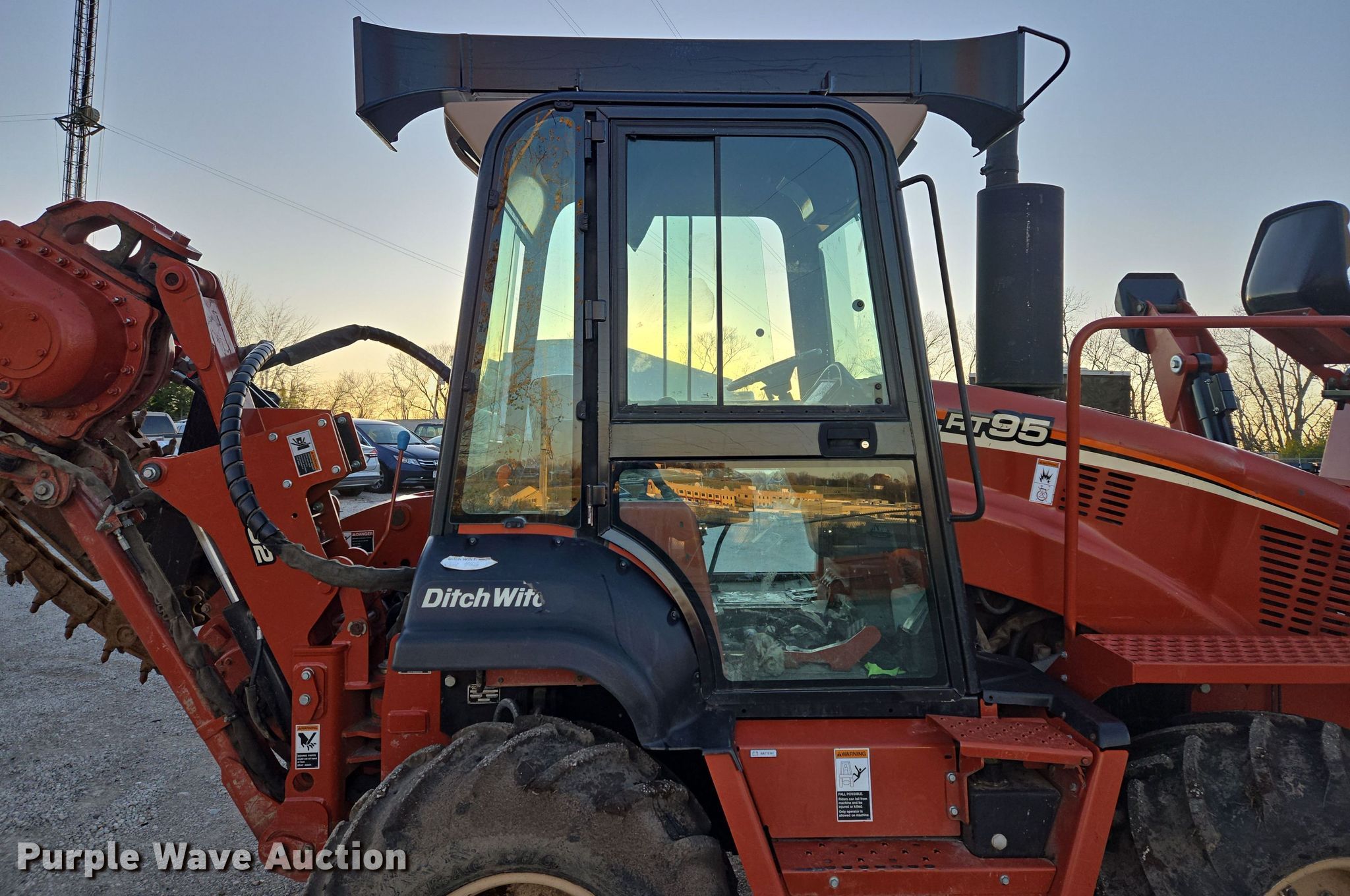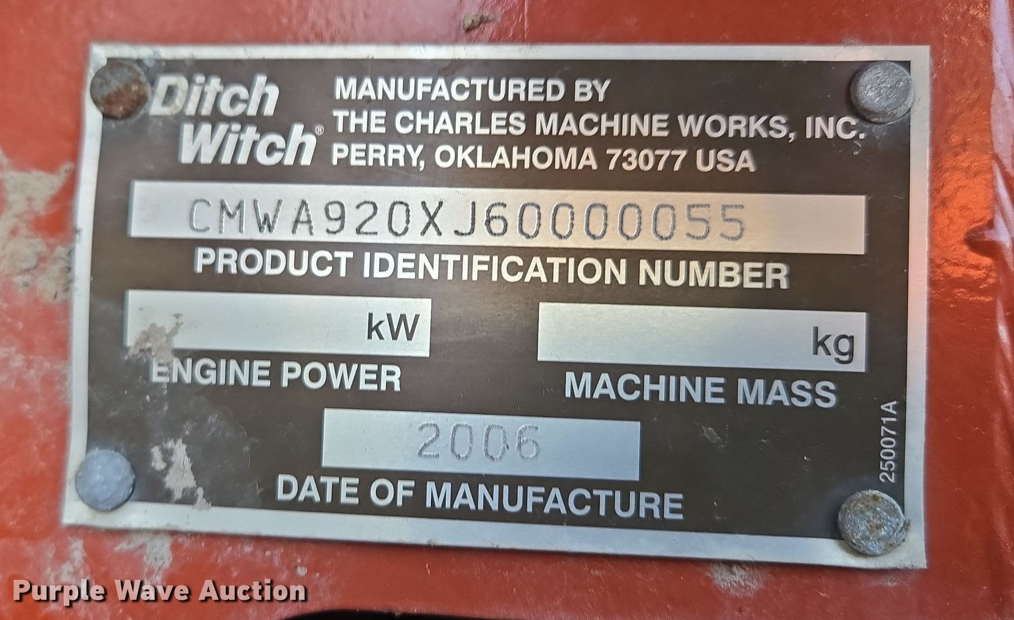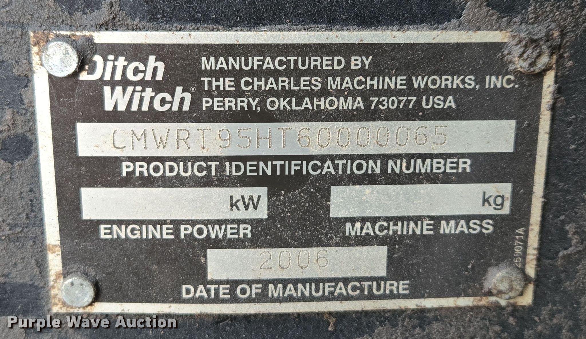 2006 Ditch Witch RT95 cable plow. Hours: 888 on meter, Serial: CMWRT95HT60000065. Engine John Deere PowerTech, Displacement: 4.5L, Cylinders: 4, Fuel type: Diesel. Transmission Hydrostatic, Two speed travel, Four wheel drive, Differential lock, Four wheel steer. Operators station Enclosed cab, AC, Heat. Features Combination unit, Trencher Model: H952, Serial: E60000059, Wheel diameter: 20", Cutting width: 8", Teeth: Rock, Crumber, Vibratory plow Model: H952, Serial: CMWH952XE60000059, Backhoe Model: A920, Serial: CMWA920XJ60000055, Bucket width: 18", Backfill blade Width: 80". Tires Size: 38x18.00-20. Notes Missing floor panel in cab. Lucky's Tow Service LLC. Liberty, MO 64068