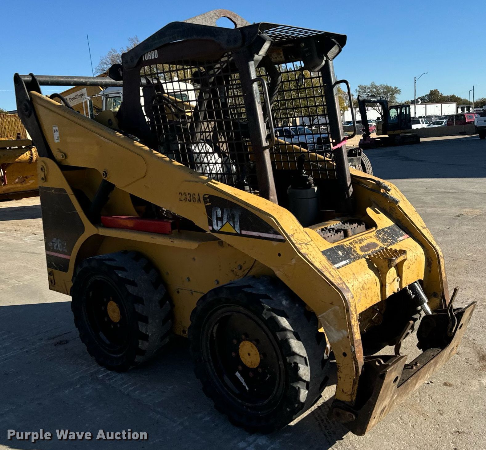2003 Caterpillar 262 skid steer loader. Hours: 5,745 on meter, Serial: CAT00262ACED02229. Engine Perkins, Cylinders: 4, Fuel type: Diesel. Transmission Hydrostatic. Operators station OROPS, Bucket control: Hand. Features Auxiliary hydraulics, Quick coupler: Manual, Bucket Caterpillar, Width: 74", Cutting edge: Bolt-on, Forks Caterpillar, Length: 46". Tires Size: 38x12-20, Solid. Dondlinger & Sons Construction. Wichita, KS 67217