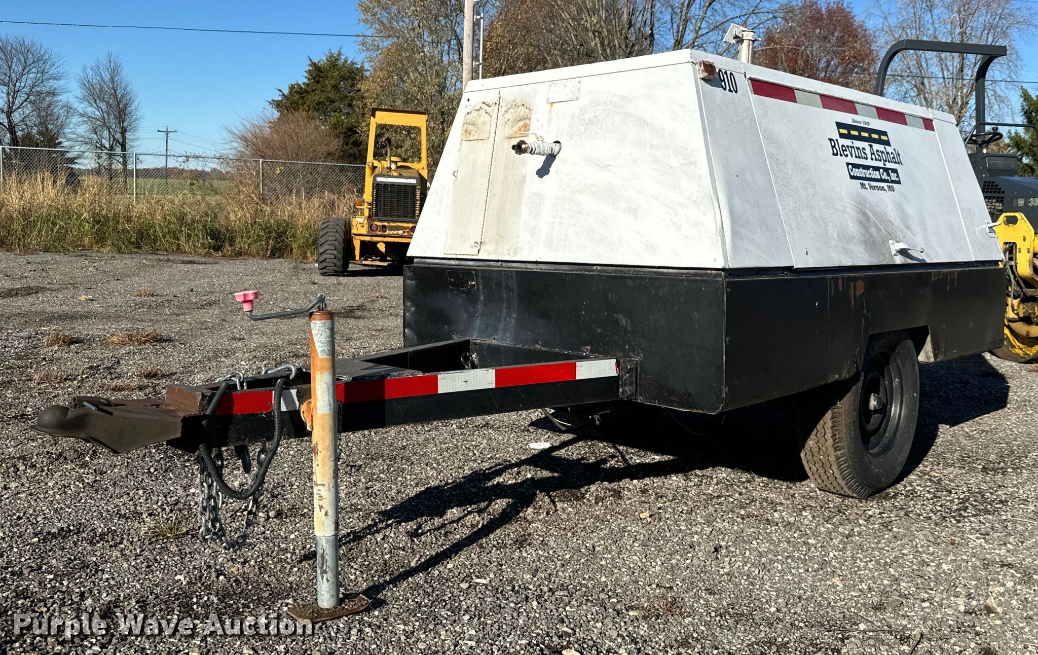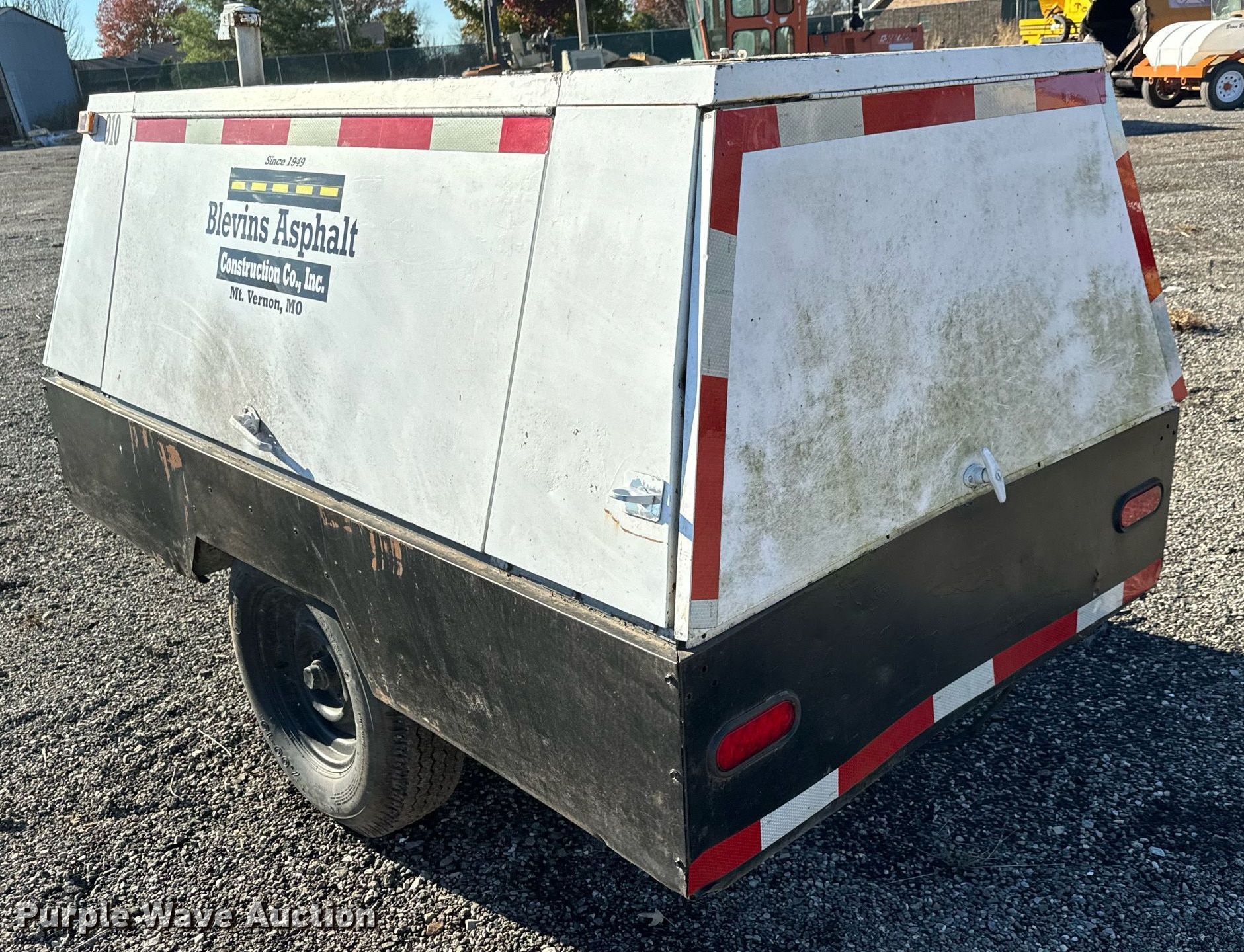 Cooper Industries D0190ER7A air compressor. Hours: 1,908 on meter, Serial: 1903977. Engine Cylinders: 4, Fuel type: Diesel. Features Air compressor CFM: 190, PSI: 100. Trailer 12.5' L x 56" W, Ball hitch size: 2 5/16", Suspension: Spring, Axles: Single, Tire size: 7.00-15. Notes Unknown operating condition. This is worksite support equipment and will not come with a title. Transfer of ownership documentation will be a bill of sale. Blevins Asphalt Construction Company Inc.. Mount Vernon, MO 65712