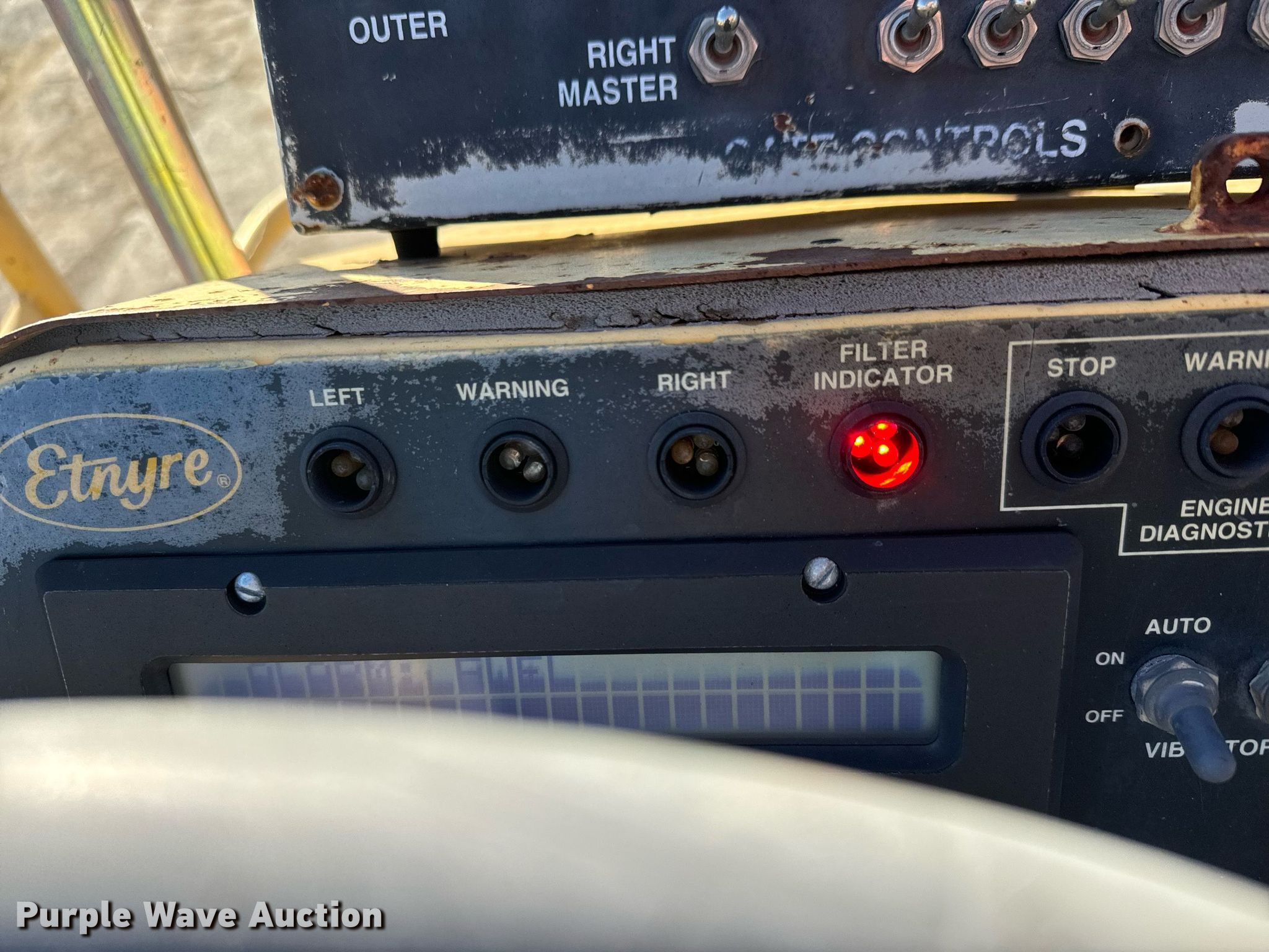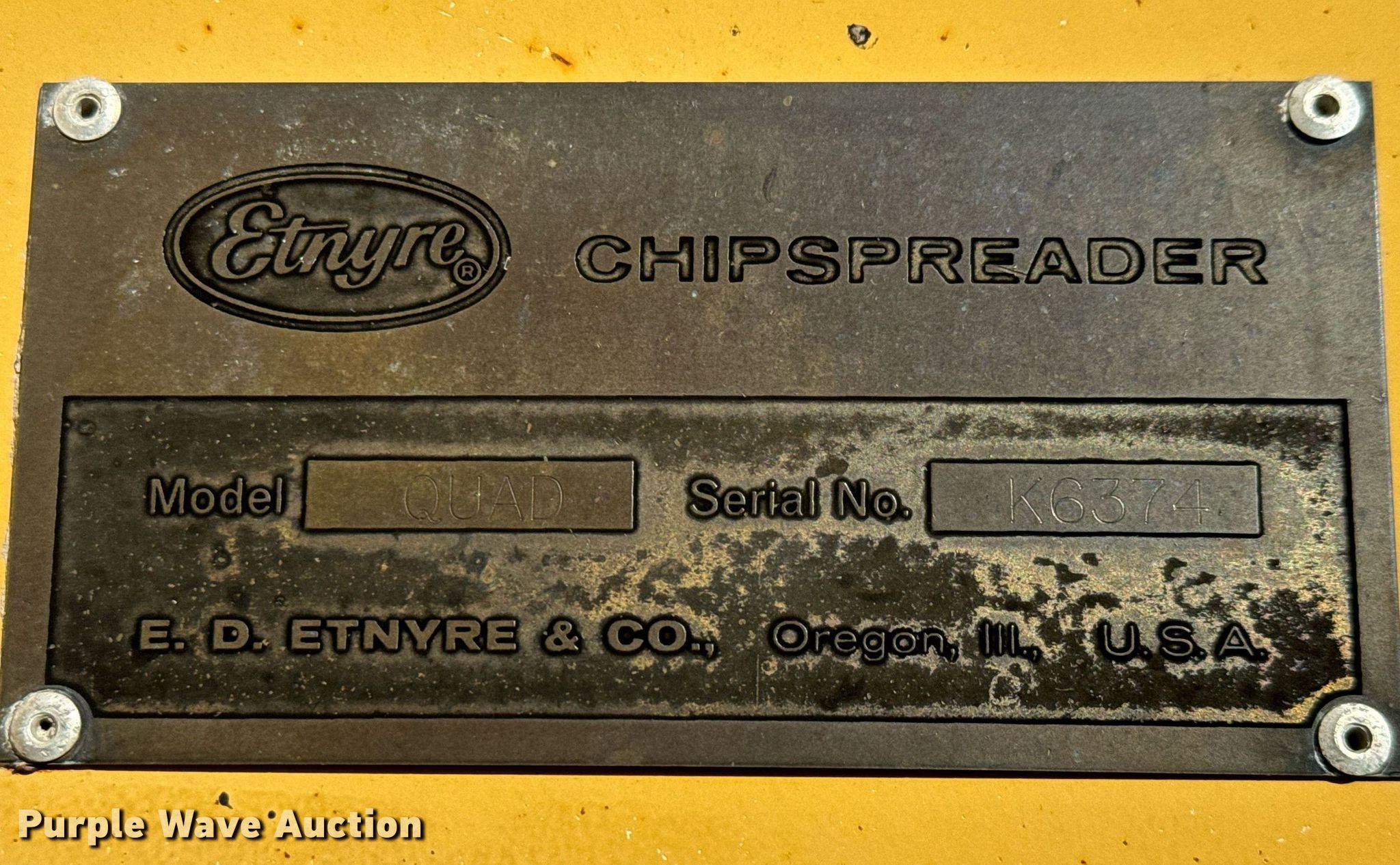 2008 Etnyre QUAD chip spreader. Hours: Unknown, Serial: K6374. Engine Cylinders: 6, Fuel type: Diesel. Transmission Hydrostatic. Features Spreader width: 12' to 24', Material conveyor Width: 24", Hopper Width: 11' 2". Tires Size: 385/65R22.5. Notes Warning indicator: Filter. Blevins Asphalt Construction Company Inc.. Mount Vernon, MO 65712