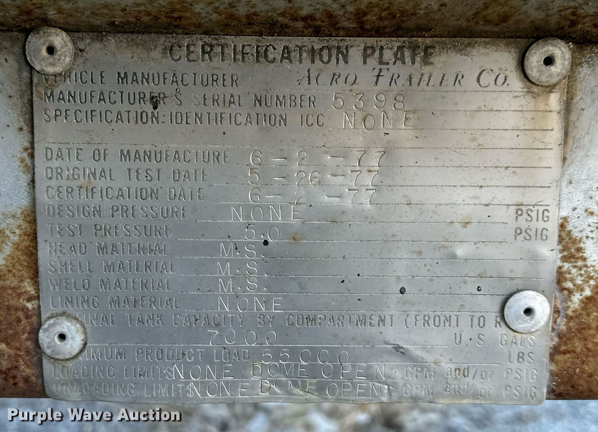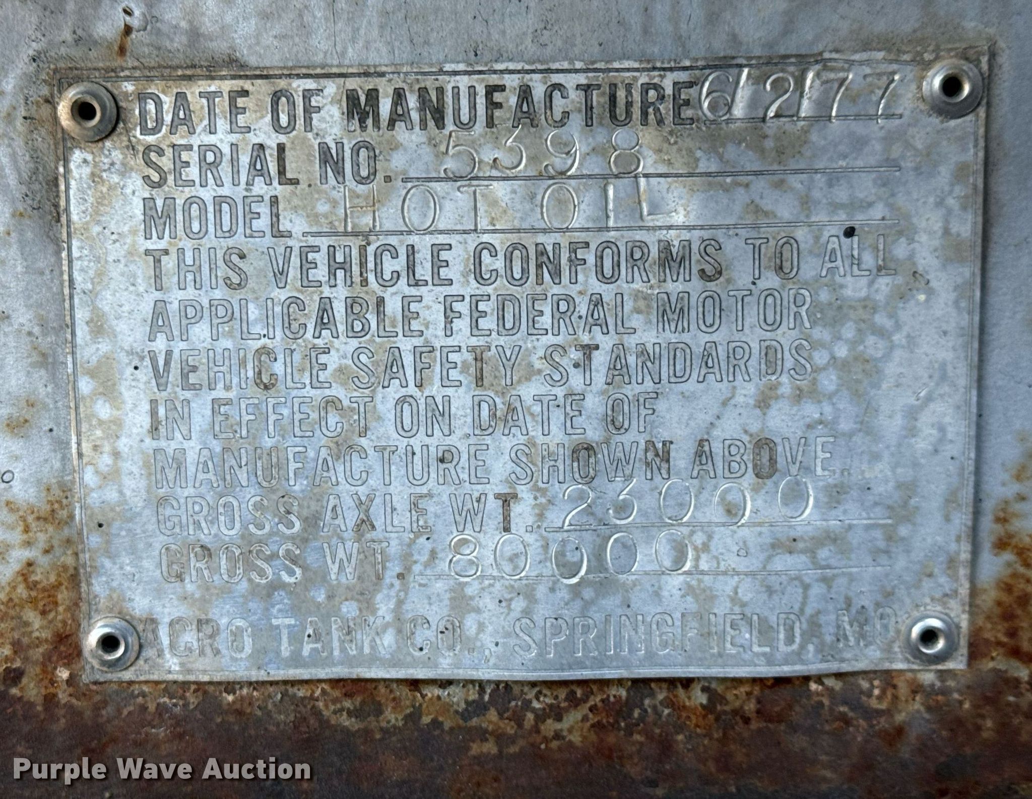 Purple Wave is selling a used Tank Trailer in Missouri. This item is a 1977 Acro Hot Oil tank trailer with the following: VIN: 5398, Unit #: 101