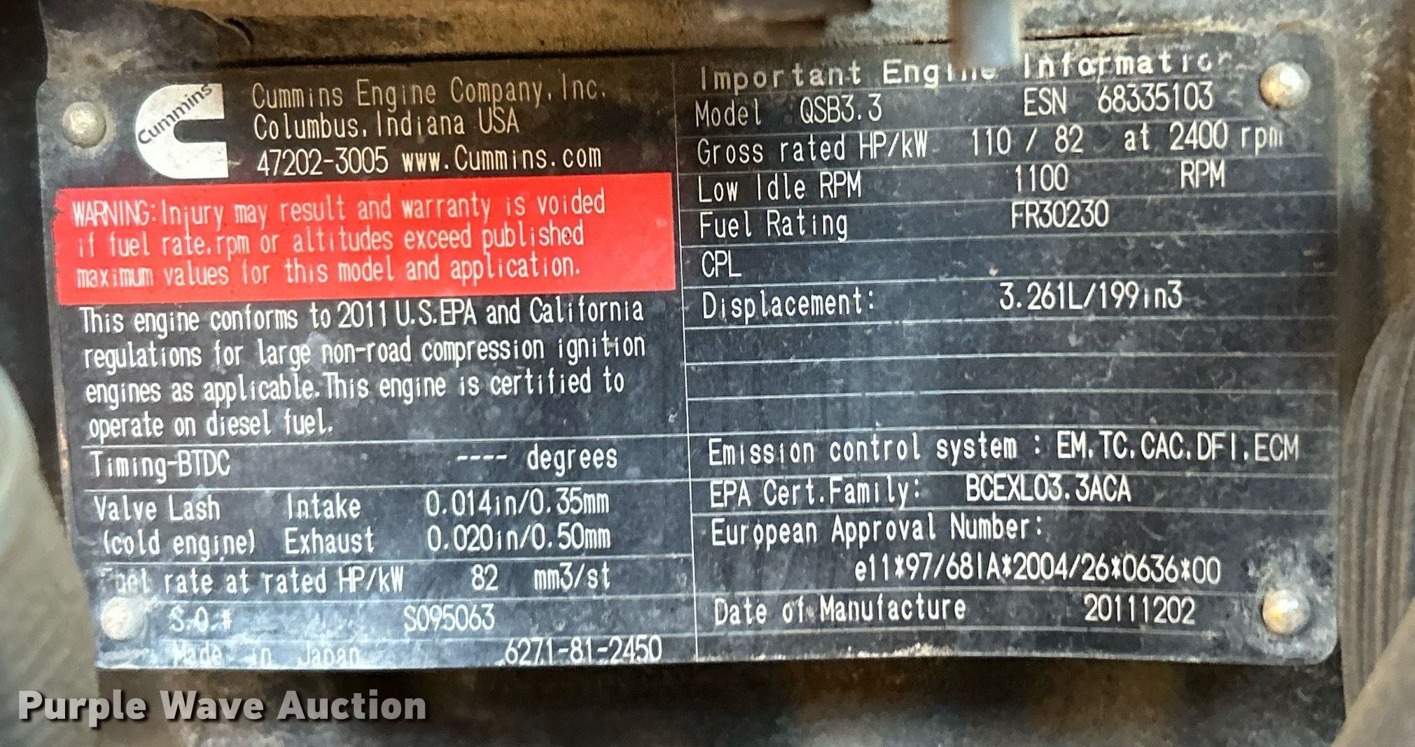 2012 JLG 10054 telehandler. Hours: 5,096 on meter, Miles or hours may vary, unit still in use, Serial: 0160044011. Engine Cummins QSB3.3, Displacement: 3.261L, Cylinders: 4, Fuel type: Diesel. Transmission Powershift, Four wheel drive. Operators station Steering: Crab, Four wheel. Features Maximum lift capacity: 10,000 lbs, Maximum lift height: 54', Boom stages: 4, Fork length: 47", Hydraulic outriggers, Hydraulic leveling. Tires Size: 400/75-28, Foam filled. Empower Rental Group. Lenoir City, TN 37771