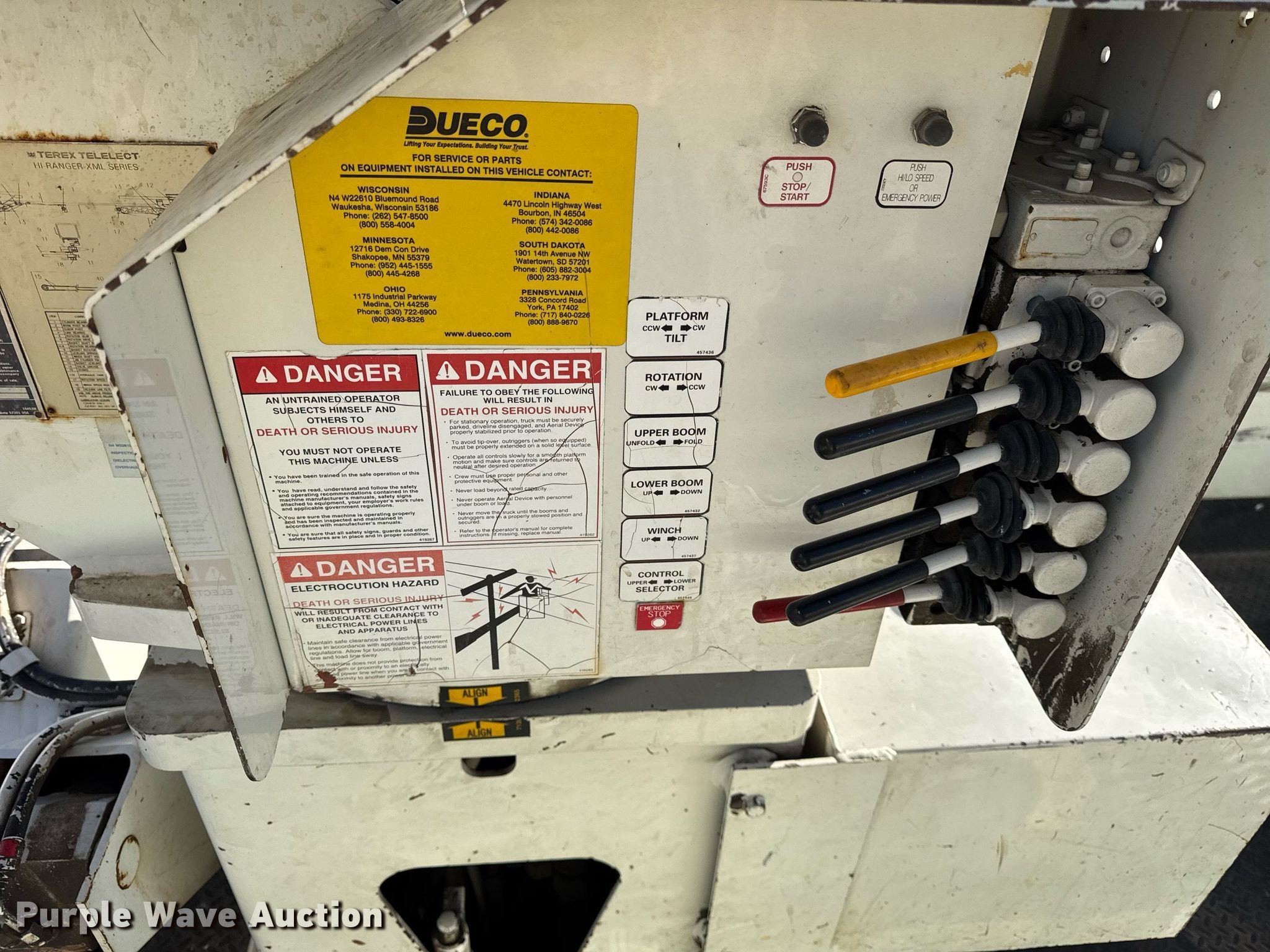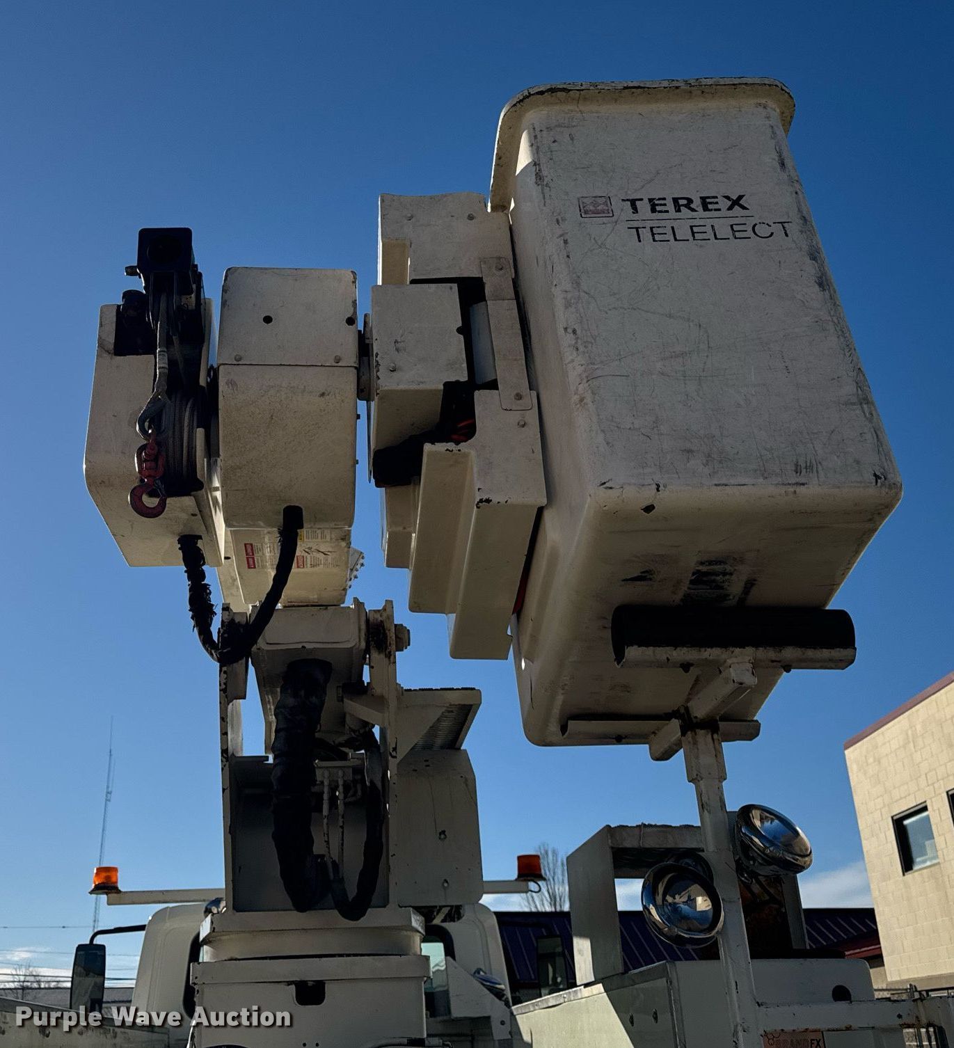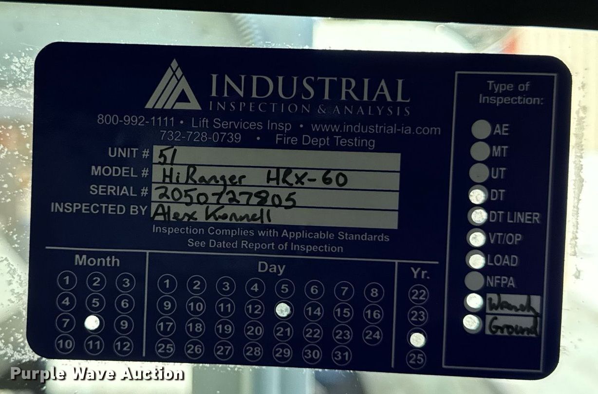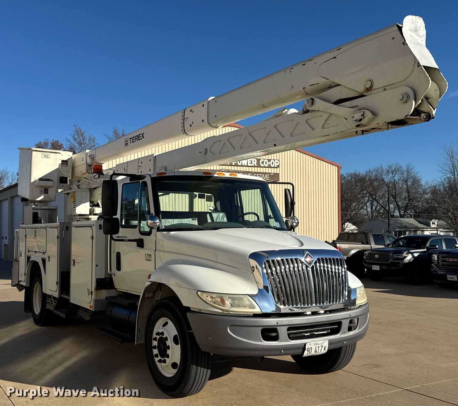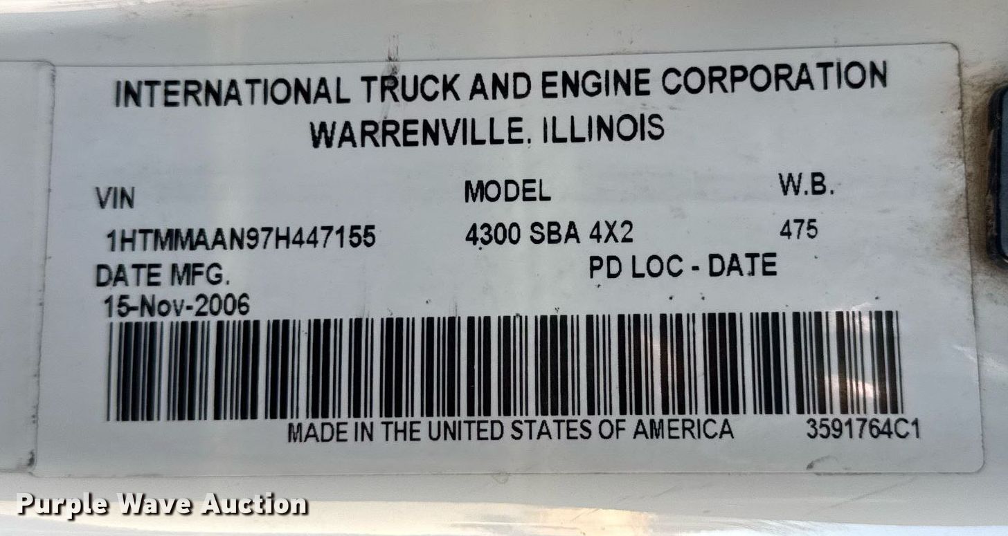 2007 International 4300 bucket truck. Miles: 119,817 on odometer, Hours: 3,279 on meter, VIN: 1HTMMAAN97H447155, Unit #: 51. Engine International DT466, Displacement: 7.6L, Cylinders: 6, Fuel type: Diesel. Transmission Automatic. Chassis Axles: Single, Suspension: Spring, Brakes: Air, PTO, GVWR: 33,000 lbs. Interior AC, Heat, Cruise control, Brake controller. Features Bed BRANDFX, Serial: 07 18458, 14' L x 98" W, Boom 2005 Terex Hi-Ranger HRX-60, Maximum lift capacity: 700 lbs, Maximum lift height: 60', Boom type: Articulating, Insulated, Man basket, Boom controls Ground, Platform/ basket, Material handler, Certification valid through: 08/2025. Tires Size: 11R22.5. Illinois title. Title distribution may be delayed up to 14 days from verification of funds. McDonough Power Cooperative. Macomb, IL 61455