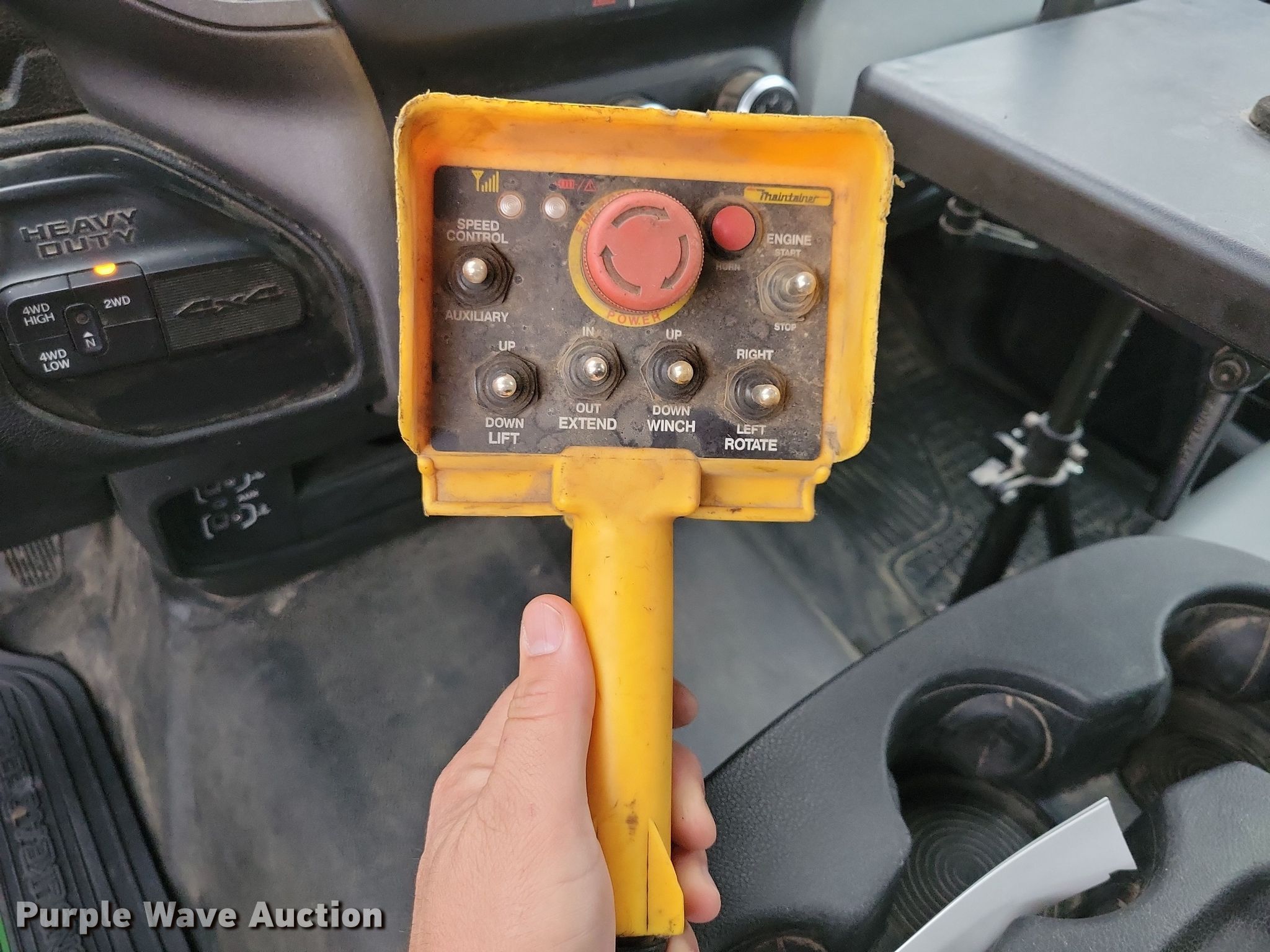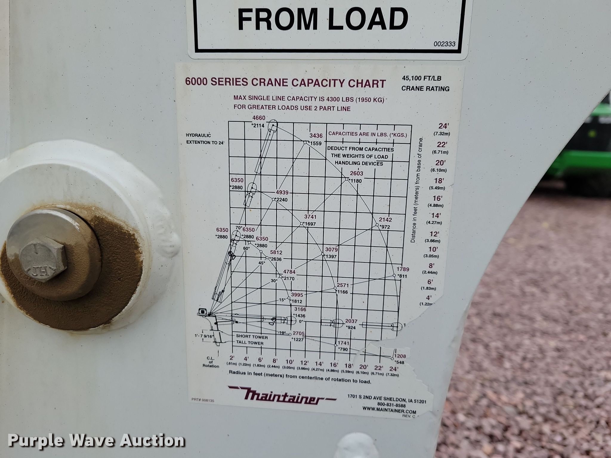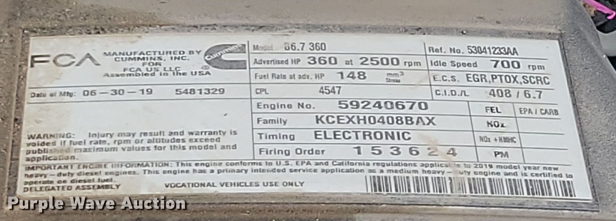 2019 Dodge Ram 5500HD utility / service truck. Miles: 49,474 on odometer, Hours: 2,353 on meter, VIN: 3C7WRNBL1KG599478. Engine Cummins B6.7 360, Displacement: 6.7L, Cylinders: 6, Fuel type: Diesel, HP: 360. Transmission Automatic. Chassis Four wheel drive, Axles: Single, Suspension: Spring, Brakes: Hydraulic, PTO, GVWR: 19,500 lbs. Interior AC, Heat, Heated mirrors, Power windows, Power locks, Cruise control, Auxiliary controls, Brake controller. Features Bed Maintainer, 16' 6" L x 95" W, Generator John Deere AC-G8000S-E, Hours: 747 on meter, Fuel type: Gas, 240V outlets: 2, 120V outlets: 4, Watts: 6,900, Air compressor, Crane Maintainer 6000ST, Maximum boom length: 24' Maximum lift capacity: 6,350 lbs.. Tires Size: 225/70R19.5. Notes Air compressor issues, Dash warning indicator: Check engine. Iowa title. Title distribution may be delayed up to 14 days from verification of funds. AVE-PLP LLC. Le Mars, IA 51031