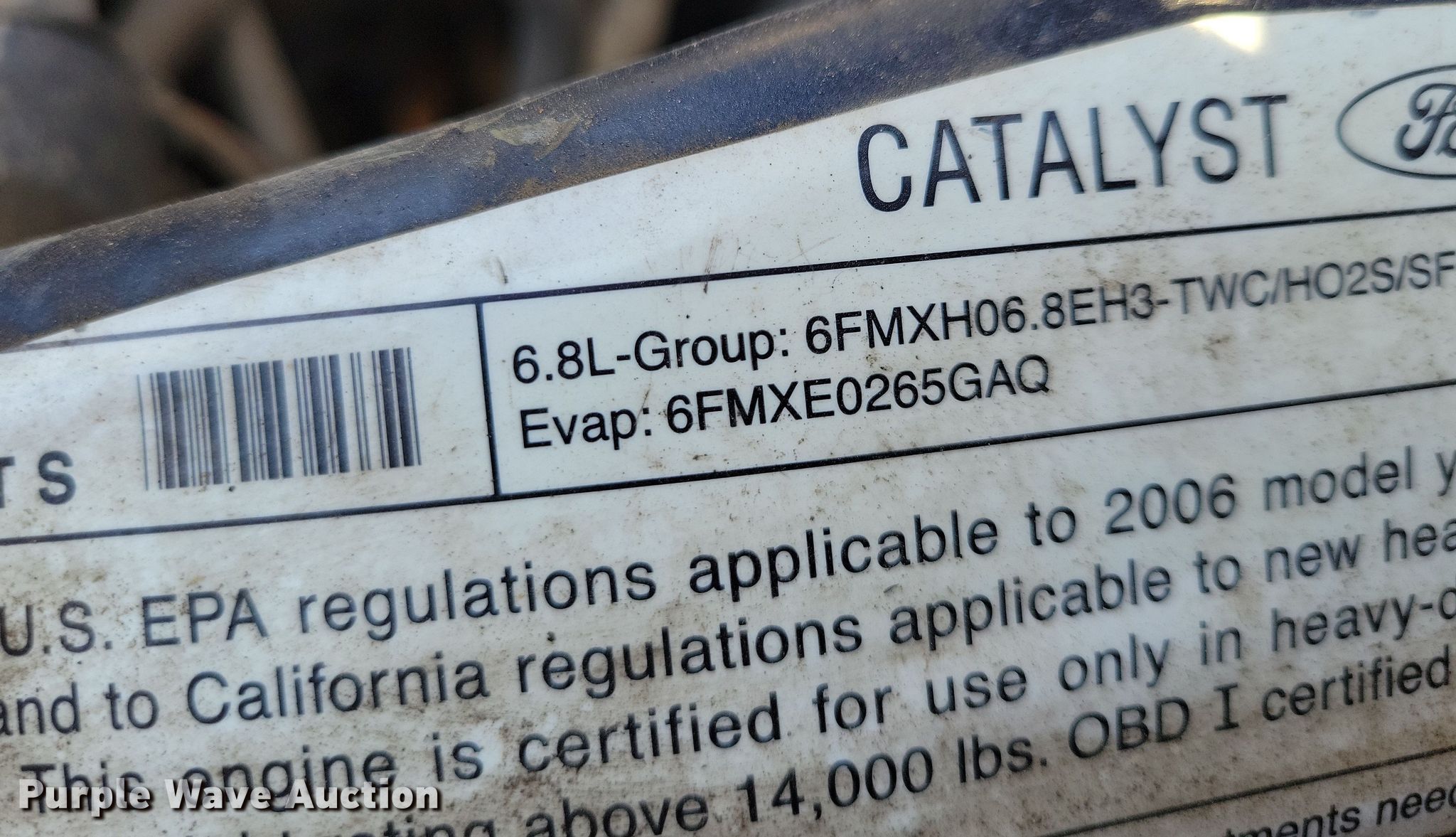 2006 Ford F450 Super Duty XL dump truck. Miles: 69,052 on odometer, VIN: 1FDXF47Y76ED83751. Engine Displacement: 6.8L, Cylinders: 10, Fuel type: Gas. Transmission Automatic. Chassis Axles: Single, Suspension: Spring, Brakes: Hydraulic, GVWR: 16,000 lbs FAWR: 6,500 lbs, RAWR: 12,000 lbs, Wheelbase: 165". Interior AC, Heat. Features Dump bed 11' L x 96" W, Side height: 12", Side board height: 29", Bed type: Steel, Roll tarp. Tires Size: 225/70R19.5. Notes Dash warning indicator: Check engine, Exhaust leak. South Dakota title. Title distribution may be delayed up to 14 days from verification of funds. Brandon, SD 57005