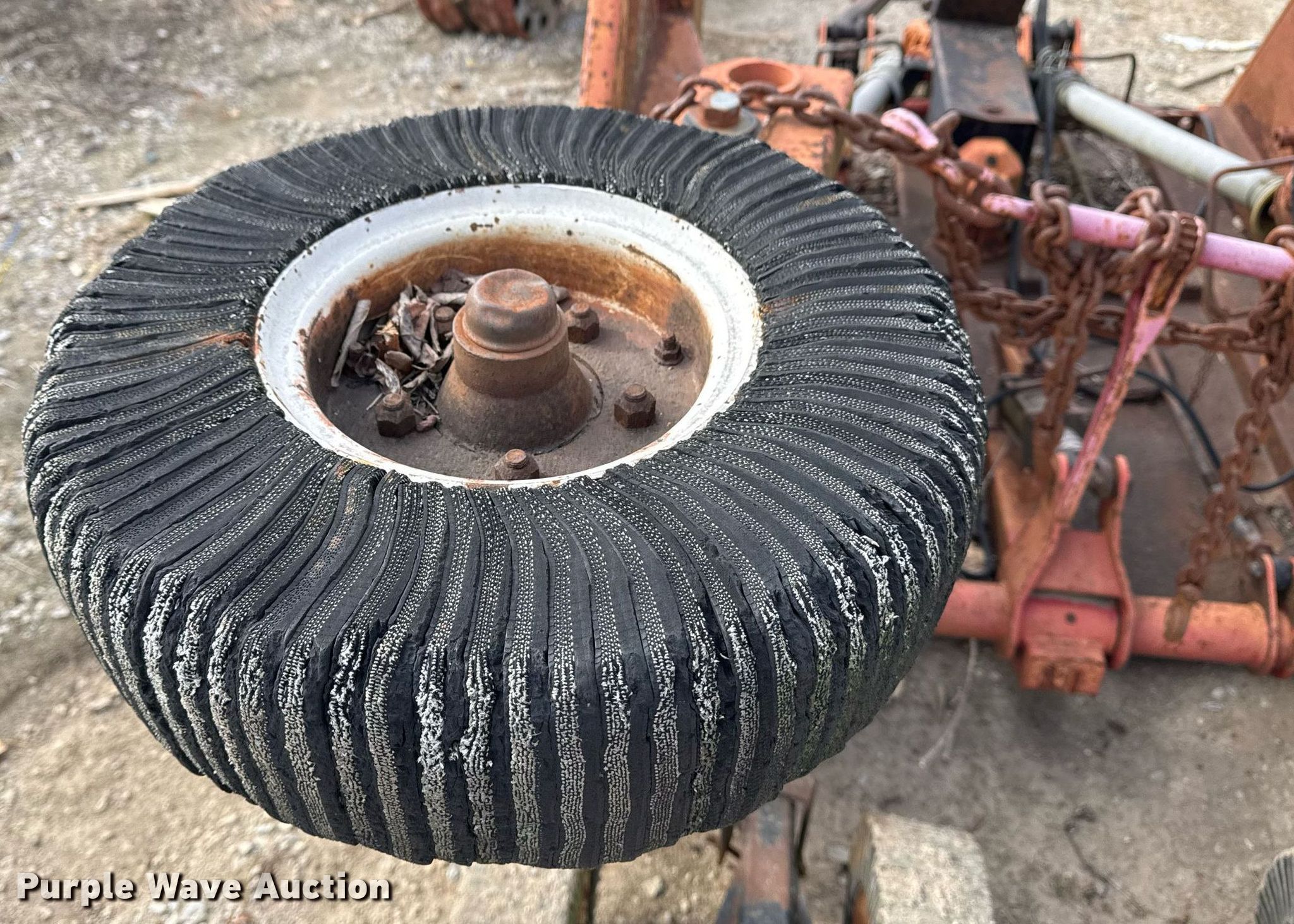 Brush Hog 7030 batwing rotary mower. Serial: B92107234. Features Width: 14', Hydraulic fold, PTO: 540. Tires Solid. Notes PTO half shaft missing, PTO components missing, Passenger side rear axle damaged, Unknown operating condition. Ira Green Construction - Open Inspection December 18, 2024. Claremore, OK 74017