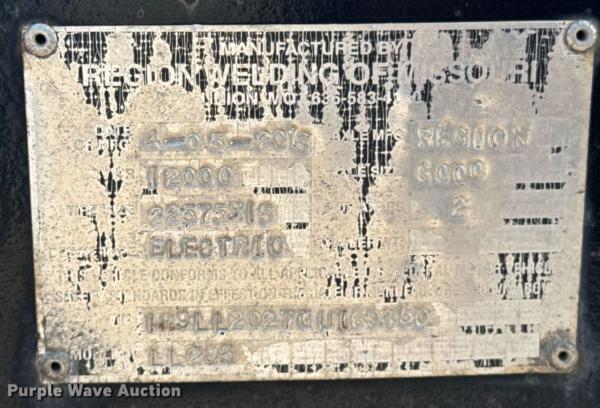 Purple Wave is selling a used Equip. Trailer in Missouri. This item is a 2016 Region Welding Load-N-Lift equipment trailer with the following: VIN: 1R9LL2027GU169450