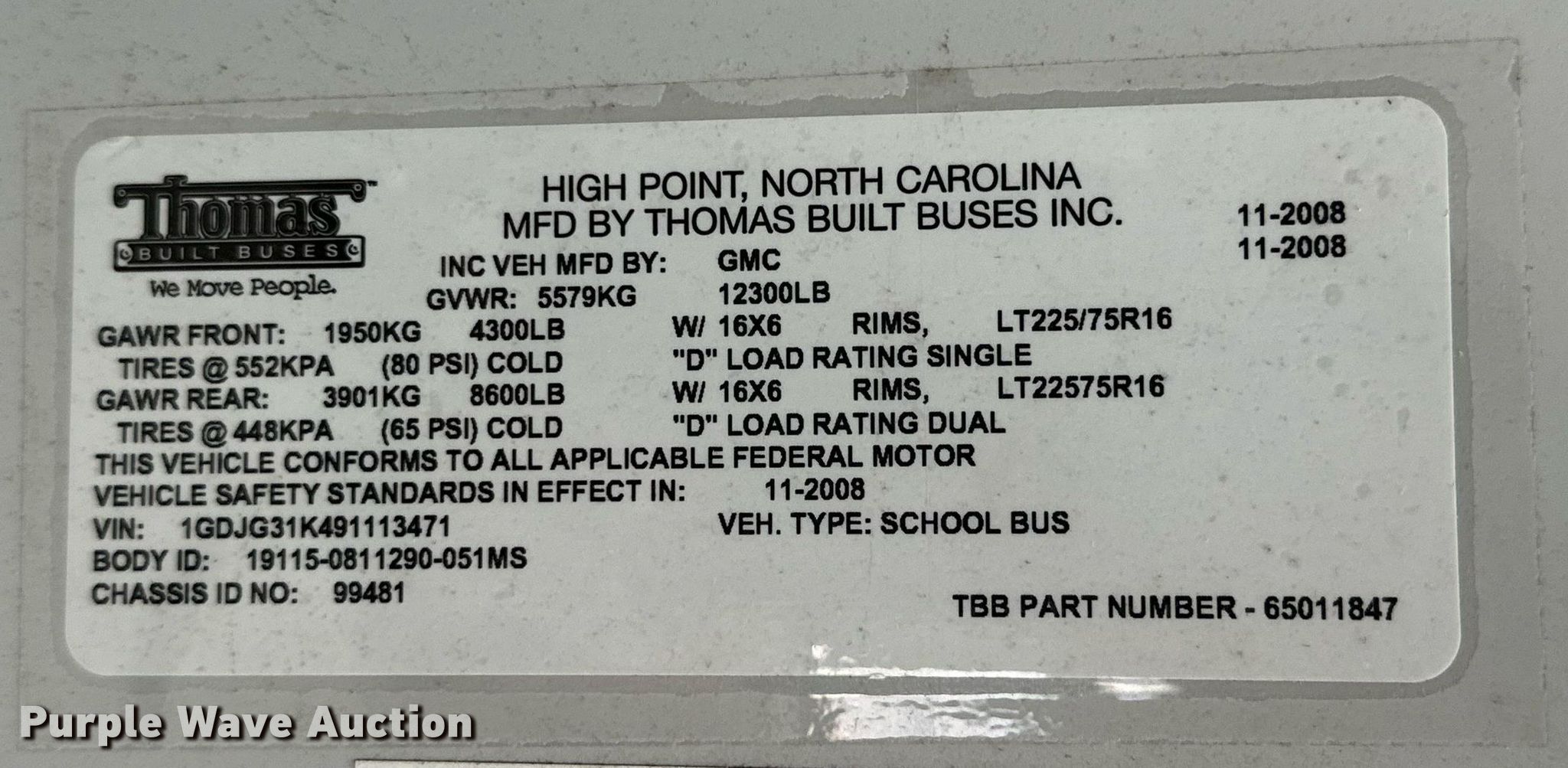 2009 GMC Savana school bus. Miles: 68,148 on odometer, VIN: 1GDJG31K491113471. Engine Displacement: 6.0L V8 OHV, Cylinders: 8, Fuel type: Gas. Transmission Automatic. Chassis Axles: Single, Suspension: Spring, Brakes: Hydraulic, GVWR: 12,300 lbs. Interior AC, Heat, Heated mirrors, Auxiliary controls, Passengers: 19. Tires Size: 225/75R16. Notes Dash warning indicator: Check engine. Oklahoma title. Title distribution may be delayed up to 14 days from verification of funds. Mangum Public schools. Mangum, OK 73554