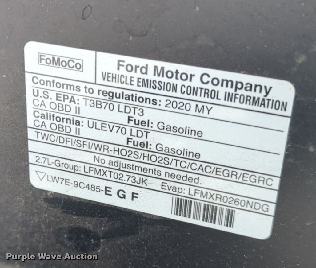 2020 Ford F150 SuperCrew pickup truck. Miles: 101,091 on odometer, VIN: 1FTEW1CP8LKE26224, Unit #: 103164. Engine Displacement: 2.7L V6 DOHC, Cylinders: 6, Fuel type: Gas. Transmission Automatic. Interior AC, Heat, Seat: Power driver, Power windows, Power locks, Cruise control, Backup camera. Tires Size: 265/60R18. Notes Collision damage, Unknown operating condition of backup camera, Dash warning indicator: Check engine, Airbag. Oklahoma title. Title distribution may be delayed up to 30 days from verification of funds. Dolese Bros Co. 5600 West Reno Avenue. Oklahoma City, OK 73127