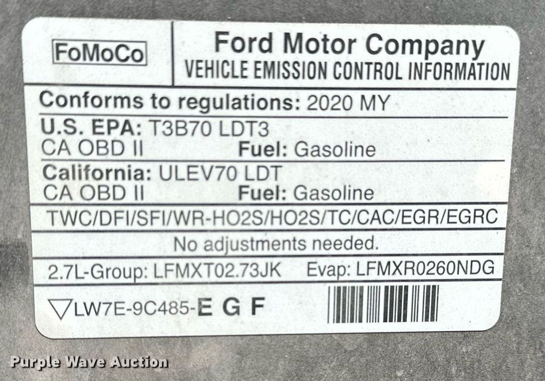 2020 Ford F150 SuperCrew pickup truck. Miles: 185,681 on odometer, VIN: 1FTEW1CP5LKE26245, Unit #: 103162. Engine Displacement: 2.7L V6 DOHC, Cylinders: 6, Fuel type: Gas. Transmission Automatic. Interior AC, Heat, Seat: Power driver, Power windows, Power locks, Cruise control, Backup camera. Tires Size: 265/60R18. Notes Dash warning indicator: TPMS, Windshield chipped or cracked, Tailgate issues, will not open. Oklahoma title. Title distribution may be delayed up to 30 days from verification of funds. Dolese Bros Co. 5600 West Reno Avenue. Oklahoma City, OK 73127