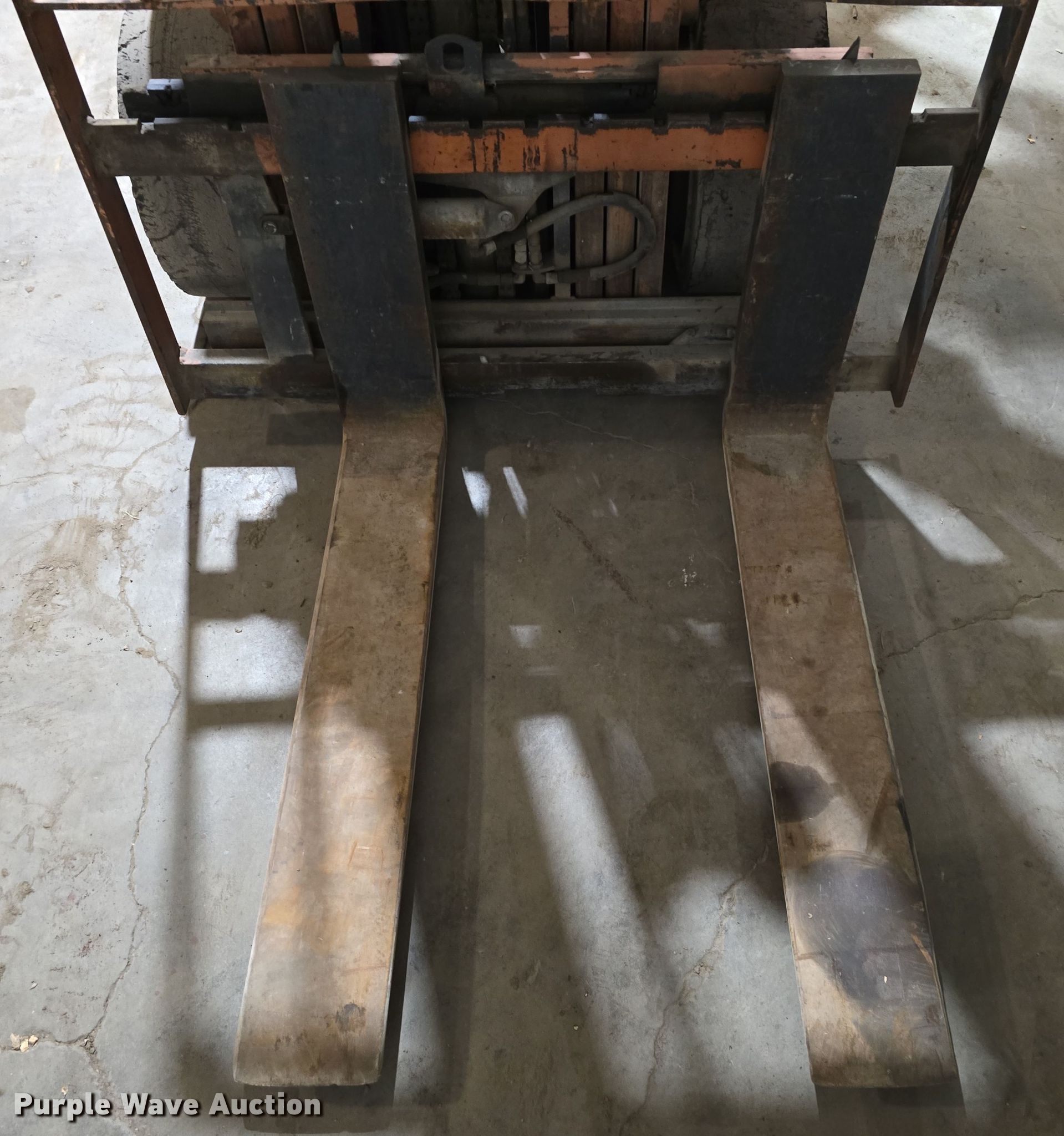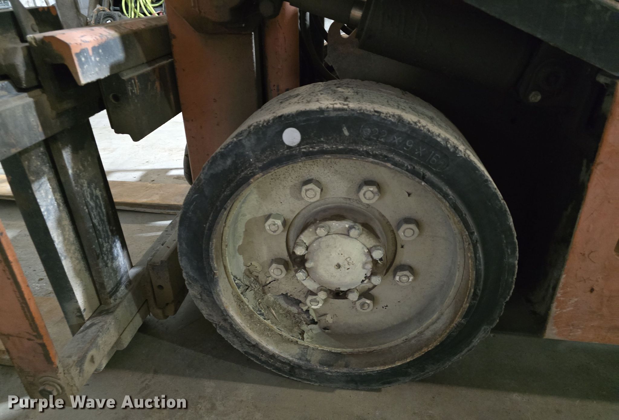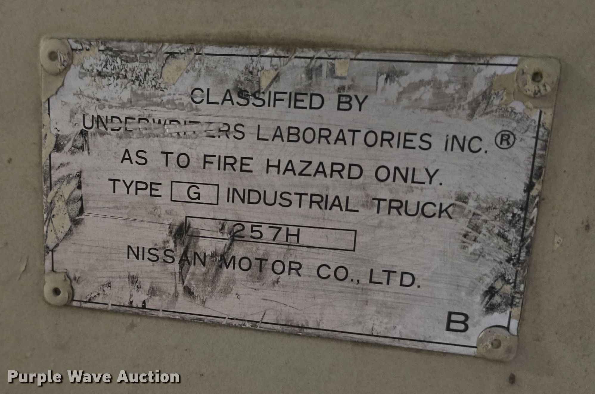 Nissan CEGH02F30V forklift. Hours: 7,446 on meter. Engine Nissan, Cylinders: 4, Fuel type: LPG LP bottle: Not included. Transmission Powershift. Operators station Canopy. Features Maximum lift capacity: 5,650 lbs, Maximum lift height: 183", Mast stages: 3, Side shift, Mast tilt, Fork length: 42". Tires Front: 22x9x16, Rear: 18x6x12.125, Solid. Council Bluffs, IA 51501
