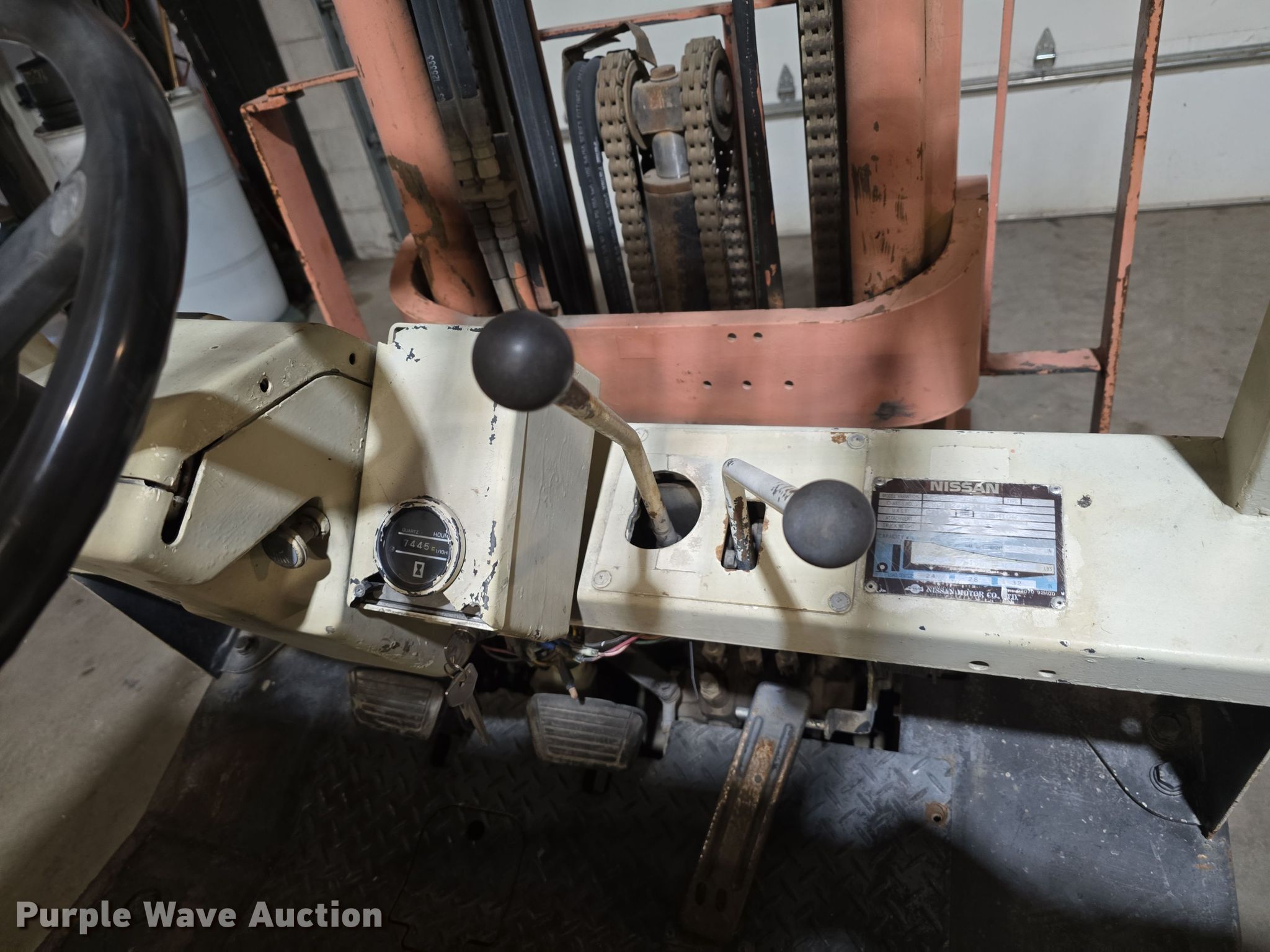Purple Wave is selling a used Warehouse Forklift in Iowa. This item is a Nissan CEGH02F30V forklift with the following: Hours: 7,446 on meter