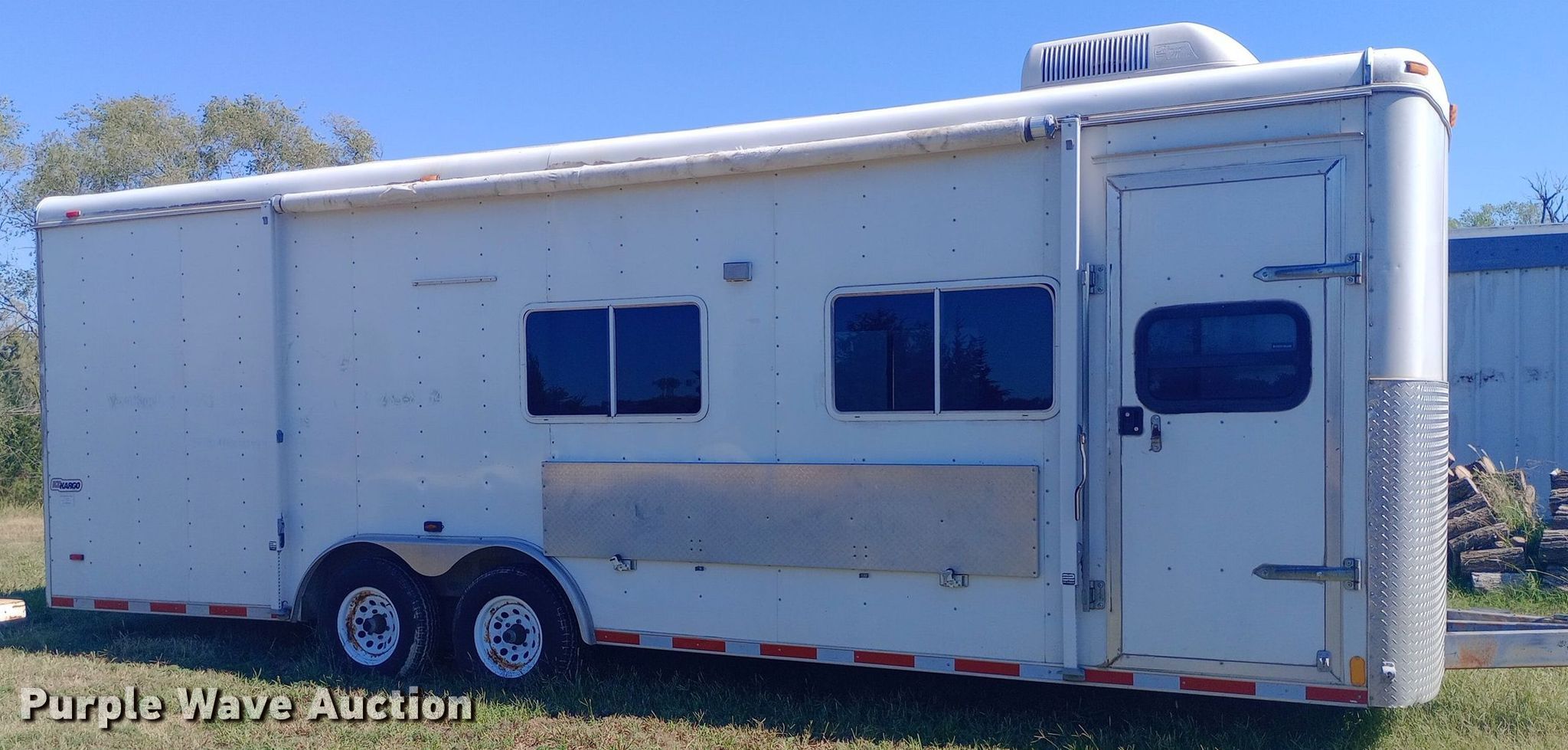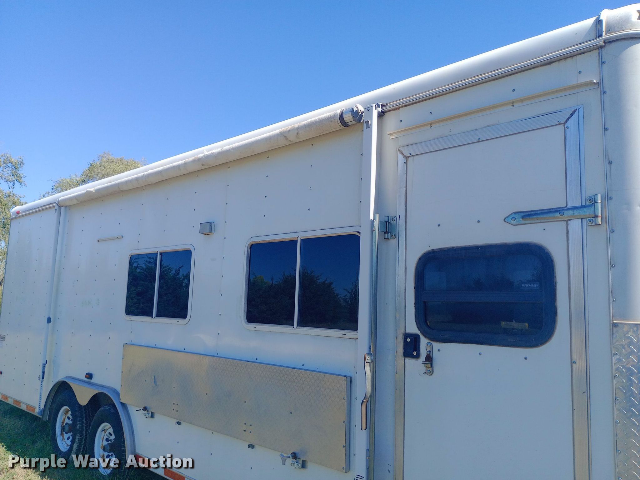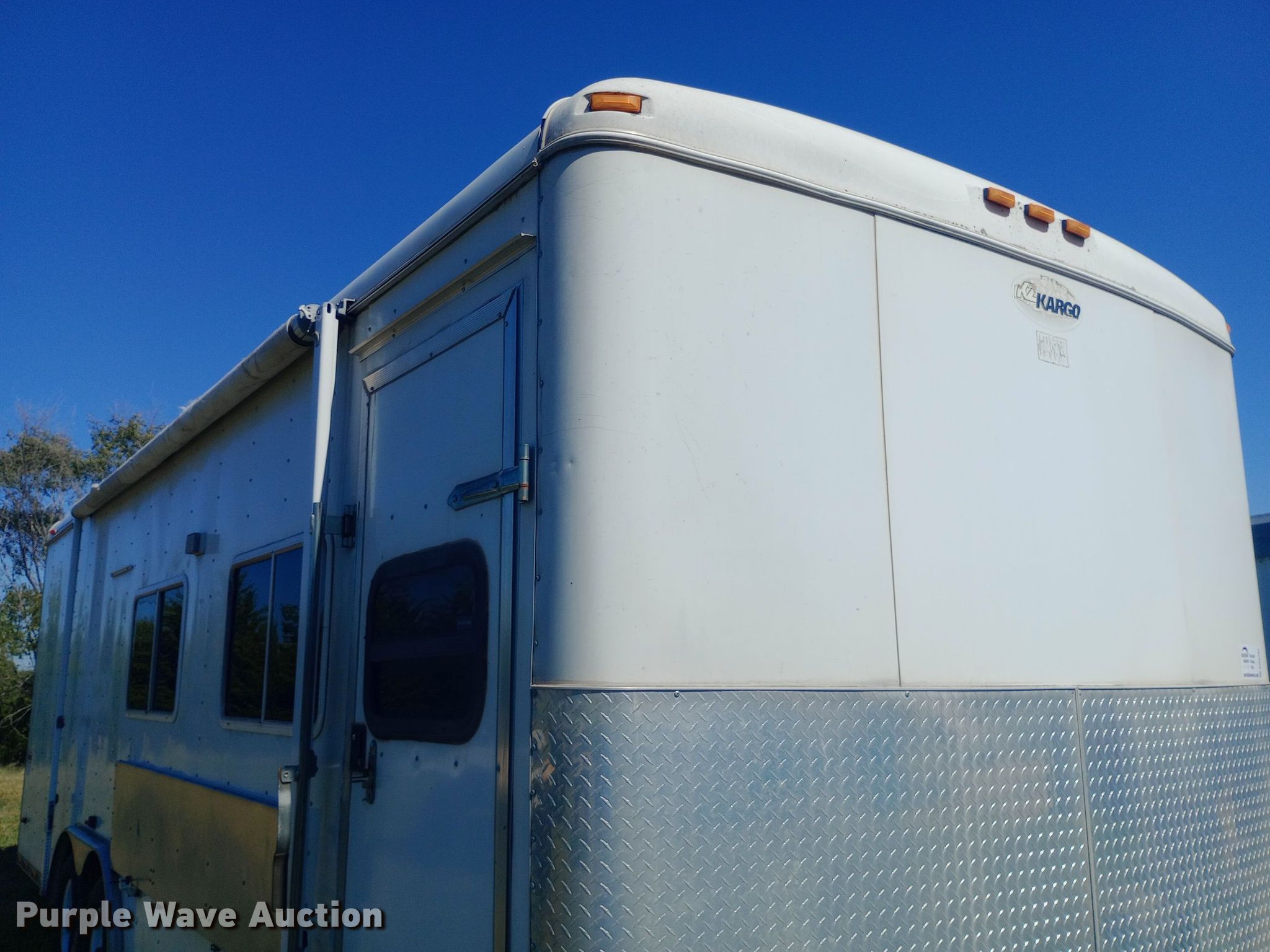 2004 KZ Kargo enclosed cargo trailer. VIN: 5JXCT24264S103144. Dimensions Overall: 27' 7" L x 102" W, Body: 24' 7" L x 95" W, Rear door / ramp 84" L x 89" W. Features Deck type: Wood, Cabinets, Storage rack, HVAC unit Coleman. Chassis Ball hitch: 2 5/16", Landing gear: Single, Suspension: Spring, Brakes: Electric, Axles: Tandem. Tires Steel wheels, Size: 225/75R15. Notes Awning damaged. Kansas title. Title distribution may be delayed up to 14 days from verification of funds. Auction Specialists Retirement. Newton, KS 67114