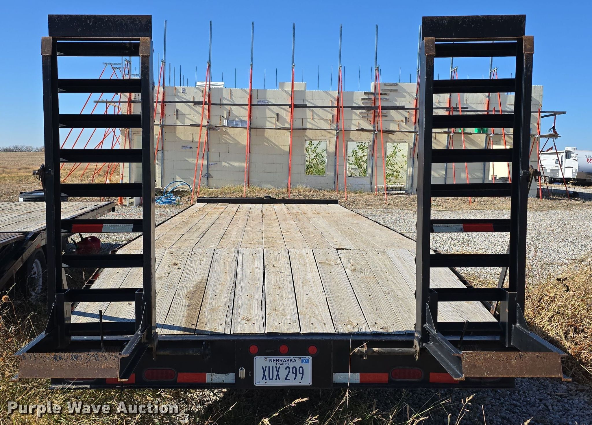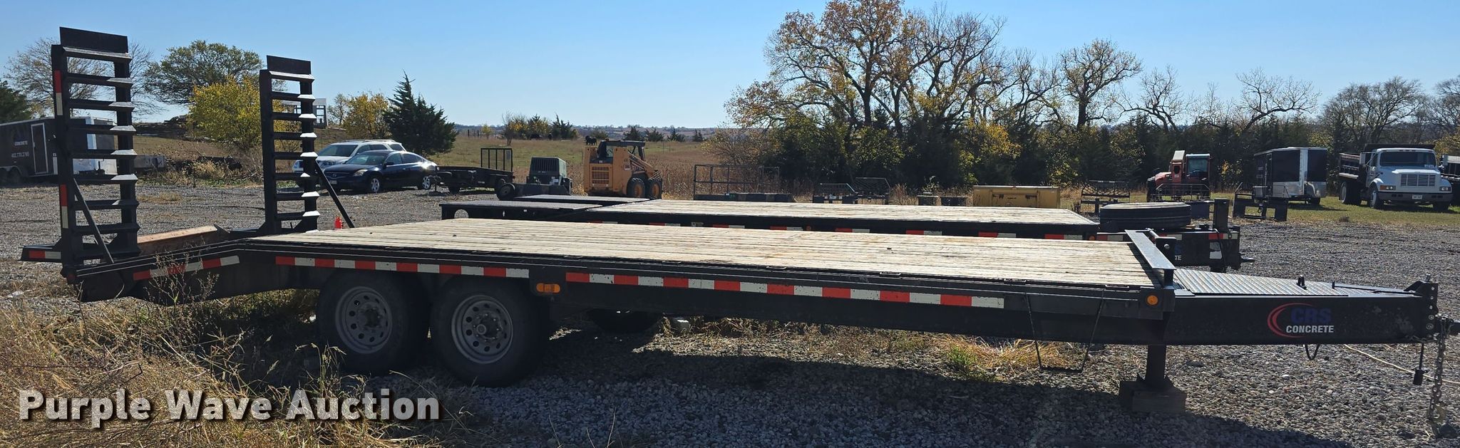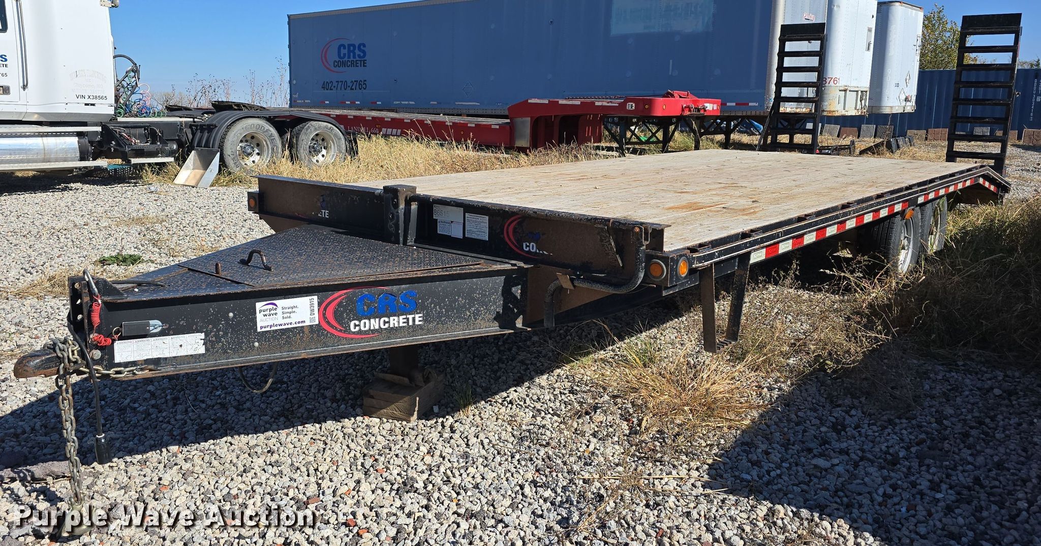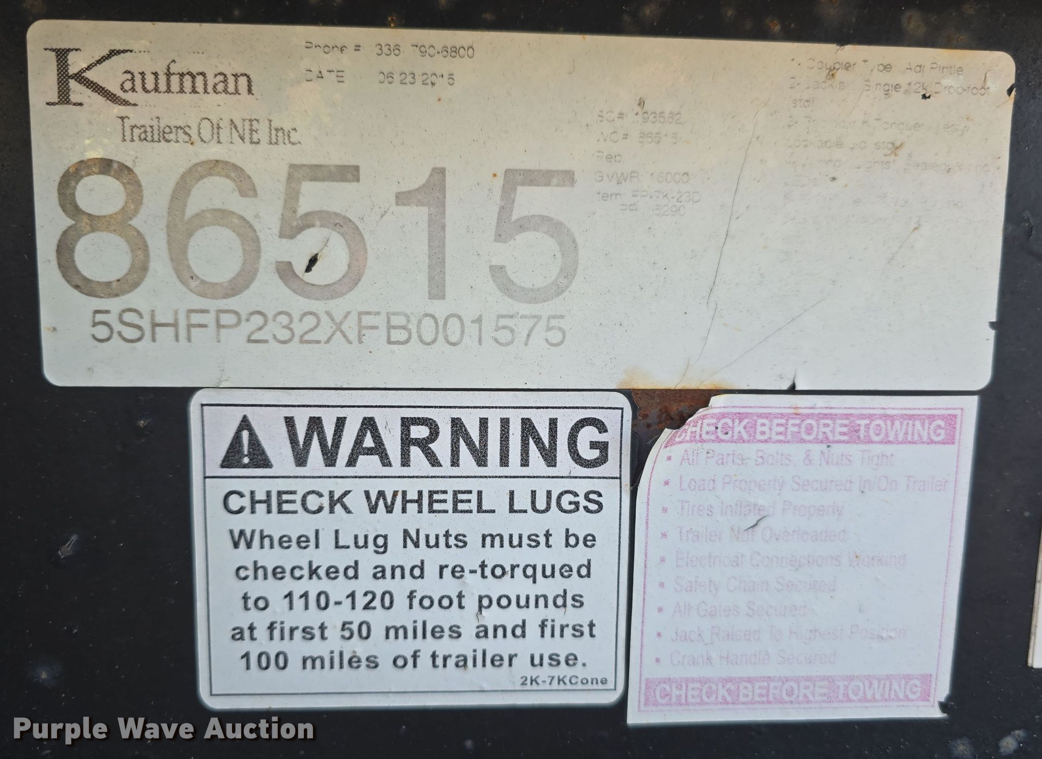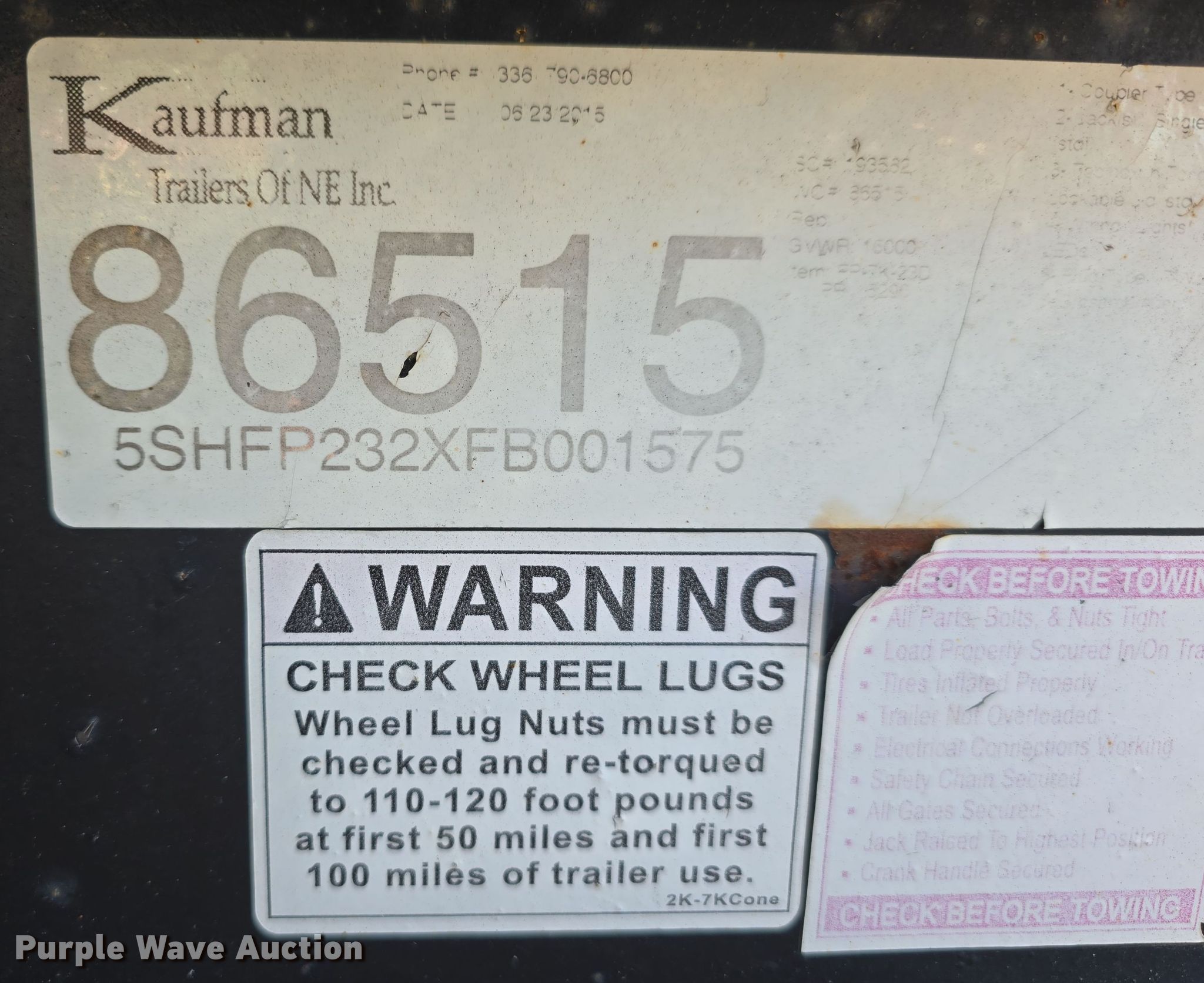 2015 Kaufman equipment trailer. VIN: 5SHFP232XFB001575. Dimensions Overall: 28' L x 102" W, Deck length: 18', Tail length: 5', Ramps: Manual Length: 66". Features Deck type: Wood. Chassis Ball hitch: 2 5/16", Landing gear: Single, Suspension: Spring, Brakes: Electric, Axles: Tandem, GVWR: 16,000 lbs, GAWR: 7,000 lbs. Tires Steel wheels, Size: 235/80R16. Nebraska title. Title distribution may be delayed up to 14 days from verification of funds. CRS Concrete. Denton, NE 68339